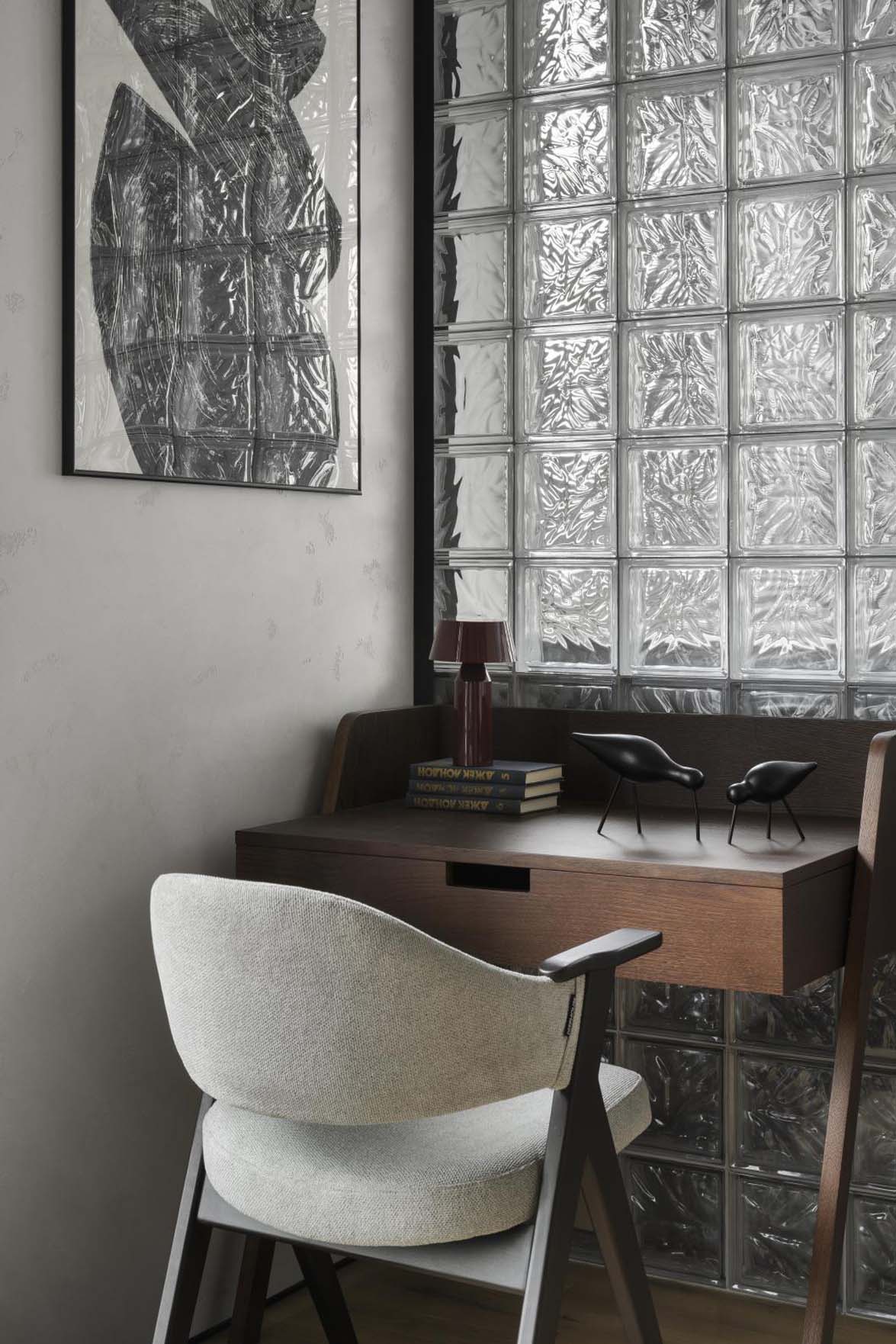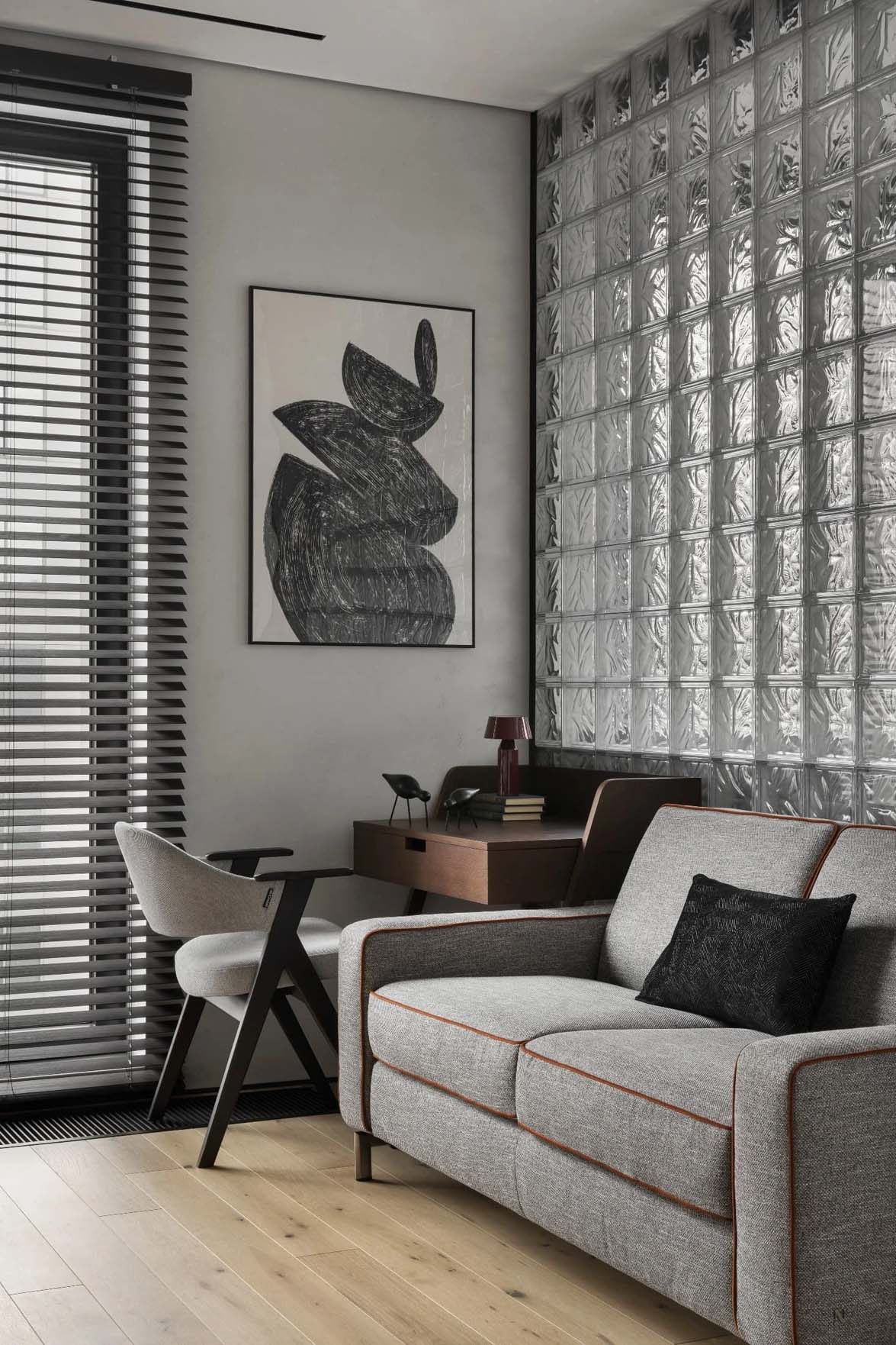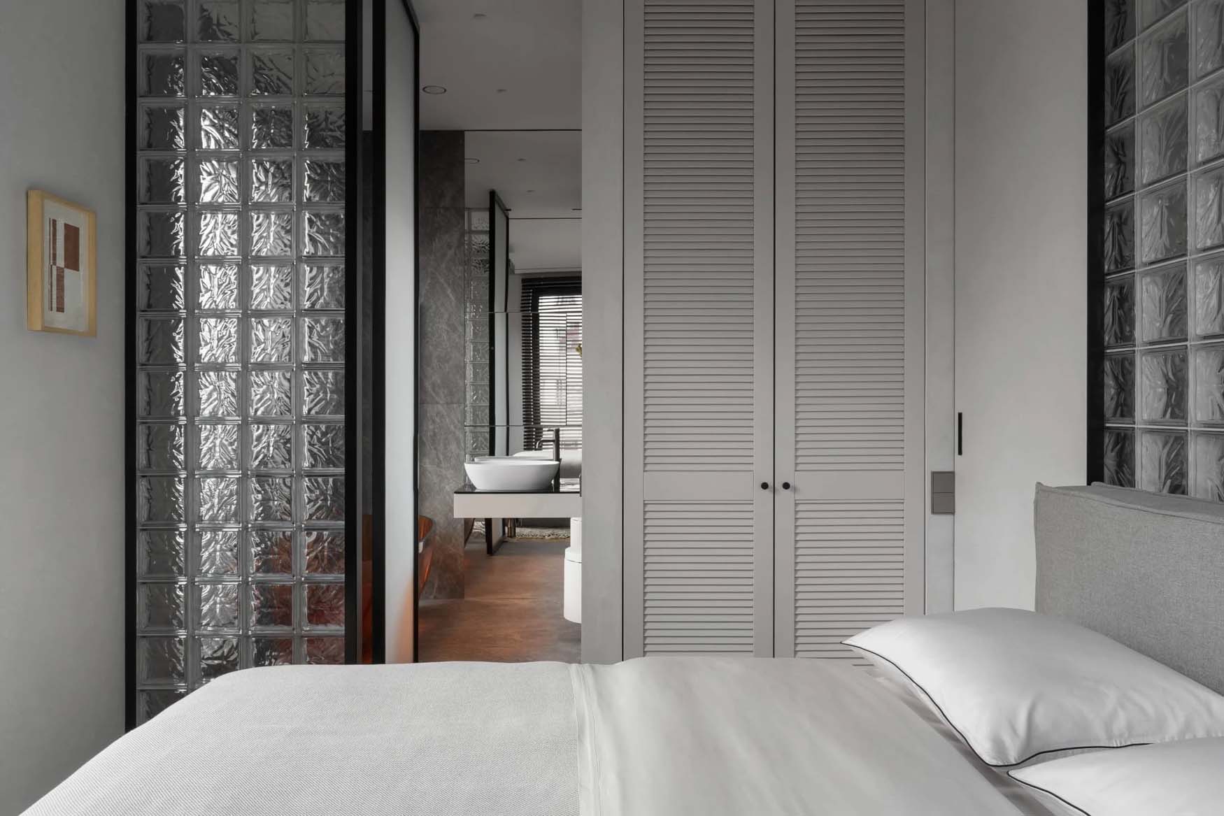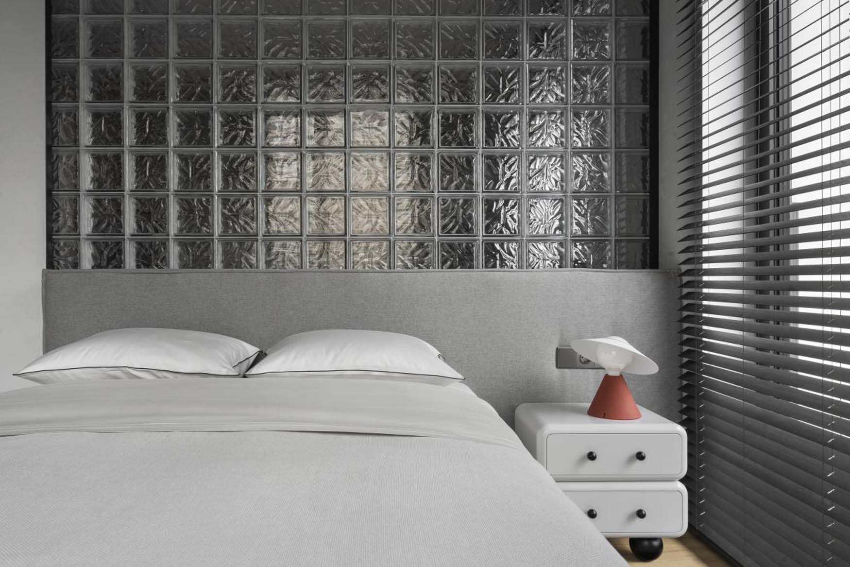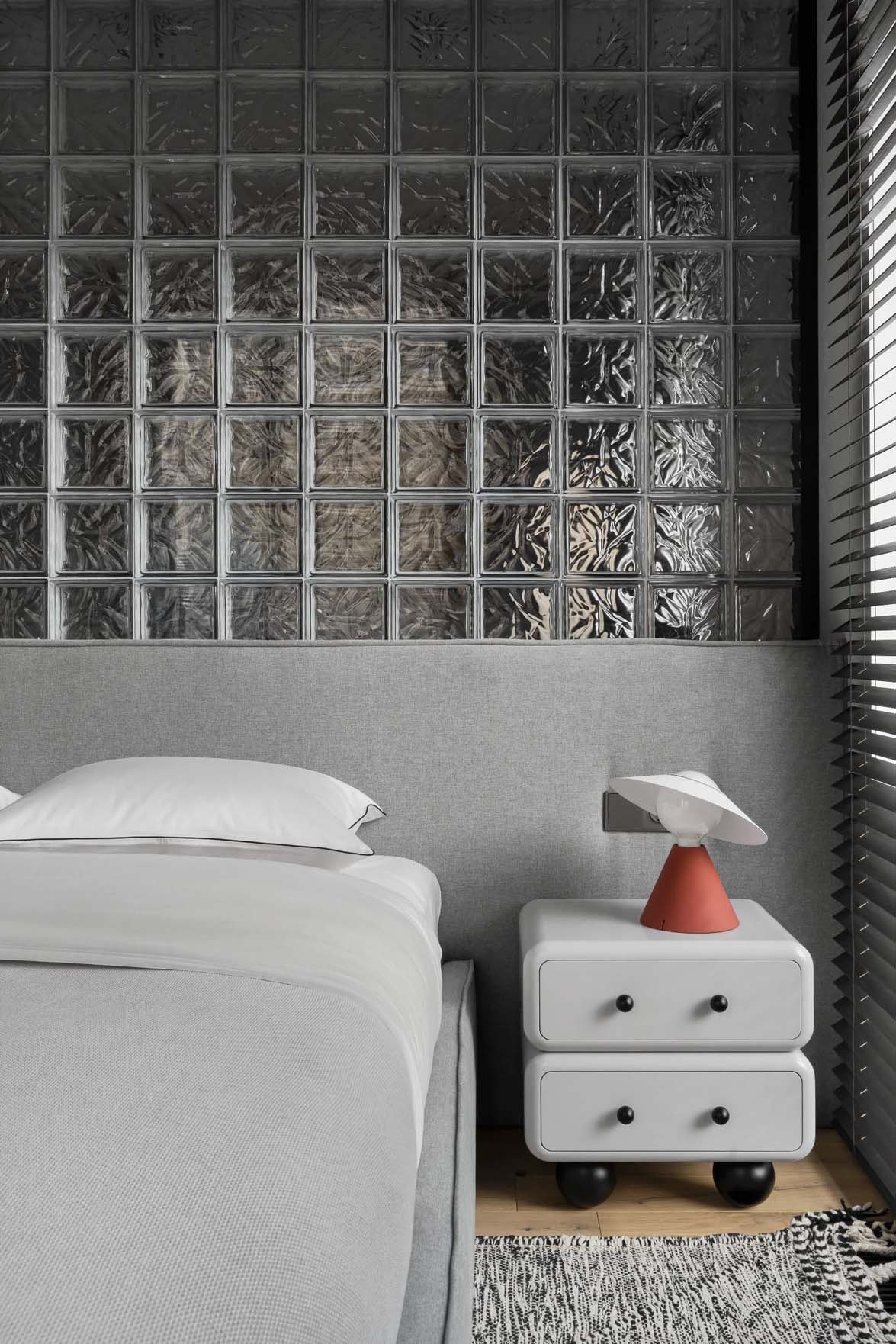 A hálószobában teljesedik ki az enteriőr vezérmotívuma, az üvegtégla, mely nemcsak az ágy mögötti falat adja, de a helyiséghez kapcsolódó fürdőszoba elválasztását is így oldották meg.. A texturált üveg sejtelmesen szűri a fényt, miközben intimitást biztosít. A berendezés a monokróm szürke árnyalataira épül, amelyet a puha kárpitok tesznek otthonossá. A zsalus ajtókkal ellátott gardróbszekrény és a játékos formavilágú éjjeliszekrény visznek egyedi karaktert a férfias hangulatú helyiségbe.