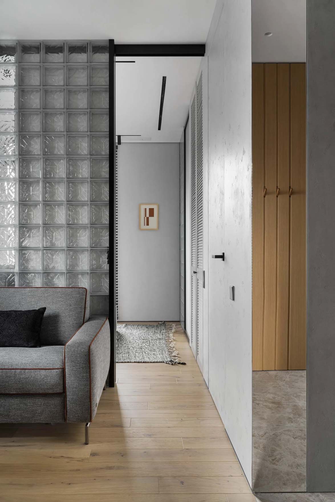 „A mindössze 45 négyzetméteres alapterület miatt a funkcionális zónákat ötletesen kellett kialakítani” – meséli a tervező. „A koncepció lényege az volt, hogy a teret nem tagoljuk masszív falakkal, inkább fényáteresztő üvegtégla válaszfalakat emeltünk. Ezek nemcsak vizuálisan növelik a teret, de az enteriőr egységes karakterét is erősítik. Az átadáskor az ingatlanban csupán a vizesblokkok helyét határozták meg előre felhúzott falakkal, amelyeket természetesen korrigálnunk kellett. A közlekedési útvonalak optimalizálása érdekében néhány átjárót áthelyeztünk. A lakás napfényesebb felét a nappali-konyha párosa és a hálószoba foglalja el, míg az apartman belső, ablaktalan traktusában a fürdőszoba, a gardrób és egy kompakt hammam (törökfürdő, száraz gőzfürdő) kapott helyet.”