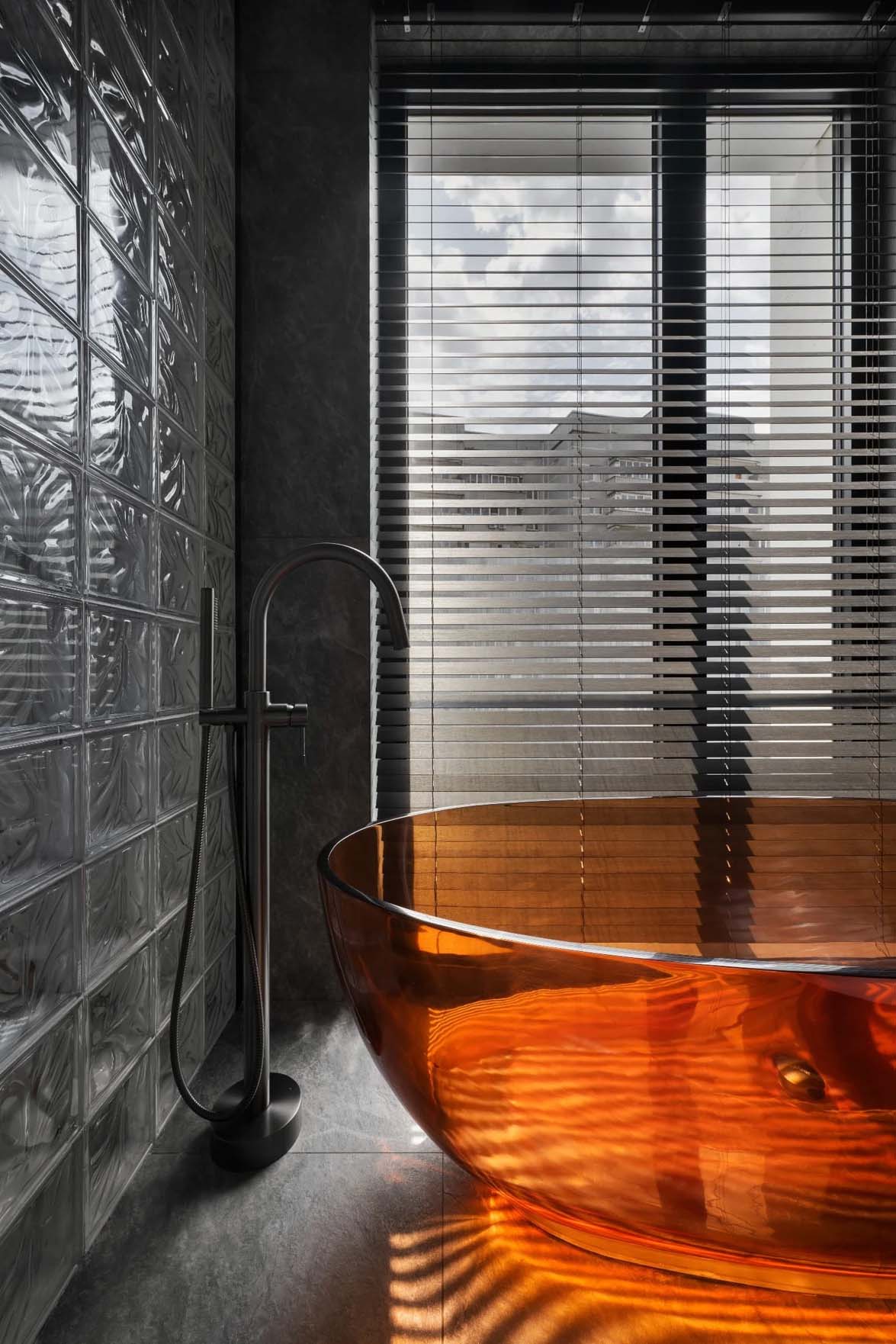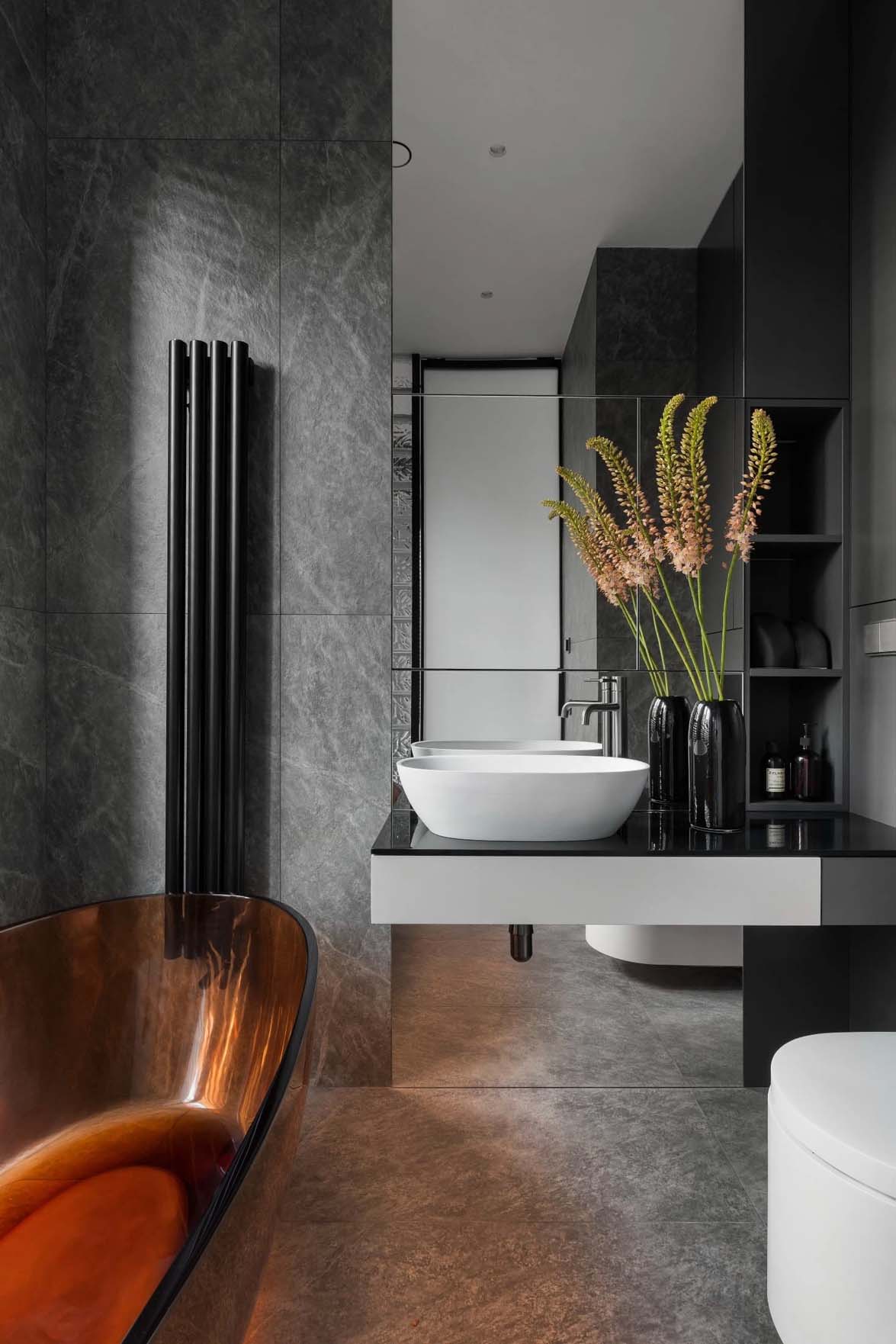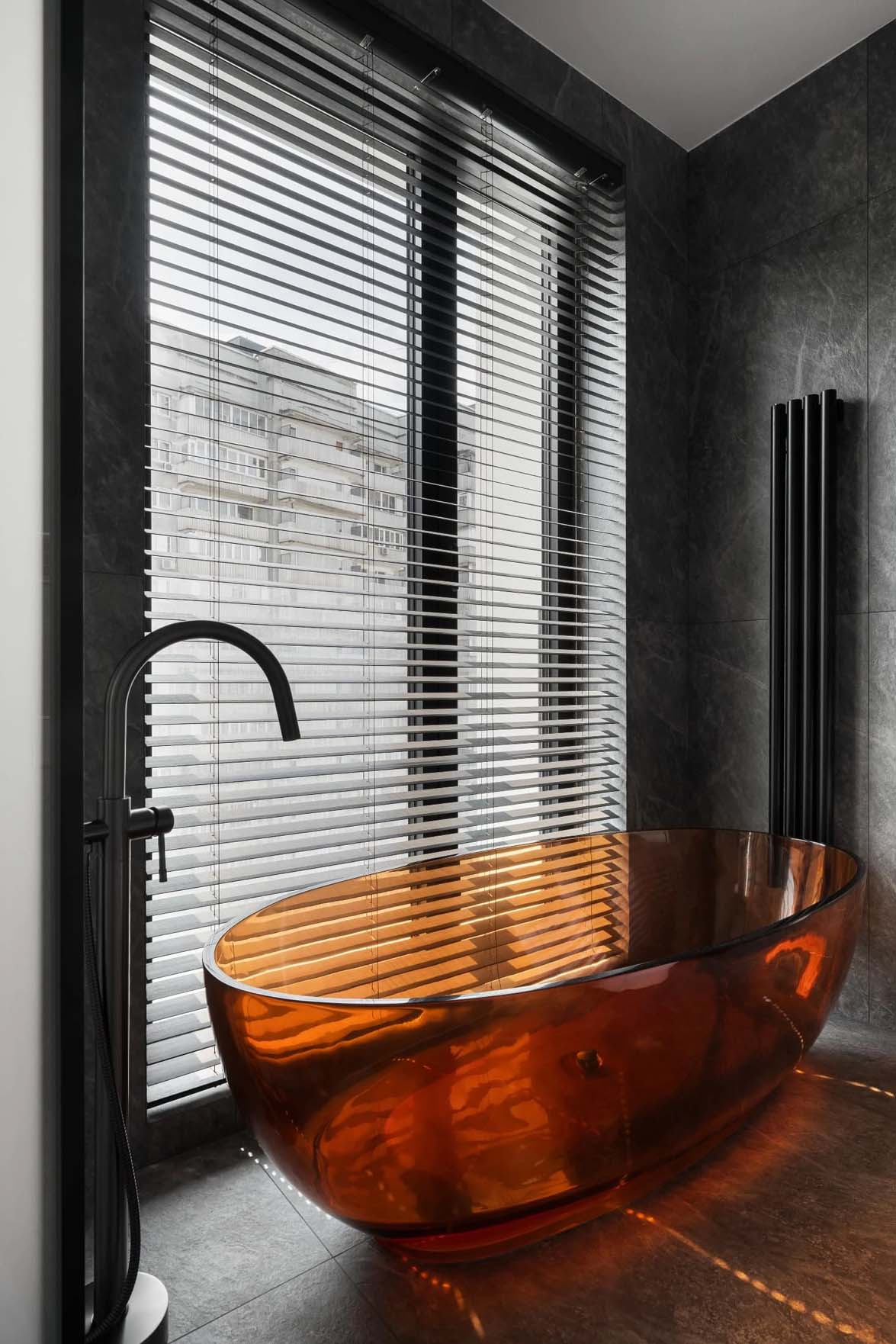 A hálószobából közvetlenül nyílik a fő fürdőszoba, amely drámai kontrasztot alkot a lakás többi részével. A sötét tónusú, nagyméretű, kőhatású burkolatok elegáns, barlangszerű atmoszférát teremtenek. Ennek a térnek a vitathatatlan fókuszpontja a borostyánszínű, áttetsző anyagból készült, szabadon álló kád, amely szinte ékszerként ragyog a sötét háttér előtt. A fekete szaniterek és a minimalista, lebegő mosdópult tovább erősítik a modern esztétikát.
