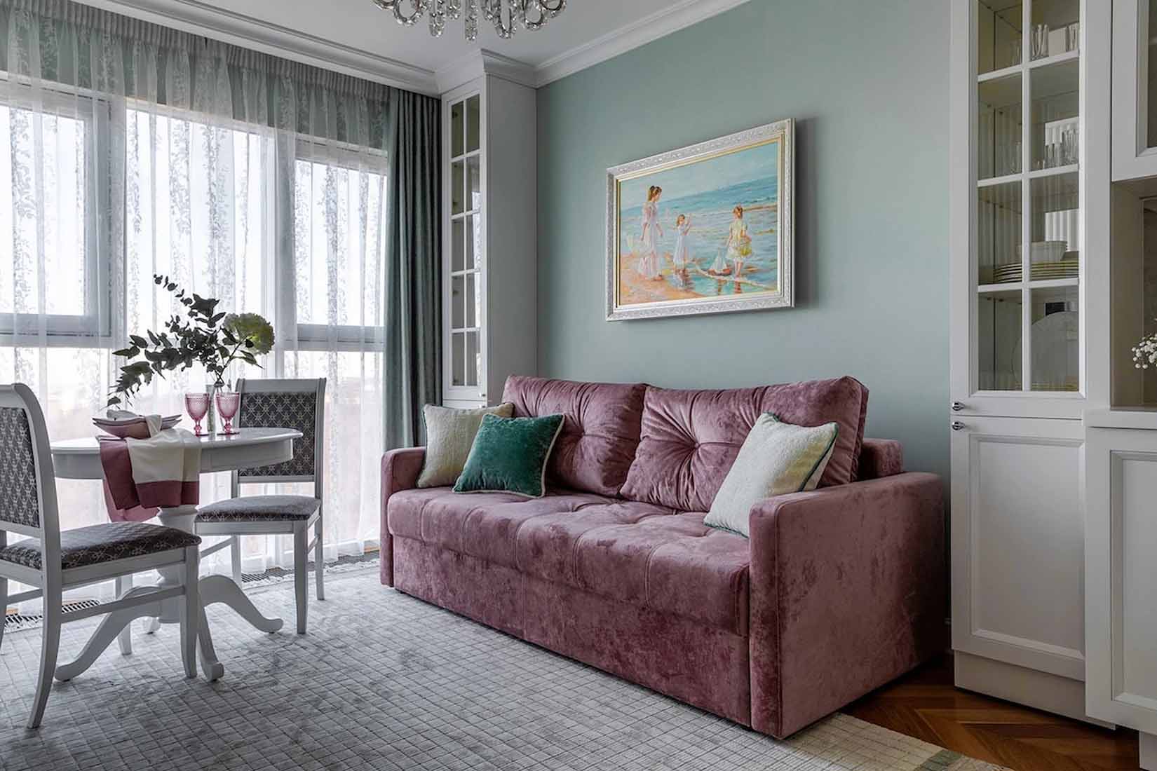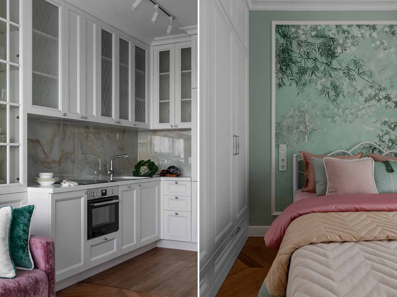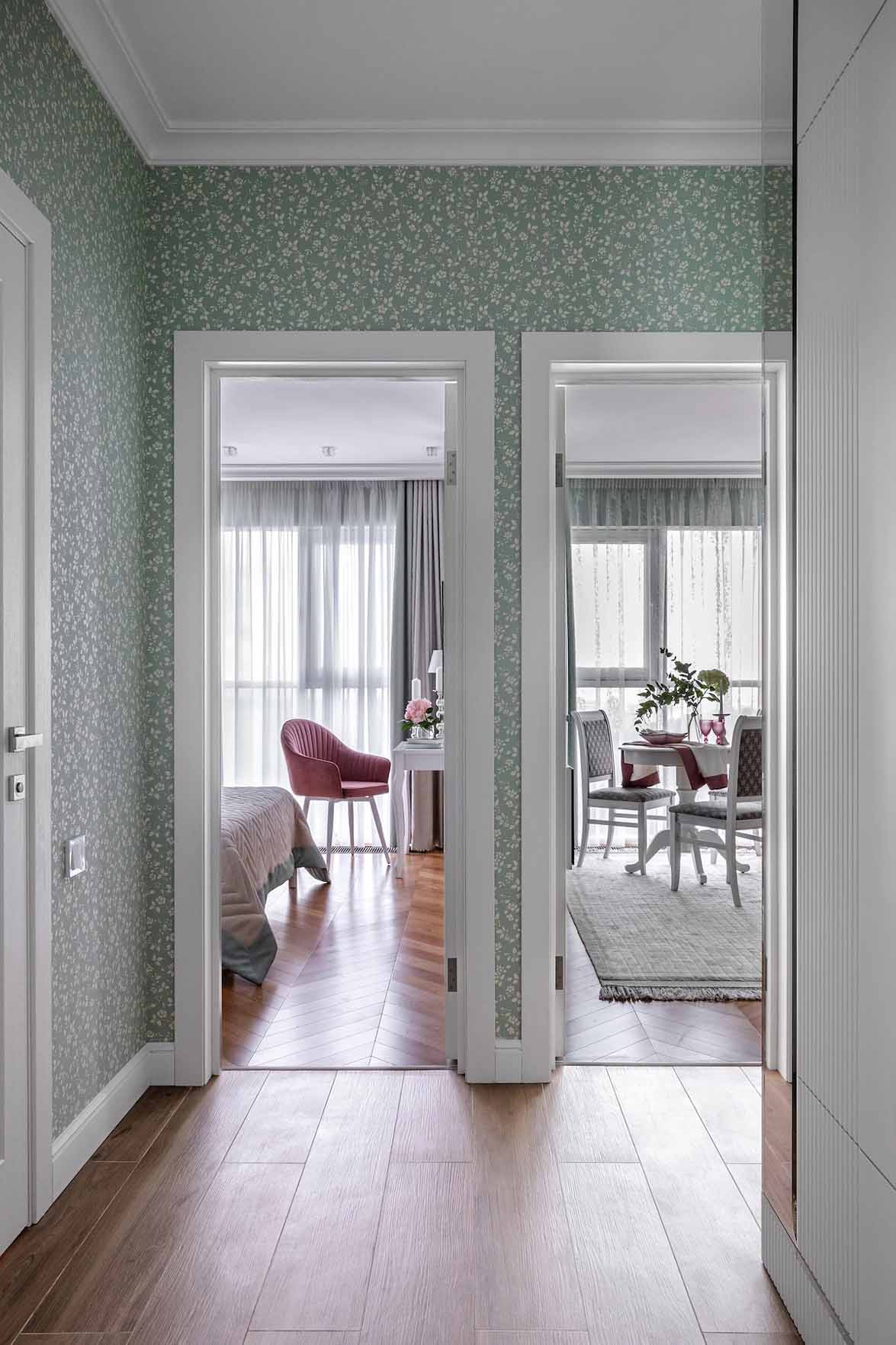 A tervezés alapkoncepcióját a „modern klasszikus” stílus határozta meg, amelyet szimmetrikus kompozíciók, természetes anyaghasználat és nemes pasztell árnyalatok jellemeznek. A cél egy olyan kényelmes otthon kialakítása volt, amely egyszerre biztosítja a pihenéshez szükséges nyugalmat és a mindennapi élethez elengedhetetlen praktikumot. A lakás vizuális egységét a frissülést hozó menta árnyalatok, a gipszstukkók, a díszlécek és a kristály függőkkel díszített csillárok adják meg, miközben a minden helyiségben megjelenő tükrök tágítják az optikai határokat.