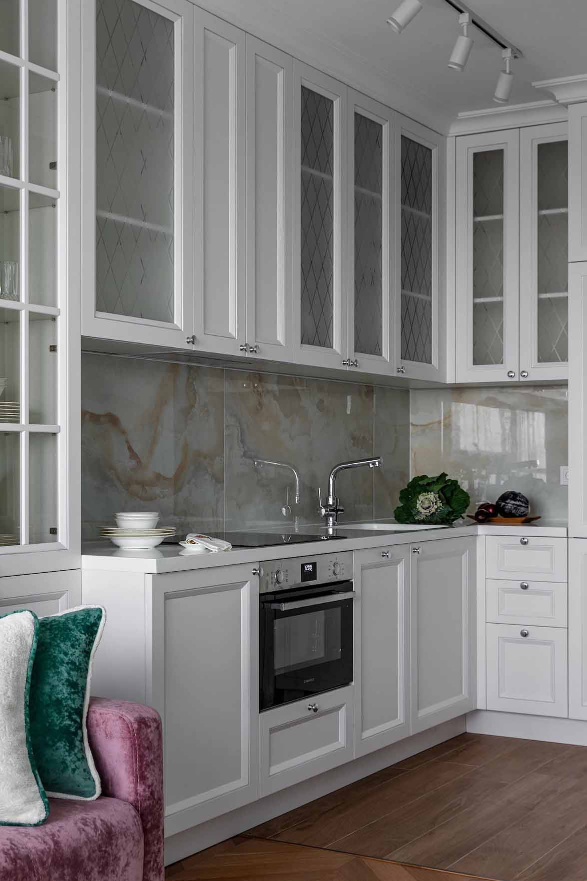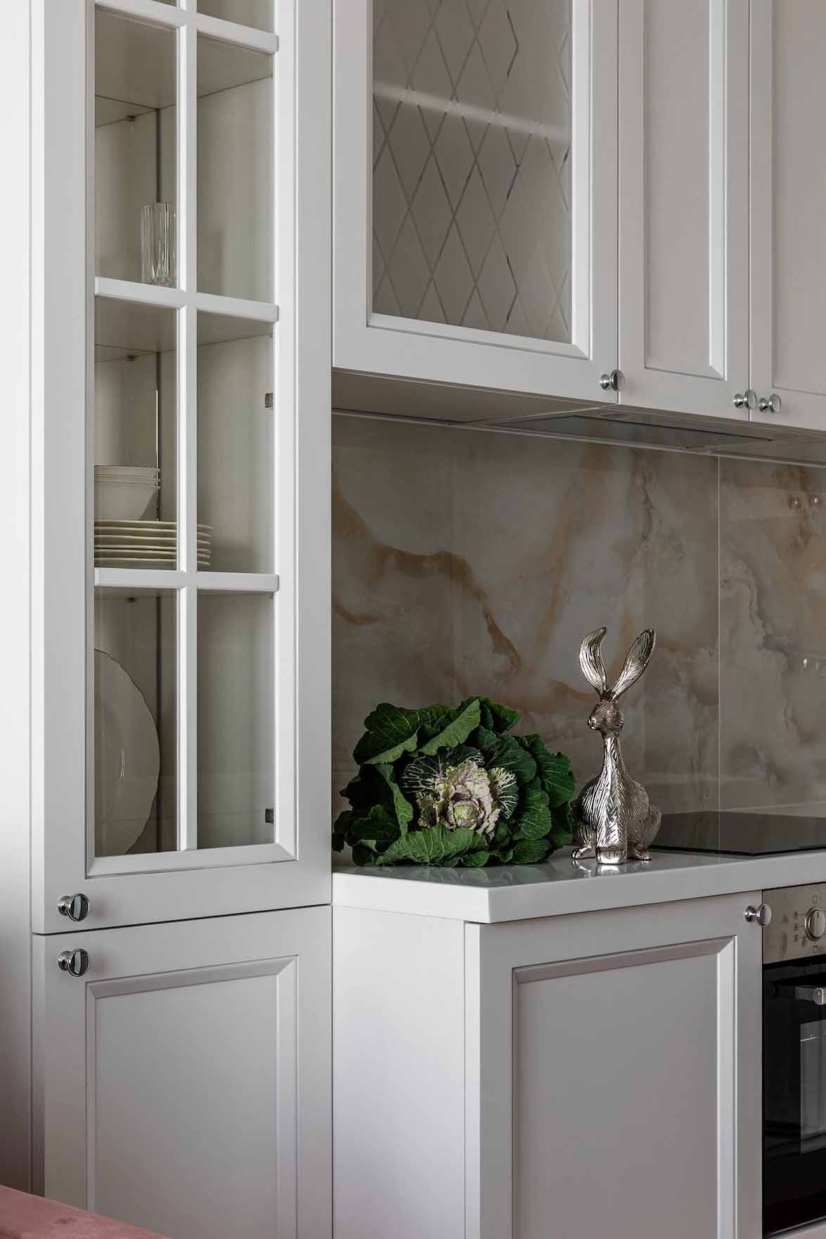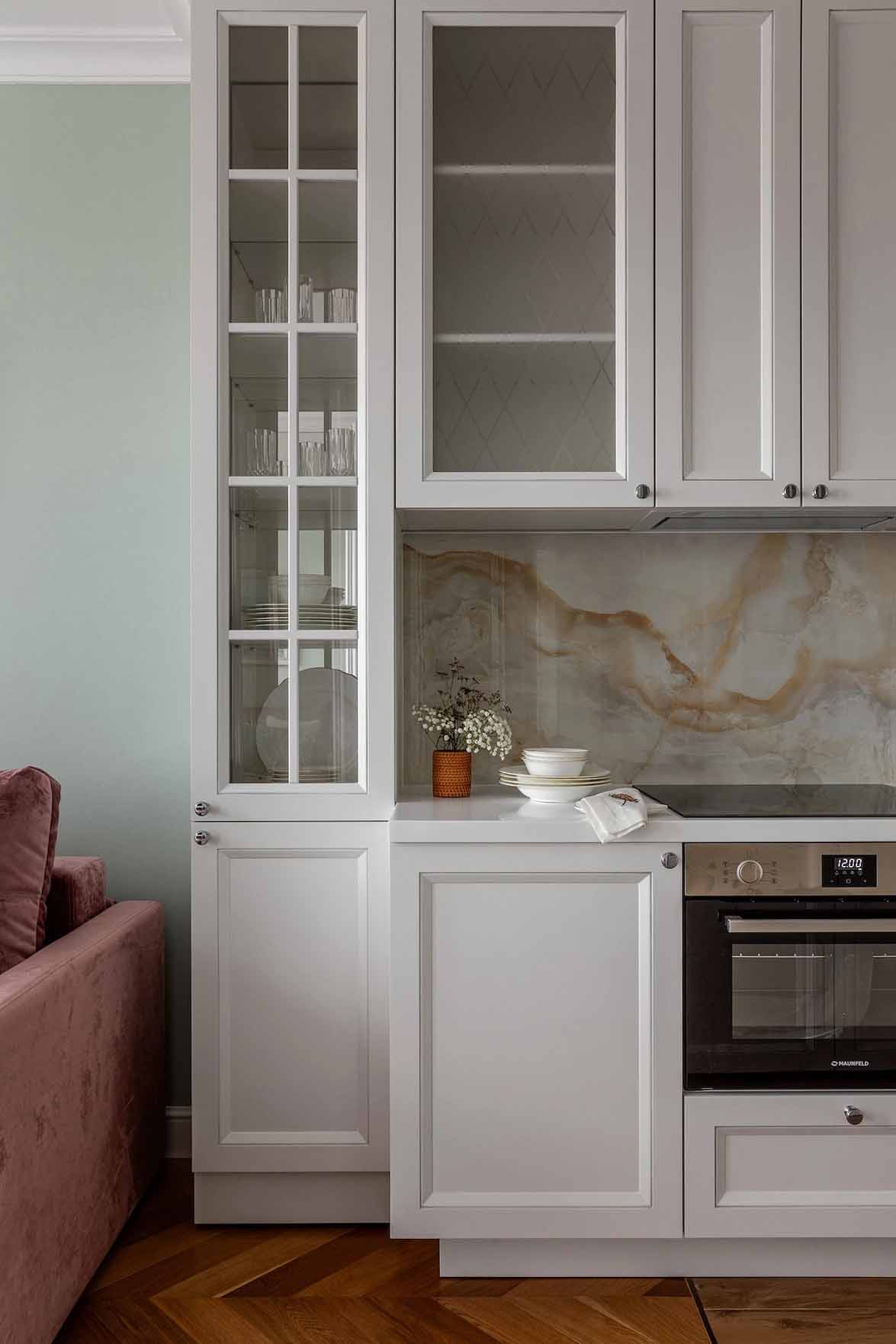 A konyhában egy elegáns, L-alakú konyhabútor kapott helyet, amelybe minden modern háztartási gépet – hűtőszekrényt, sütőt és mosogatógépet – integráltak. A felső szekrények egy része klasszikus, osztott üvegezést kapott, amely légiessé teszi a bútort. A munkalappal szemközti falon egy tükörpanel növeli a térérzetet, visszaverve a fényt. A konyha végében egy sekély, üvegezett vitrin szolgál a díszesebb edények tárolására. A konyhai világítást a technikai sínes lámpák és a klasszikus mennyezeti világítás kombinációja adja, biztosítva a megfelelő fényerőt a munkavégzéshez.