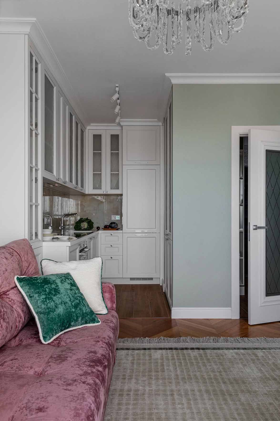 .A minimalizmustól távol álló, finom eleganciát sugárzó enteriőrt alkotott a lakberendező, és bizonyította, hogy a kis alapterület sem akadálya a klasszikus stílusjegyek alkalmazásának. Ebben a hölgy ügyfélnek berendezett, mindössze 37 m²-es lakásban a tervező a modern klasszikus stílus eszköztárával teremtett pihentető, szellős és visszafogott luxusérzetet keltő környezetet.