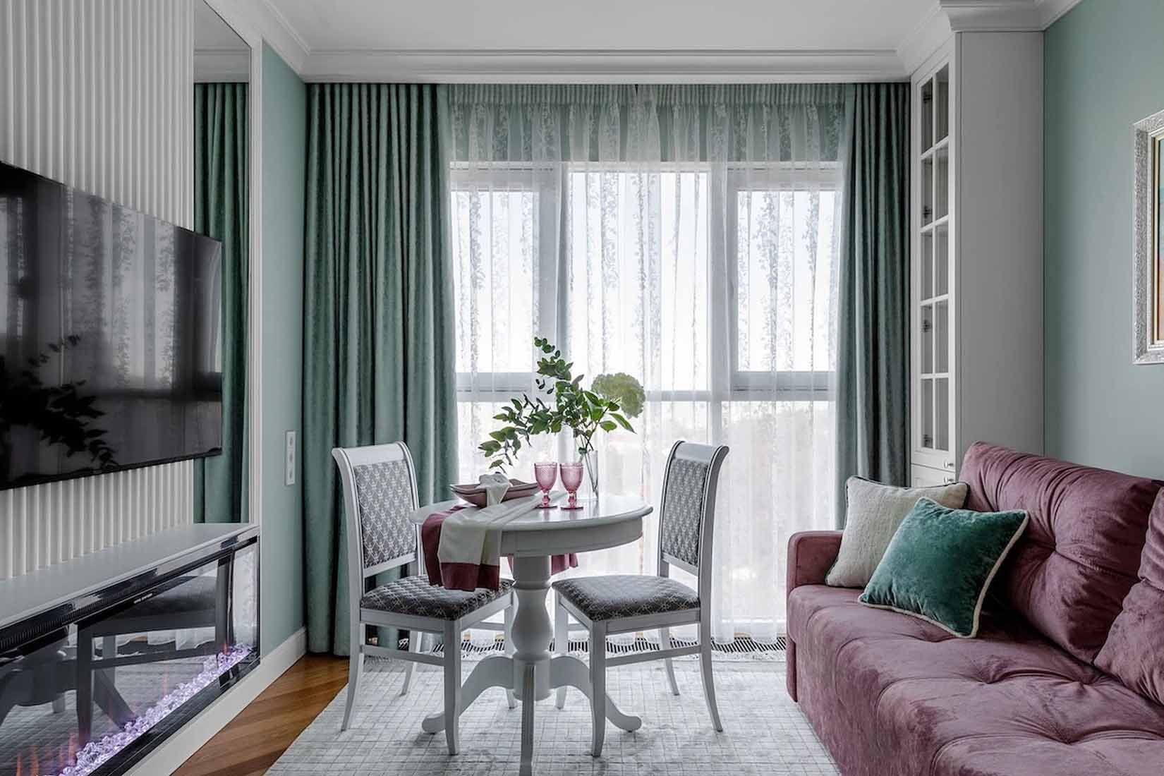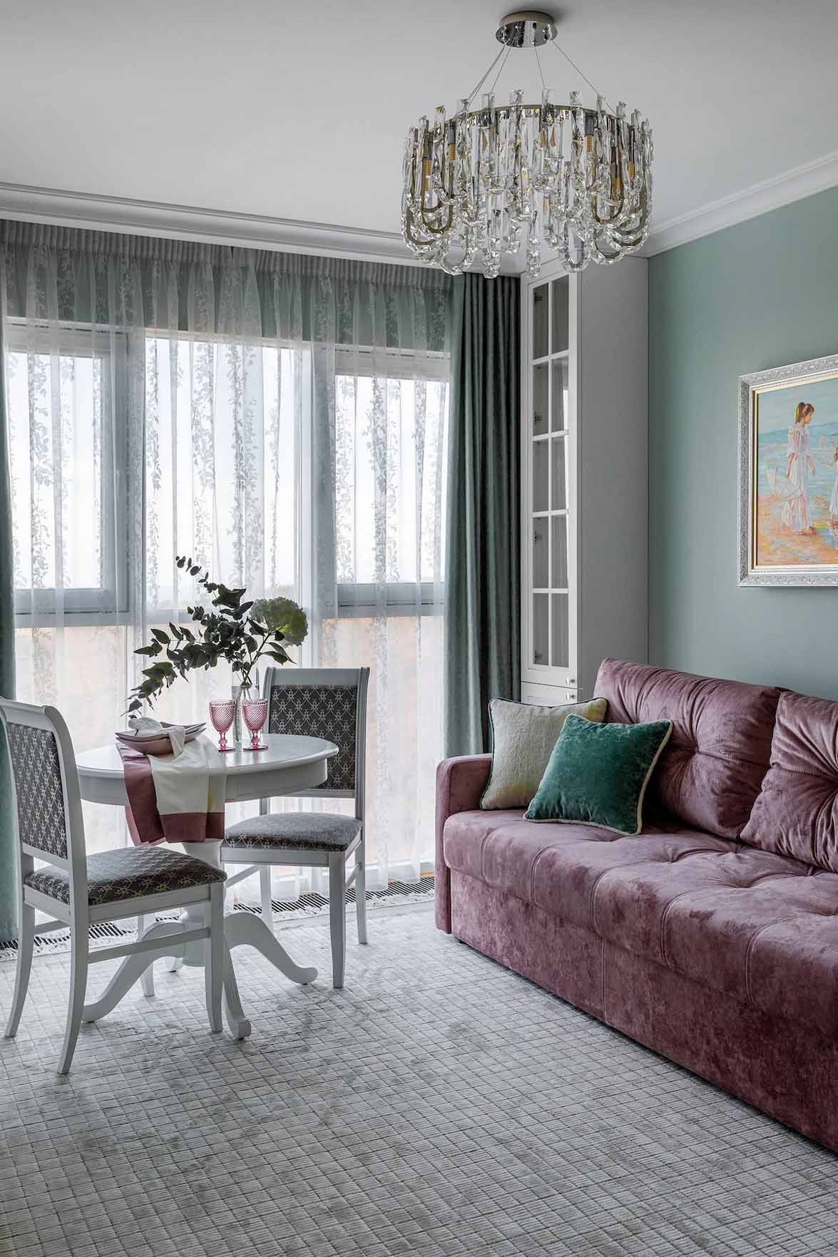 A nappali zónában a falakat menta színűre festették, amelyet fehér, dekoratív gipszpanelekkel törtek meg a klasszikus hatás érdekében. A padlón francia halszálka mintás fa padló fut végig, ami melegséget ad a térnek. A kényelmet egy vendégággyá alakítható kanapé szolgálja, amely mellett az ablaknál egy újabb elegáns vitrin kapott helyet. A televíziós zónában egy kandallót is elhelyeztek, amely télen kiegészítő hőforrásként és hangulati elemként is funkcionál. A világításról központi kristálycsillár és rejtett spotlámpák gondoskodnak, a TV környezetét pedig tükörbetétek díszítik.
