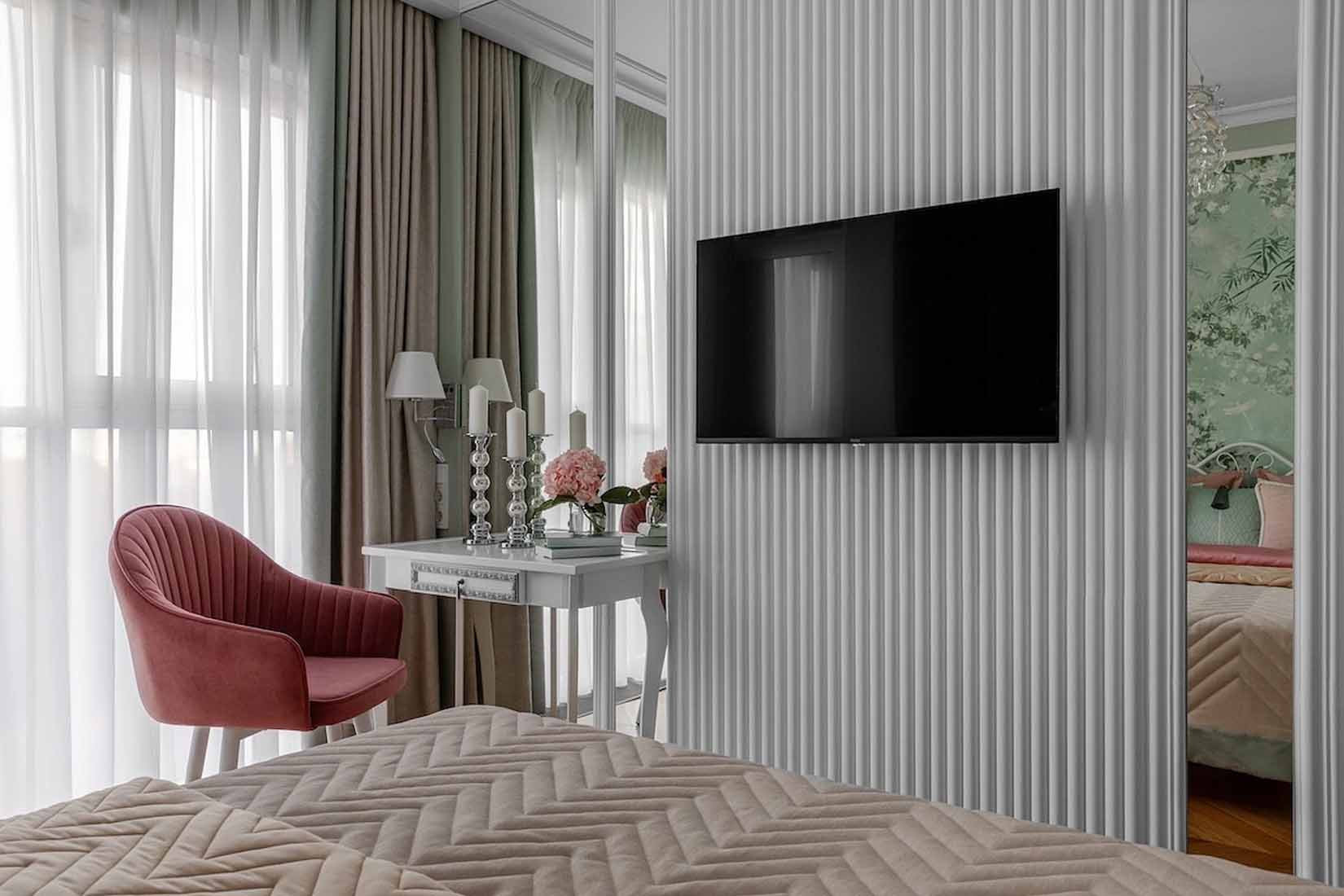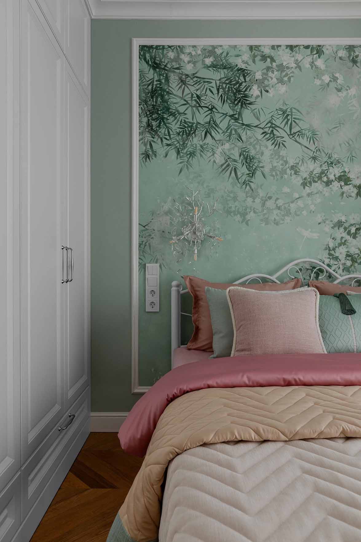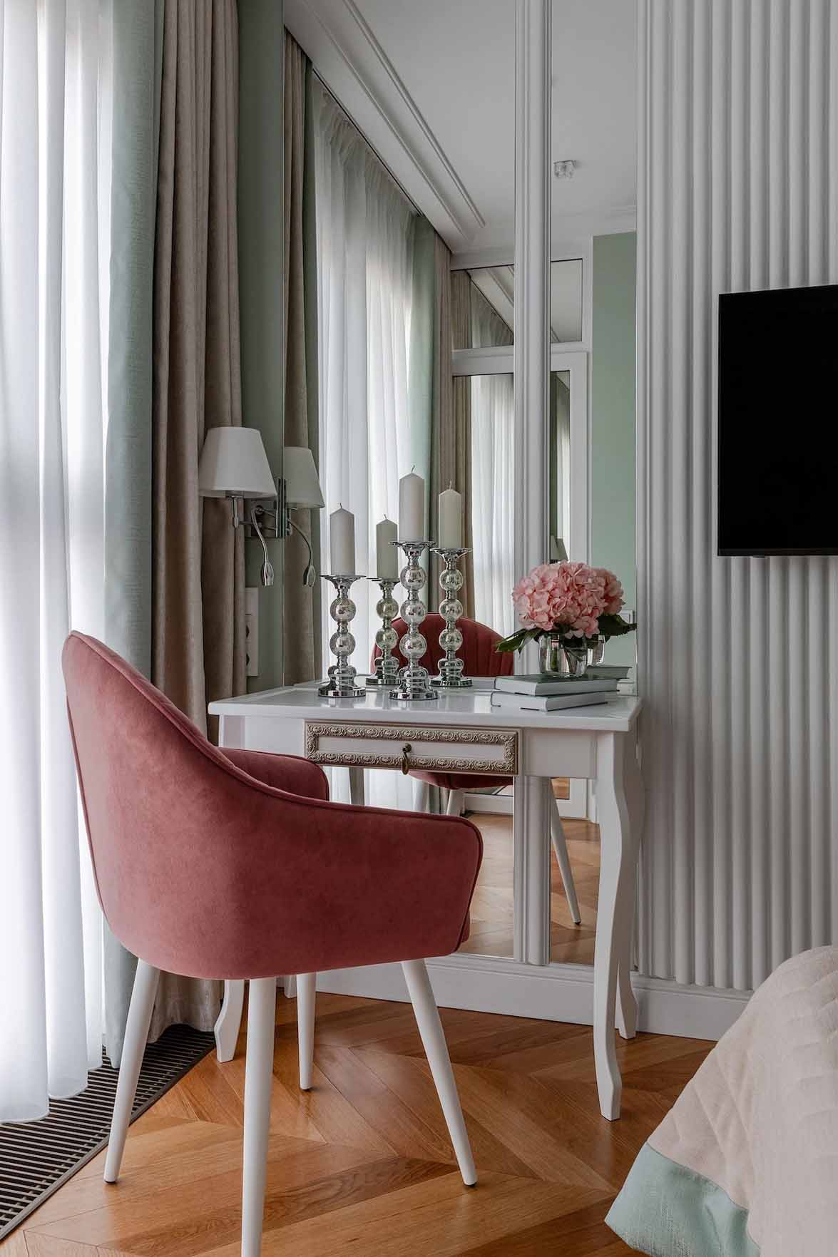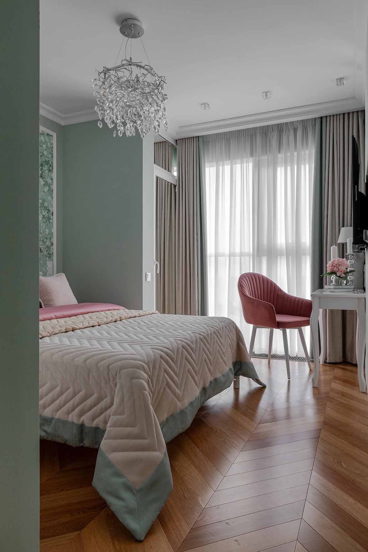 A hálószobában a menta falakat a franciaágy fejtámlájánál díszlécekkel keretezett panelek dekorálják. A tárolást egy diszkrét, beépített szekrény oldja meg, az ágyal szemközt pedig egy kecses fésülködőasztal kapott helyet, amely fölött egy asztali lámpa és fali karok biztosítanak helyi világítást. Különleges megoldás a technikai helyiség bejáratának elrejtése: az ajtót teljes felületű tükörrel borították be, így az funkcionálisan és esztétikailag is beleolvad a környezetbe. Az ágy két oldalán elhelyezett tükörpanelek tovább fokozzák a luxus érzetét.