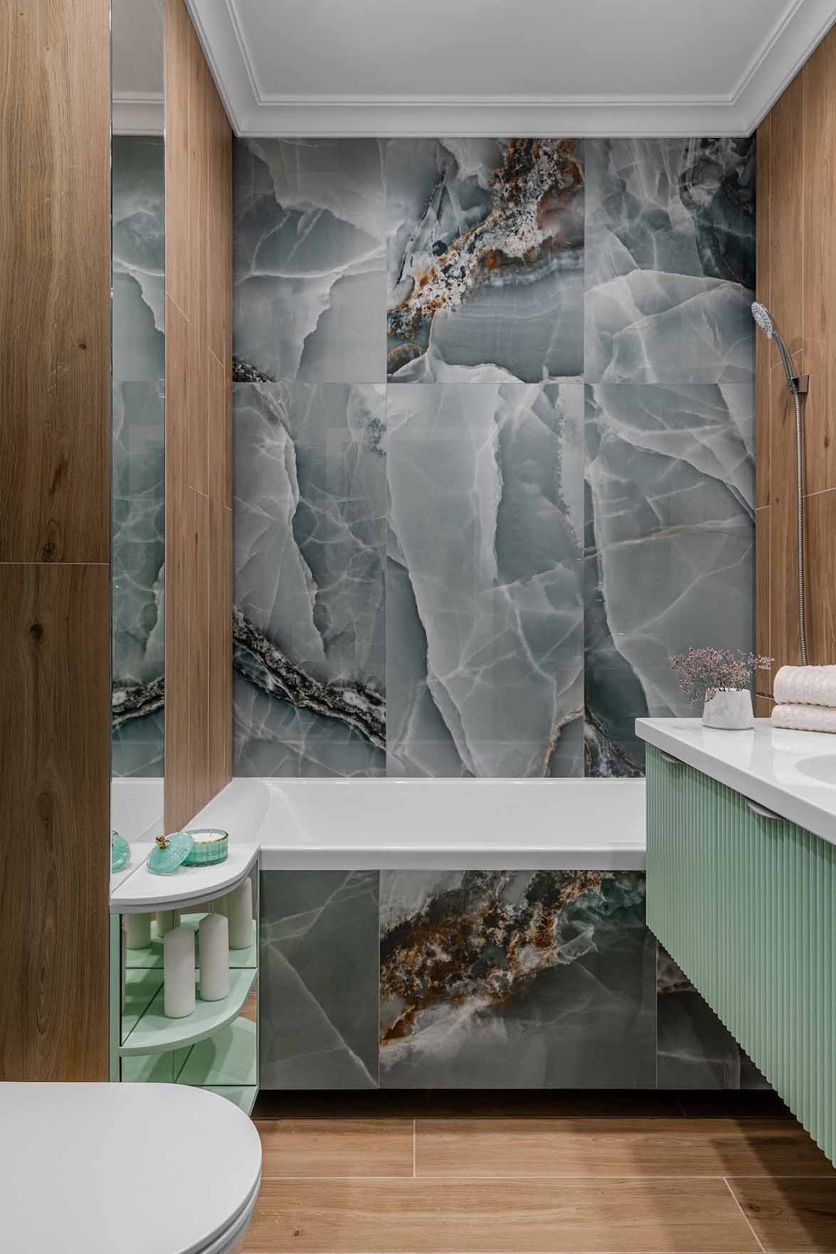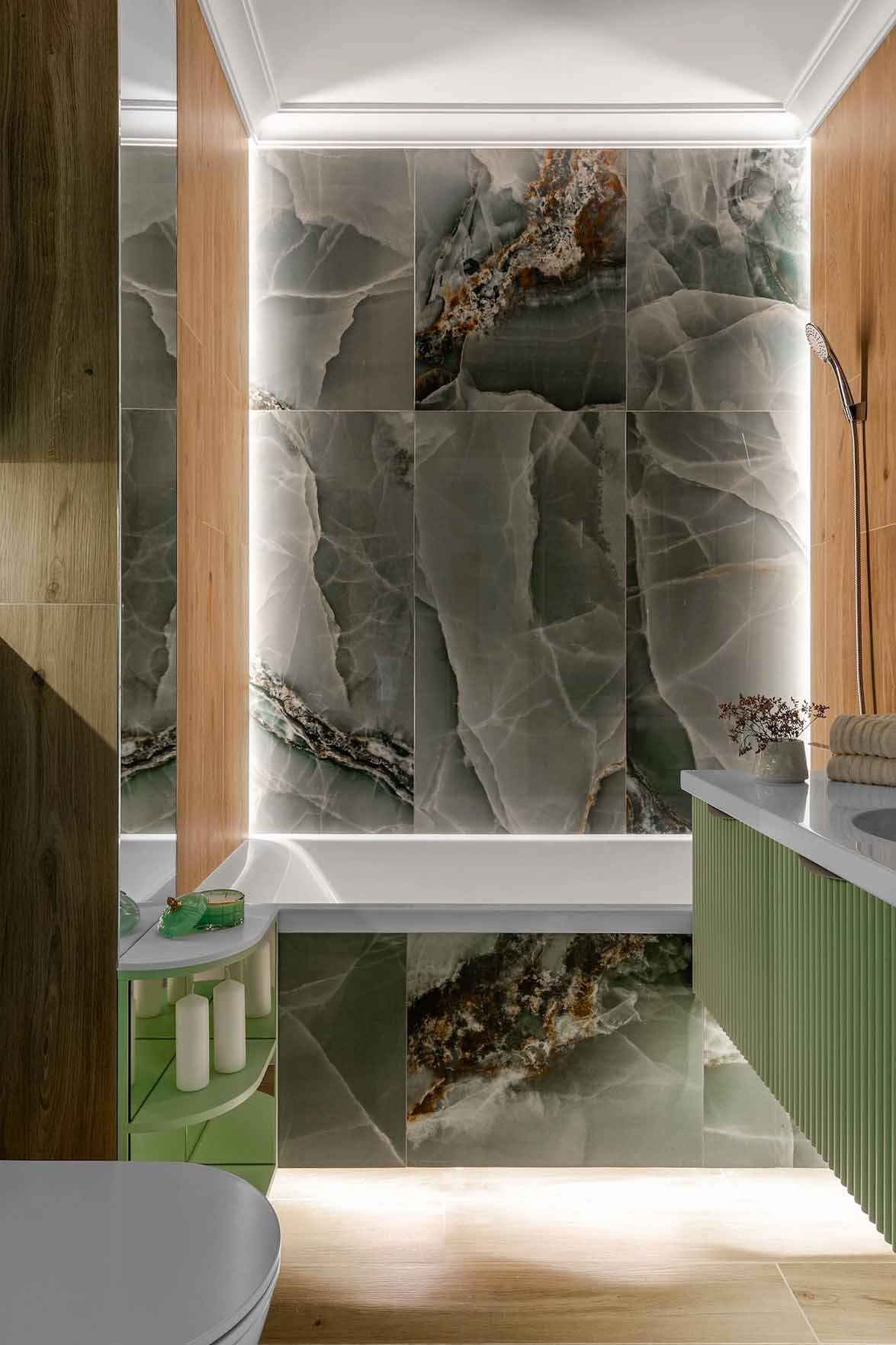 A fürdőszobában a burkolatok játéka dominál: a kád és a mosdó környezetében zöldes árnyalatú, látványos ónix-utánzatú kerámiát használtak, míg a többi falfelületet és a padlót fa hatású burkolat borítja. A tárolást a mosdó alatti szekrény, valamint a vécétartály fölötti beépített szekrény biztosítja, amely elrejti a vízmelegítőt is. A kád mellett egy lekerekített szélű, nyitott polcos mini-állvány segíti a piperecikkek elérését. A hangulatról rejtett kádkörnyéki világítás és egy háttérvilágítással ellátott tükör gondoskodik.