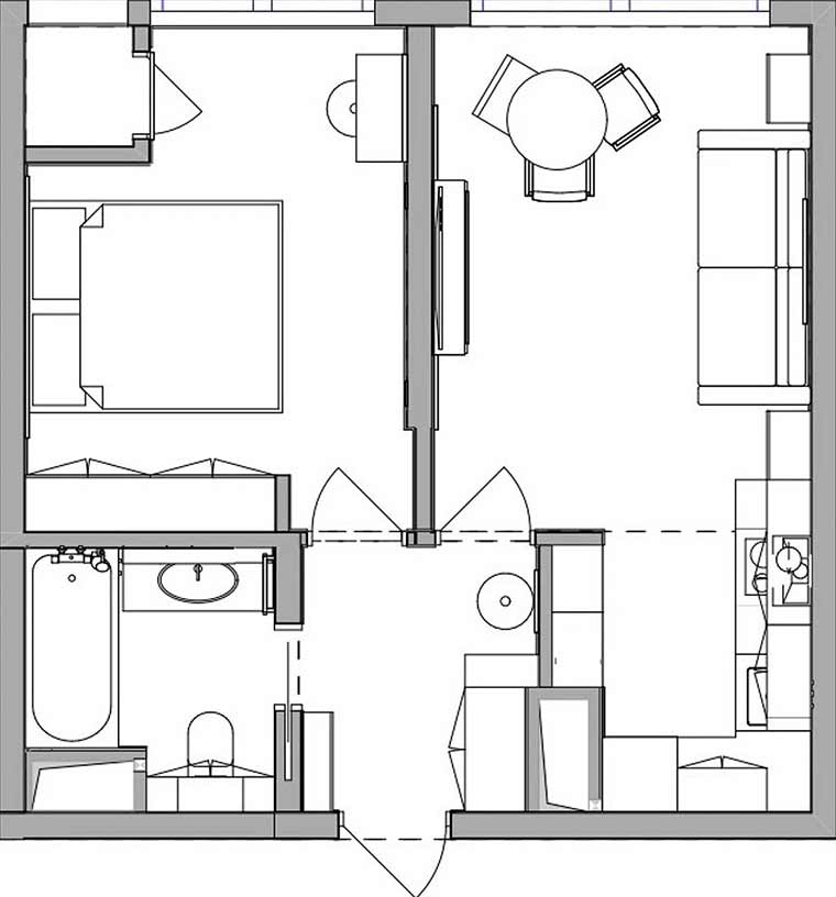 Az ingatlan eredeti elosztása egy konyha-nappali teret, egy külön hálószobát és egy fürdőszobát foglalt magában, valamint a hálóból nyílt egy kisebb technikai helyiség a gépészeti egységek számára. A funkcionálisabb térkihasználás érdekében a tervező és a tulajdonos úgy döntöttek, hogy a konyha-nappali zónát egy ajtóval ellátott válaszfallal szeparálják el az előszobától.