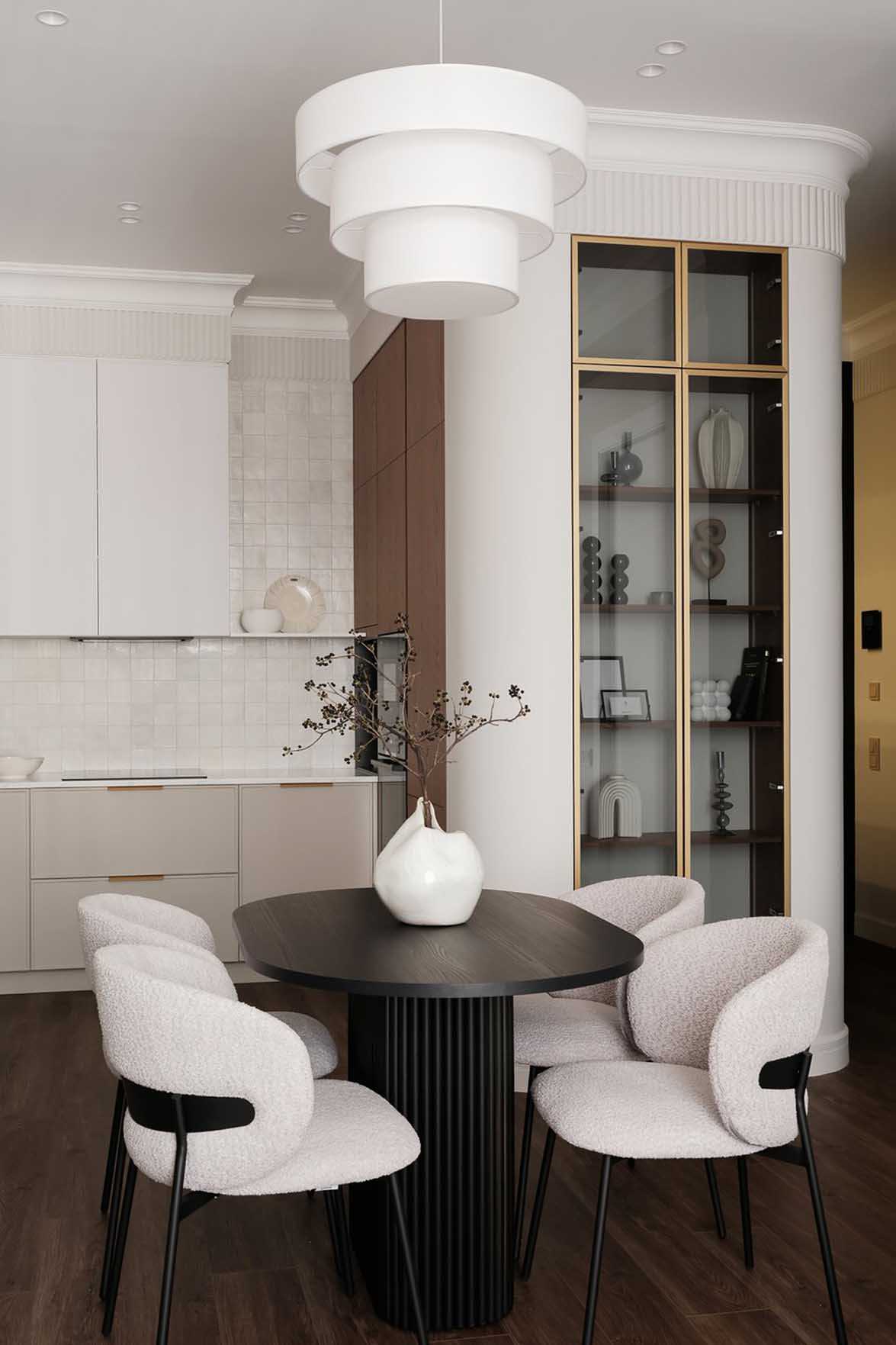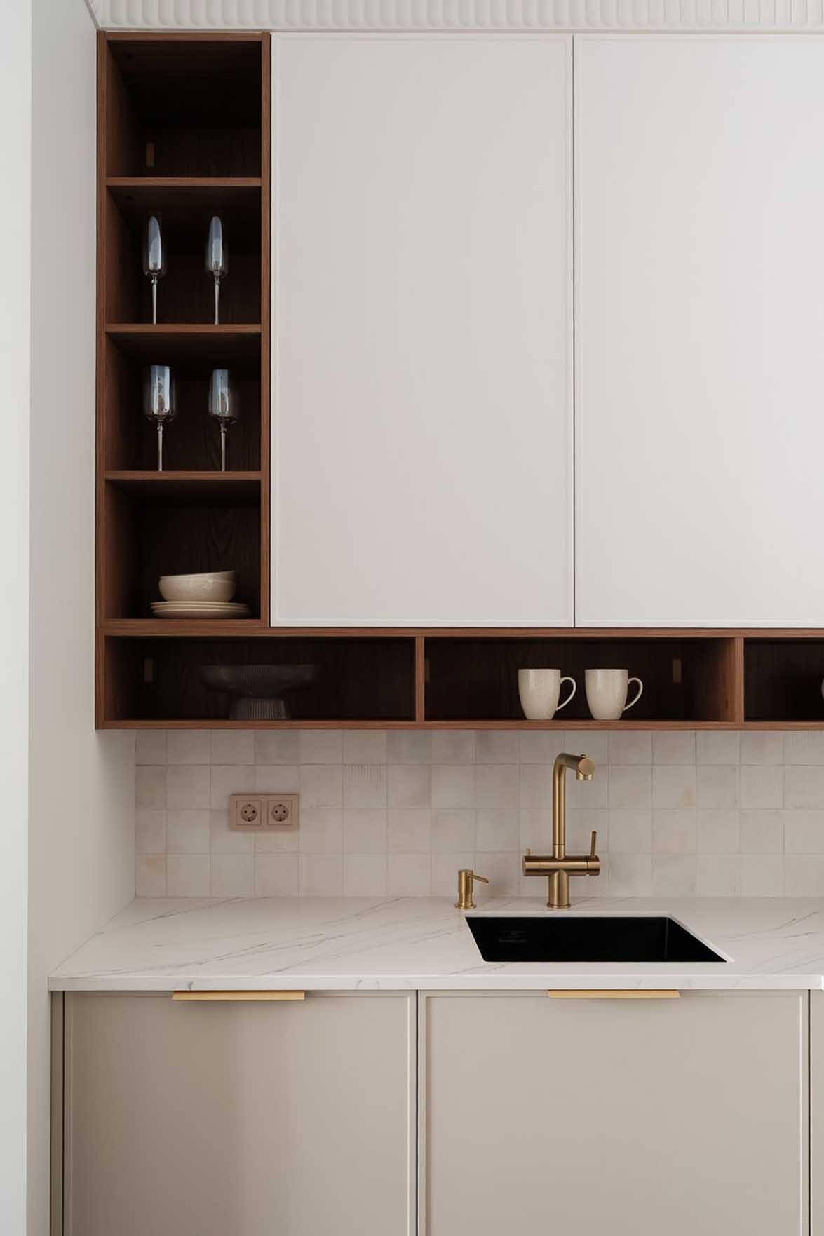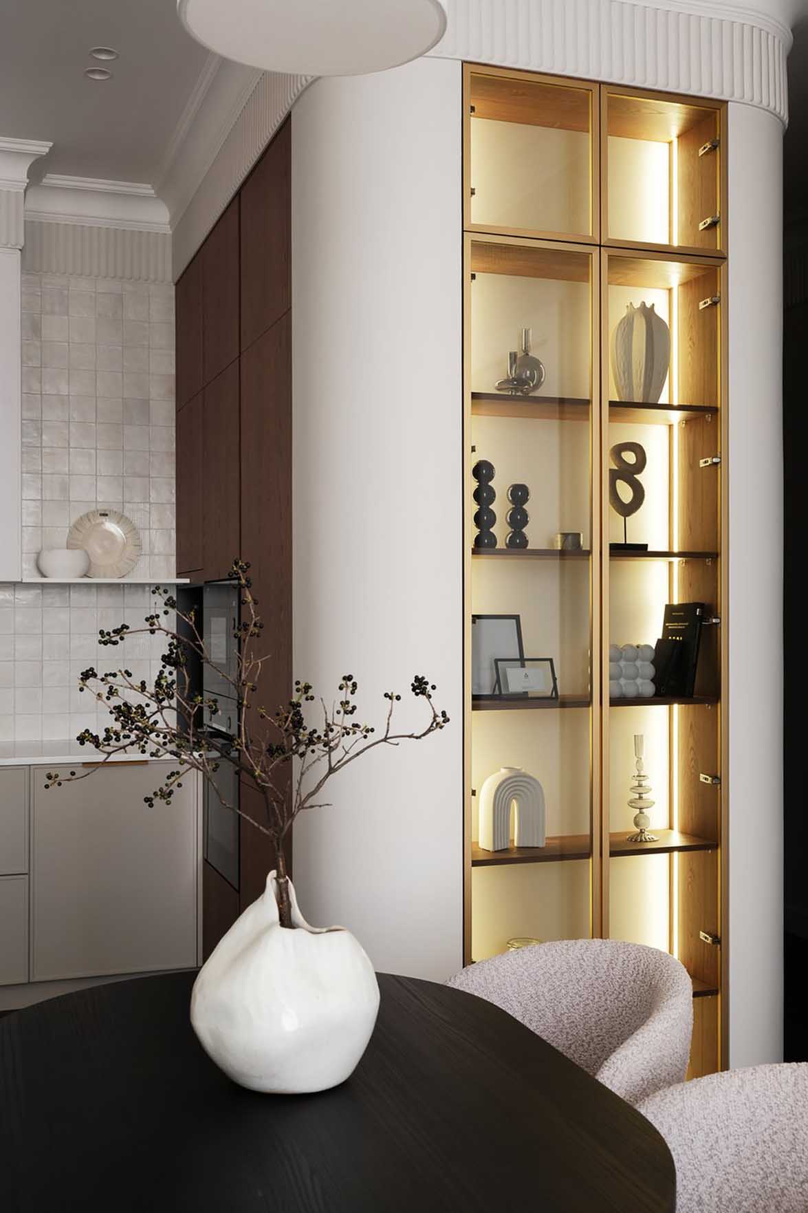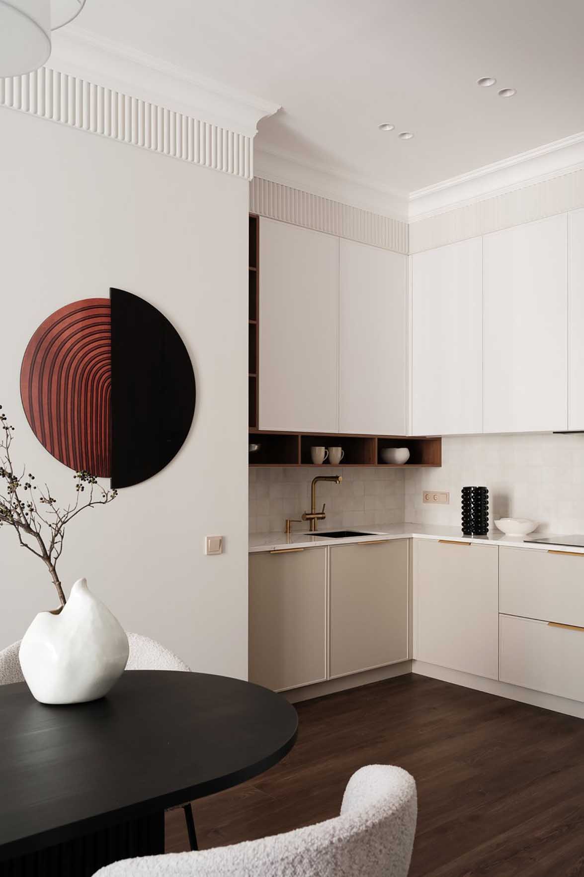A konyha és a nappali egybenyitott terében a világos árnyalatok dominálnak, amelyeket a tervező szándékosan választott, hogy a lakás a borúsabb napokon is napfényes, hívogató és finoman körülölelő atmoszférát árasszon. A konyhabútort egy falfülkébe süllyesztették, így szinte egybeolvad a falfelülettel. A munkalap 20 milliméter vastag akrilkőből készült, a hátfalat pedig elegáns, kis formátumú csempével burkolták. A tárolást három, padlótól mennyezetig érő beépített szekrény – köztük a hűtőszekrényt rejtő elem – oldja meg, míg a kisgépeknek a munkalap magasságában alakítottak ki egy nyitott fülkét. A tér építészeti karakterét a mennyezet alatti díszlécek és panelek kombinációja adja. Az íves falfelületek burkolásához a díszléceket egyedileg, 3D nyomtatóval készített elemekkel toldották meg, hogy az illesztések tökéletesek legyenek.