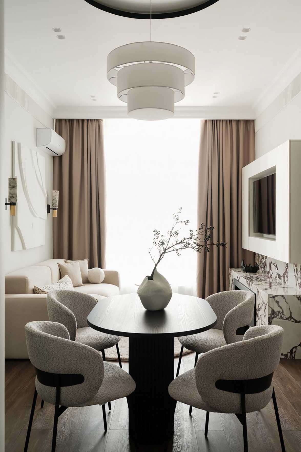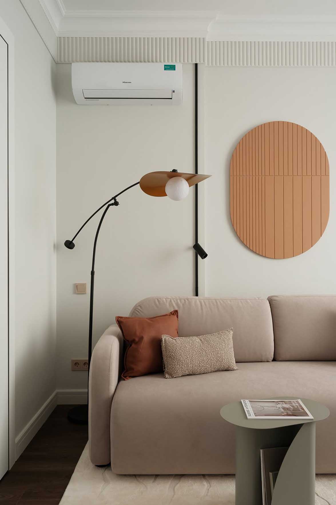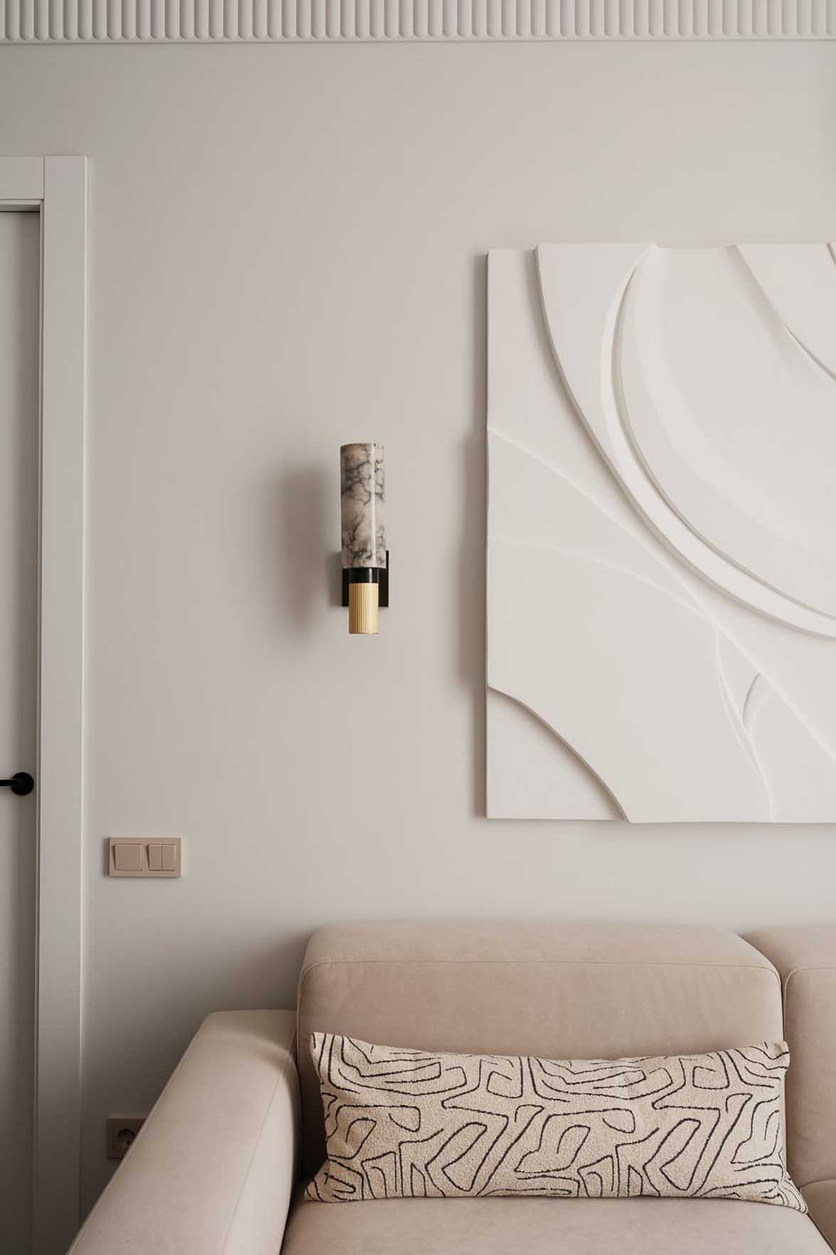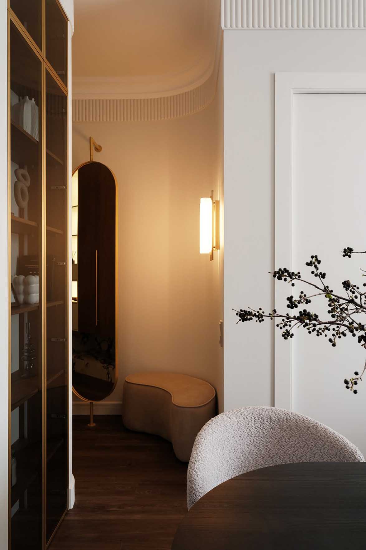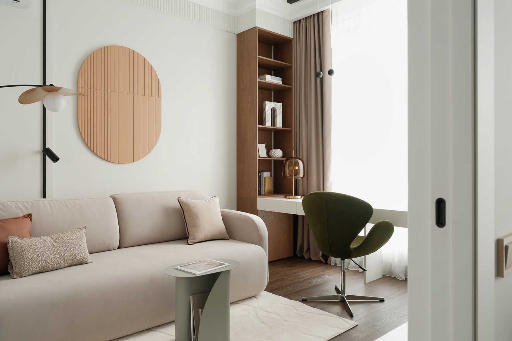 A konyha és a nappali egybenyitott terében a világos árnyalatok dominálnak, amelyeket a tervező szándékosan választott, hogy a lakás a borúsabb napokon is napfényes, hívogató és finoman körülölelő atmoszférát árasszon. A konyhabútort egy falfülkébe süllyesztették, így szinte egybeolvad a falfelülettel. A munkalap 20 milliméter vastag akrilkőből készült, a hátfalat pedig elegáns, kis formátumú csempével burkolták. A tárolást három, padlótól mennyezetig érő beépített szekrény – köztük a hűtőszekrényt rejtő elem – oldja meg, míg a kisgépeknek a munkalap magasságában alakítottak ki egy nyitott fülkét. A tér építészeti karakterét a mennyezet alatti díszlécek és panelek kombinációja adja. Az íves falfelületek burkolásához a díszléceket egyedileg, 3D nyomtatóval készített elemekkel toldották meg, hogy az illesztések tökéletesek legyenek.