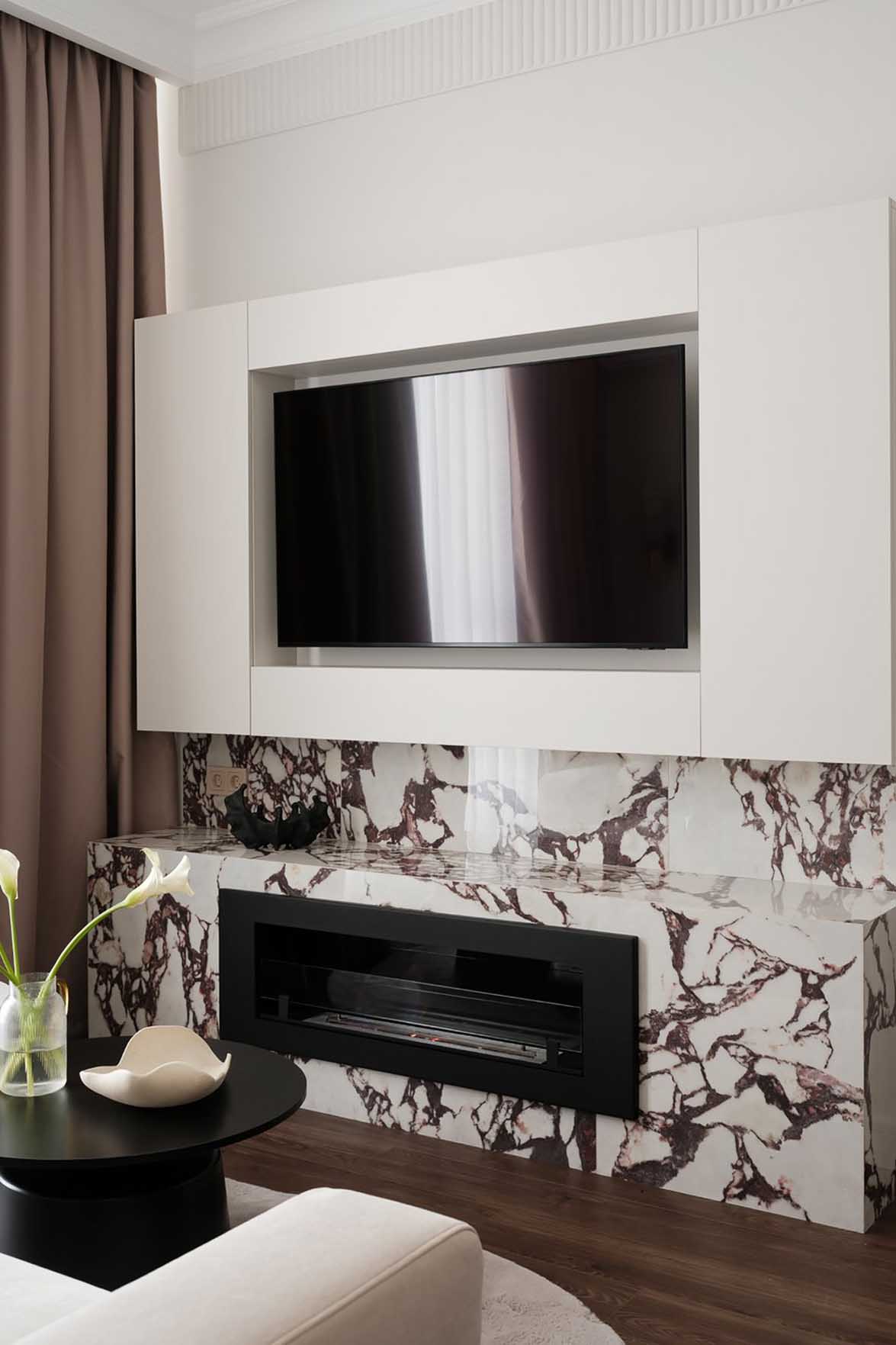 A nappali zóna fókuszpontja a tulajdonosok régi álma, a folyékony tüzelőanyaggal működő biokandalló – ezt egy gipszkartonból épített, majd fényes greslappal burkolt modern dobozba integrálták. Felette kapott helyet a lebegő hatású tévés fal, amelynek burkolata mögött, a homlokzatok takarásában rejtett polcokat alakítottak ki a mindennapi apróságok számára. Az egybefüggő tér általános világítását a mennyezetbe süllyesztett, szinte észrevehetetlen spotlámpák biztosítják, hagyva érvényesülni a bútorokat és a természetes fényt.