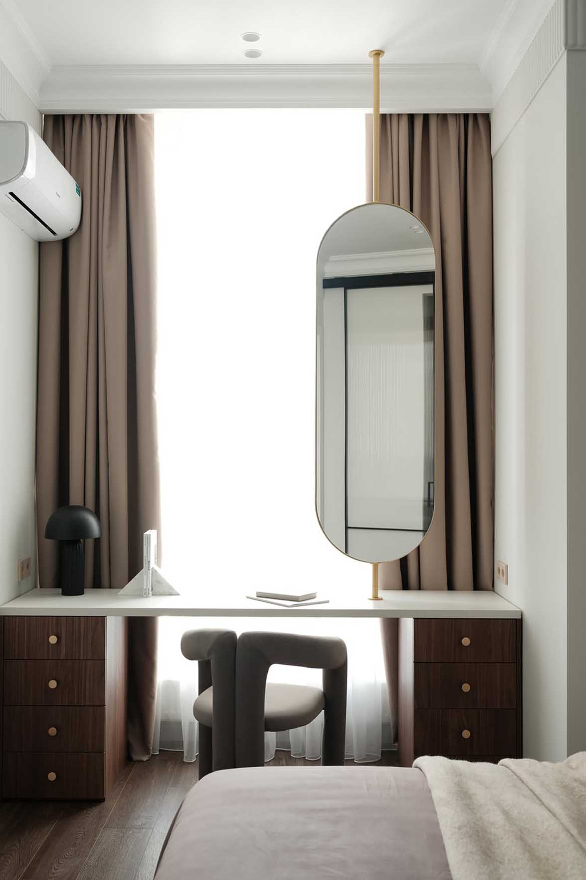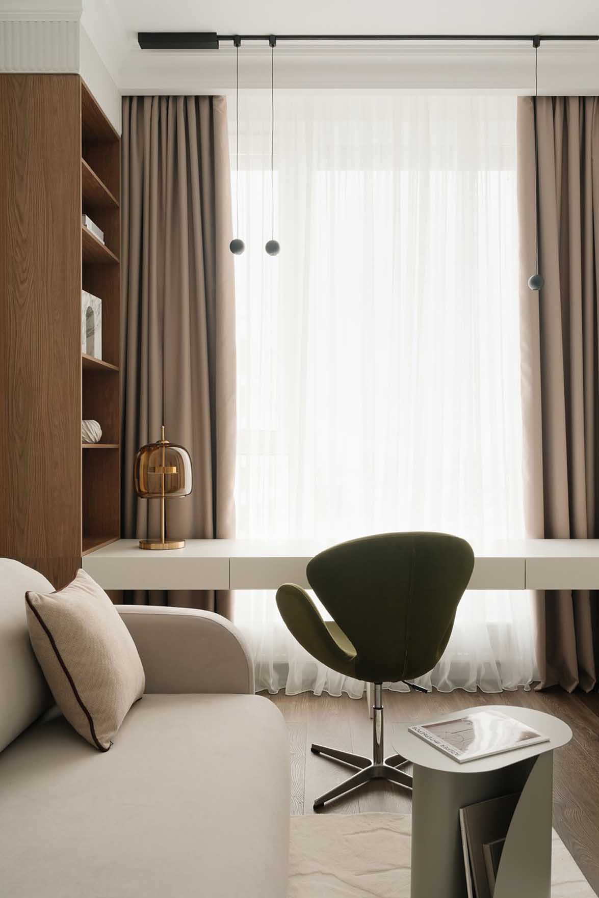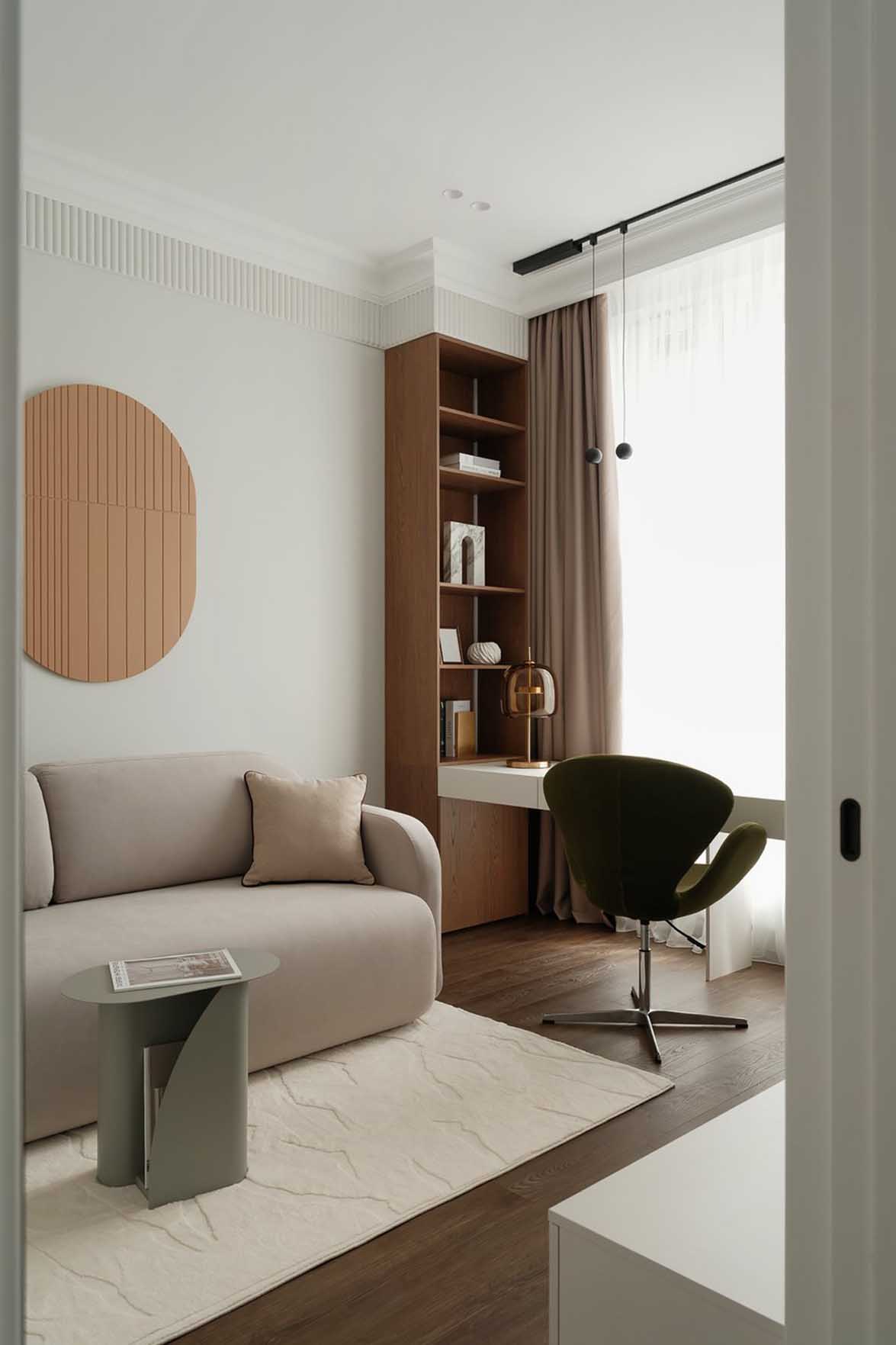 A lakás másik oldalán található második szoba jelenleg az otthoni munkavégzésnek ad helyet, de vendégszobaként is funkcionálhat, a gondos tervezésének köszönhetően később könnyedén gyerekszobává lényegülhet át. A munkaterületet egy széles asztallap biztosítja, amelyet két, könyvek és dekorációs tárgyak tárolására alkalmas polcrendszer közé építettek be. A berendezést egy számítógépes szék, valamint az asztal fölé helyezett, mennyezeti sínrendszeres függőlámpa egészíti ki. A világítás itt is rétegzett: a sínes lámpák mellett a kanapénál egy állítható spotlámpa, valamint egy olvasáshoz és az esti, hangulatos időtöltéshez tökéletes, belógó állólámpa is helyet kapott.