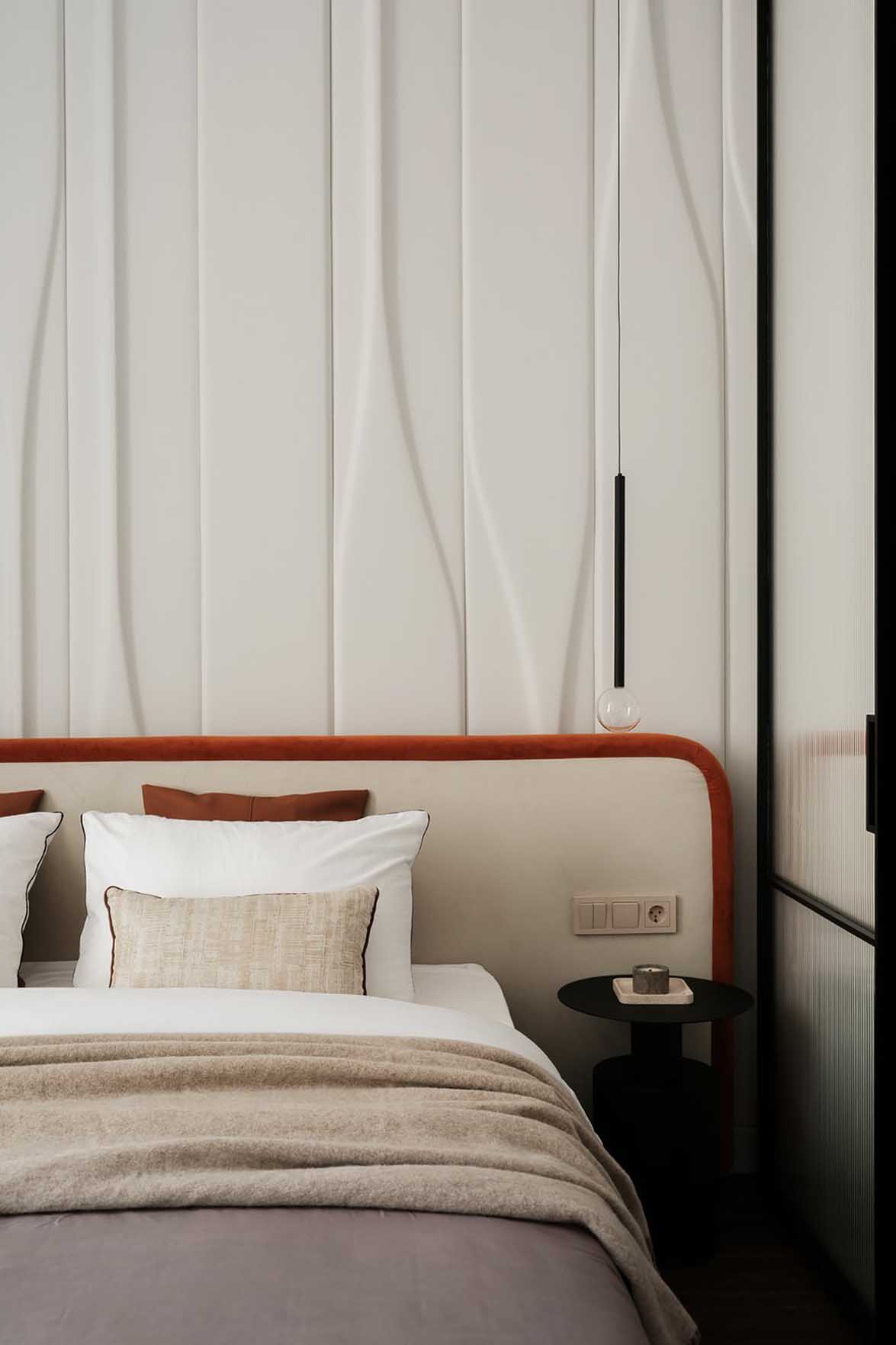 A hálószoba falai lágy, világosbézs árnyalatot kaptak, a helyiség így nyugalmat áraszt. Az ágy mögötti falat izgalmas, domborműszerű textúrával ellátott panelek díszítik – ez a geometrikus motívum a nappali kanapéja feletti panelen is visszaköszön, finoman összekötve a helyiségeket. Az egyedi gyártású franciaágy teljes falszélességben futó, puha kárpitozott fejtámlát kapott, melynek téglavörös szegélye elegáns színfoltként élénkíti az enteriőrt. Az ablaknál egy gyönyörű kilátással rendelkező, fésülködőasztalként is funkcionáló kényelmes dolgozósarkot rendeztek be.