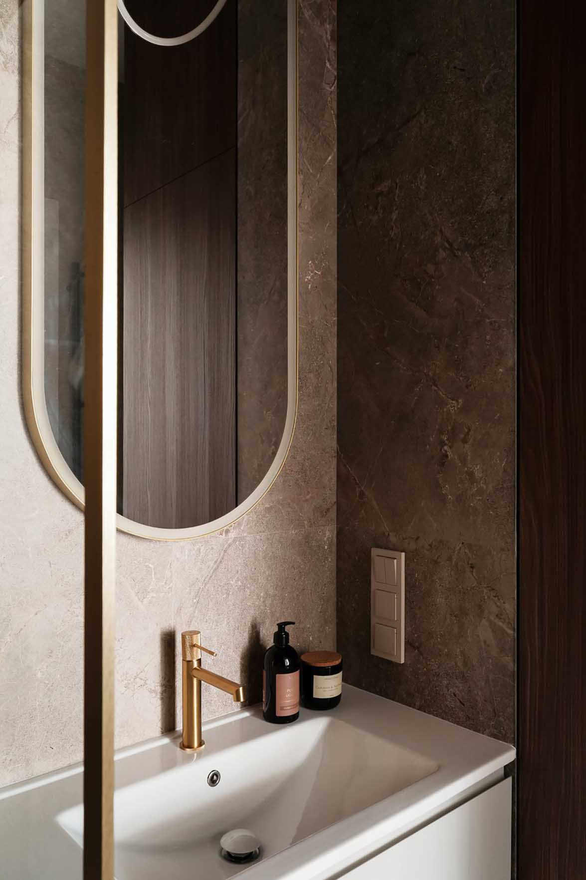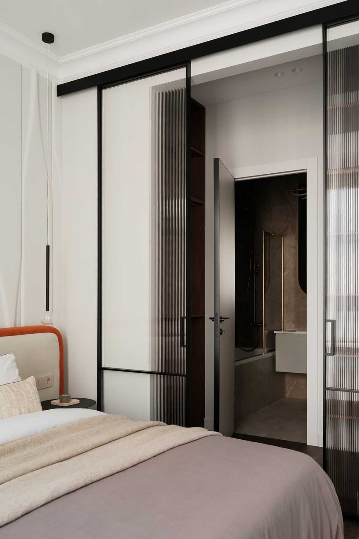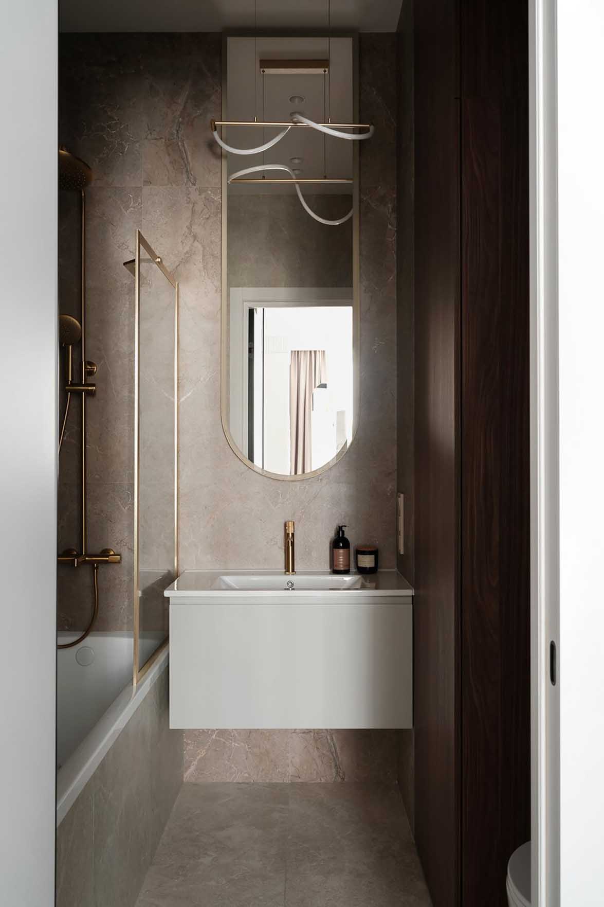 A hálószobából elegáns, bordázott üvegű tolóajtók vezetnek az átjárható gardróbba, majd onnan a saját fürdőszobába. Ebben a privát, fürdőkáddal felszerelt vizesblokkban kapott helyet a mosókonyha is: a mosó- és szárítógépet egy magas, zárt szekrénybe rejtették, így nem bontják meg a tér esztétikáját. A helyiség koronája egy klasszikus vonalvezetésű csillár, amely nemcsak vizuális fókuszpontként szolgál, hanem lágy, bevilágító fényével tökéletes, pihentető atmoszférát teremt a fürdőzéshez.
