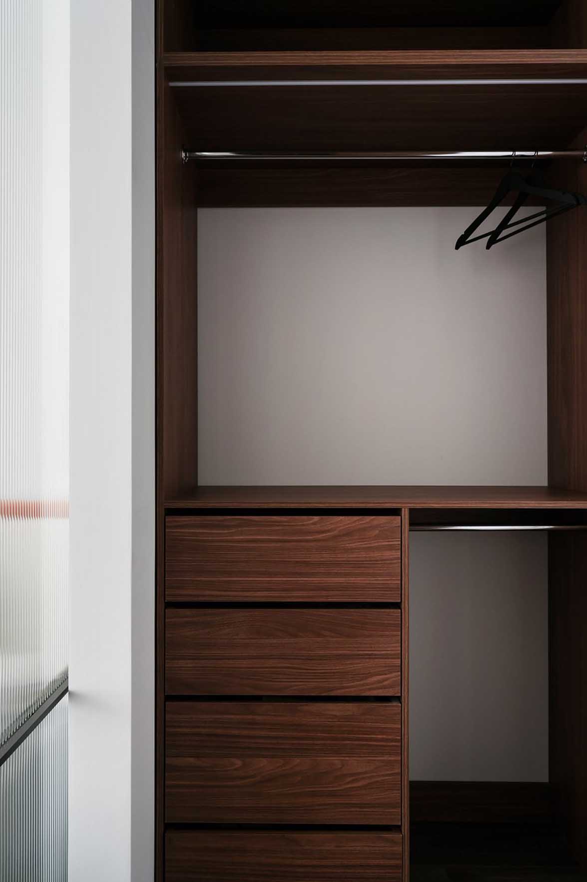 Az előszobában egy praktikusan megtervezett, méretre készült beépített szekrényt helyeztek el. Ez a tárolórendszer nemcsak az utcai ruházat és a kabátok elrejtésére szolgál, hanem a különféle háztartási eszközöknek is dedikált helyet biztosít. A kulcsok és apró kiegészítők számára az asztalosmunka részeként praktikus kihúzható fiókokat is beépítettek, fenntartva a bejárat környékének folyamatos rendjét.