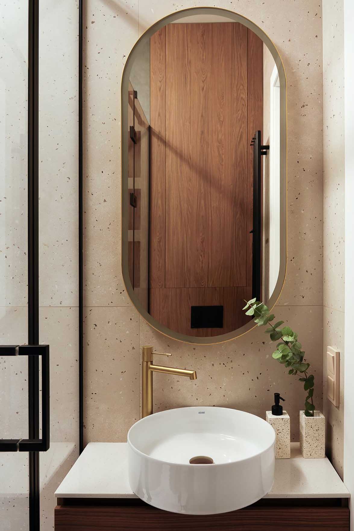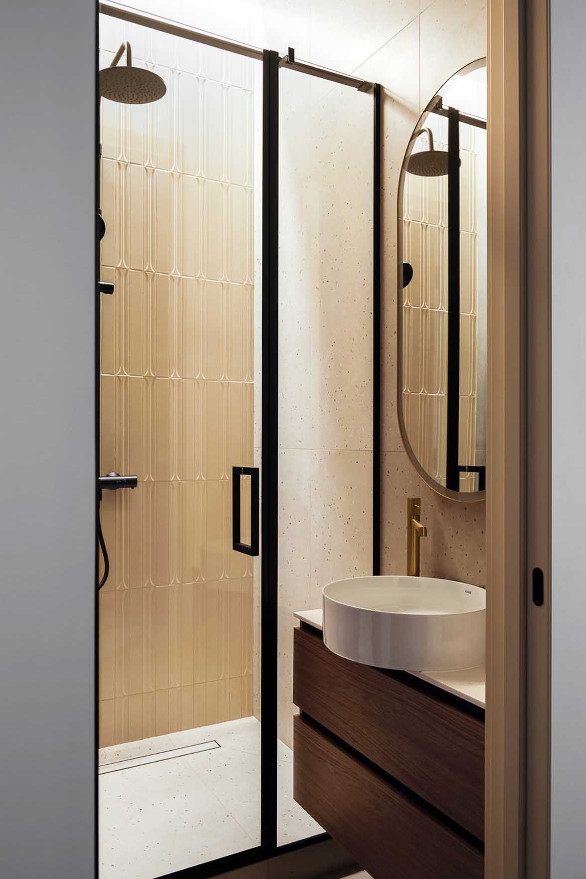 A második fürdőszoba burkolatához kétféle karakteres csempét használtak a tervezés során: egy nagyméretű, terrazzo stílusú lapot, valamint egy kis formátumú, bézs színű, dombornyomott csempét. A zuhanyzóval ellátott térben egy modern, falra szerelt, kétfiókos mosdószekrény biztosít további tárolóhelyet, a berendezés további elemei egy elegáns, háttérvilágítással ellátott tükör, fali WC, bidézuhany és egy praktikus törölközőszárító radiátor.