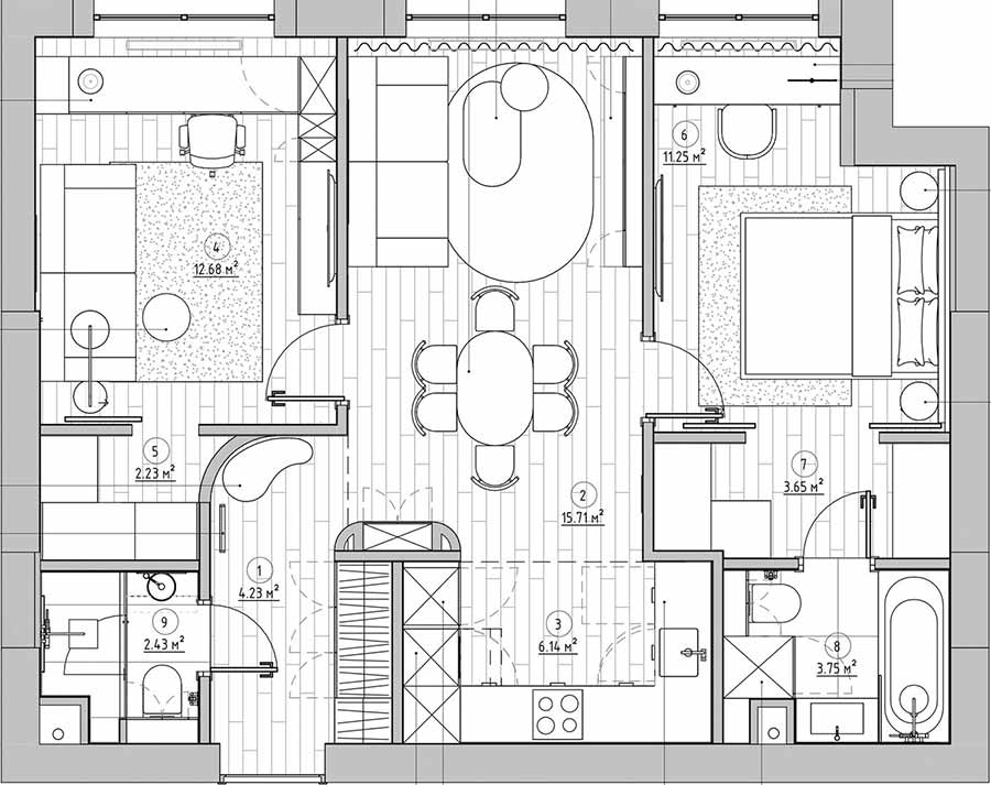 Az ingatlant eredetileg válaszfalak nélküli, egybefüggő térként adta át az építtető, ami nagy szabadságot adott a tervezés során. A konyha a központi nappali térrel egybenyitva lett kialakítva – ezt a tágas közösségi zónát két oldalról fogja közre a hálószoba a saját gardróbjával és fürdőjével, illetve a másik oldalon egy jelenleg dolgozó- és vendégszobaként funkcionáló helyiség, amely szintén saját gardróbbal rendelkezik, és a jövőben könnyedén gyerekszobává alakítható.