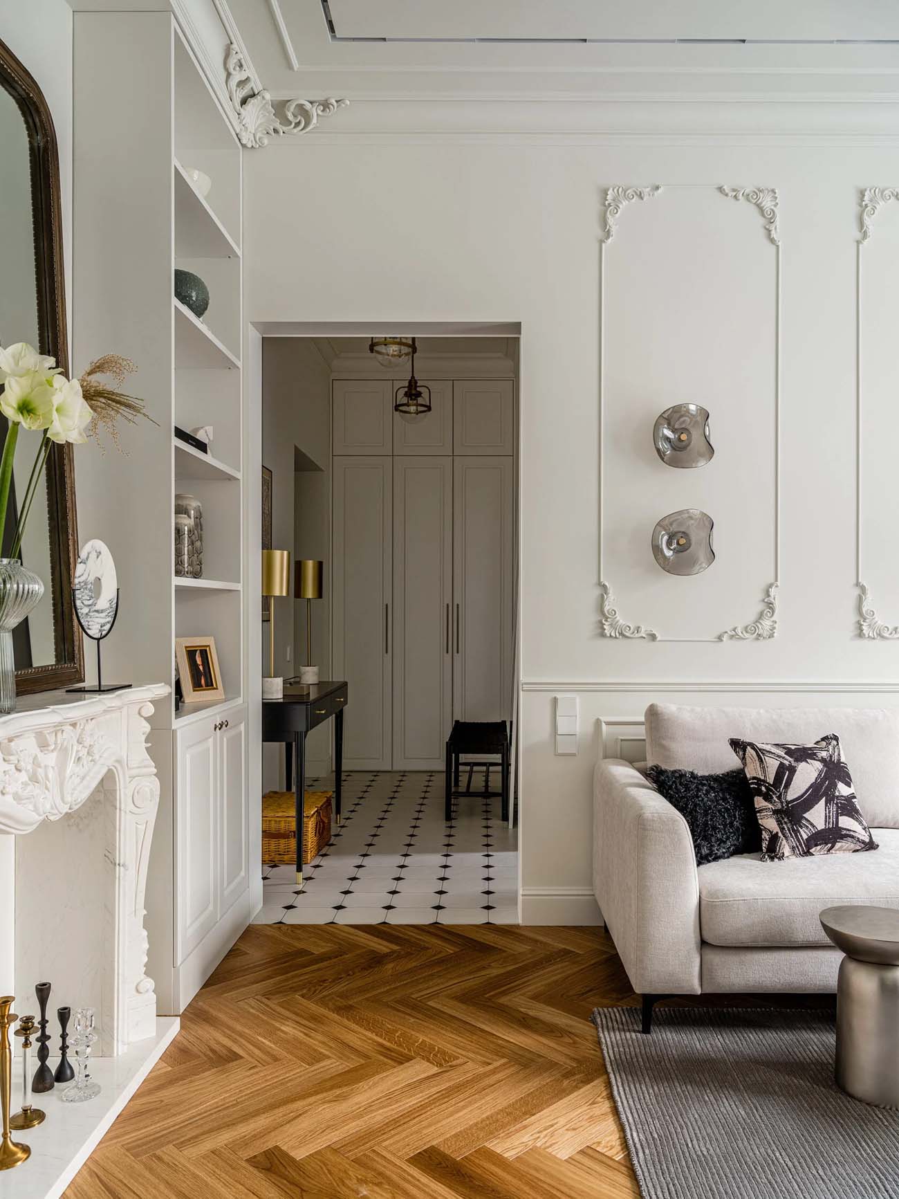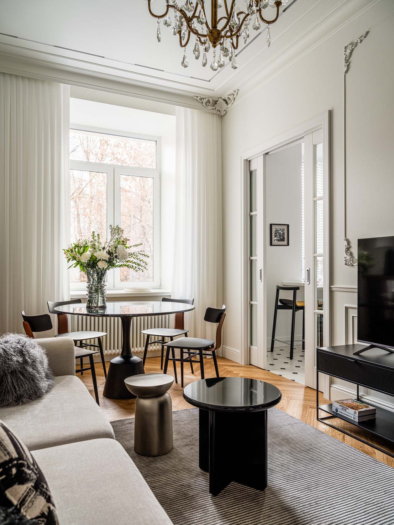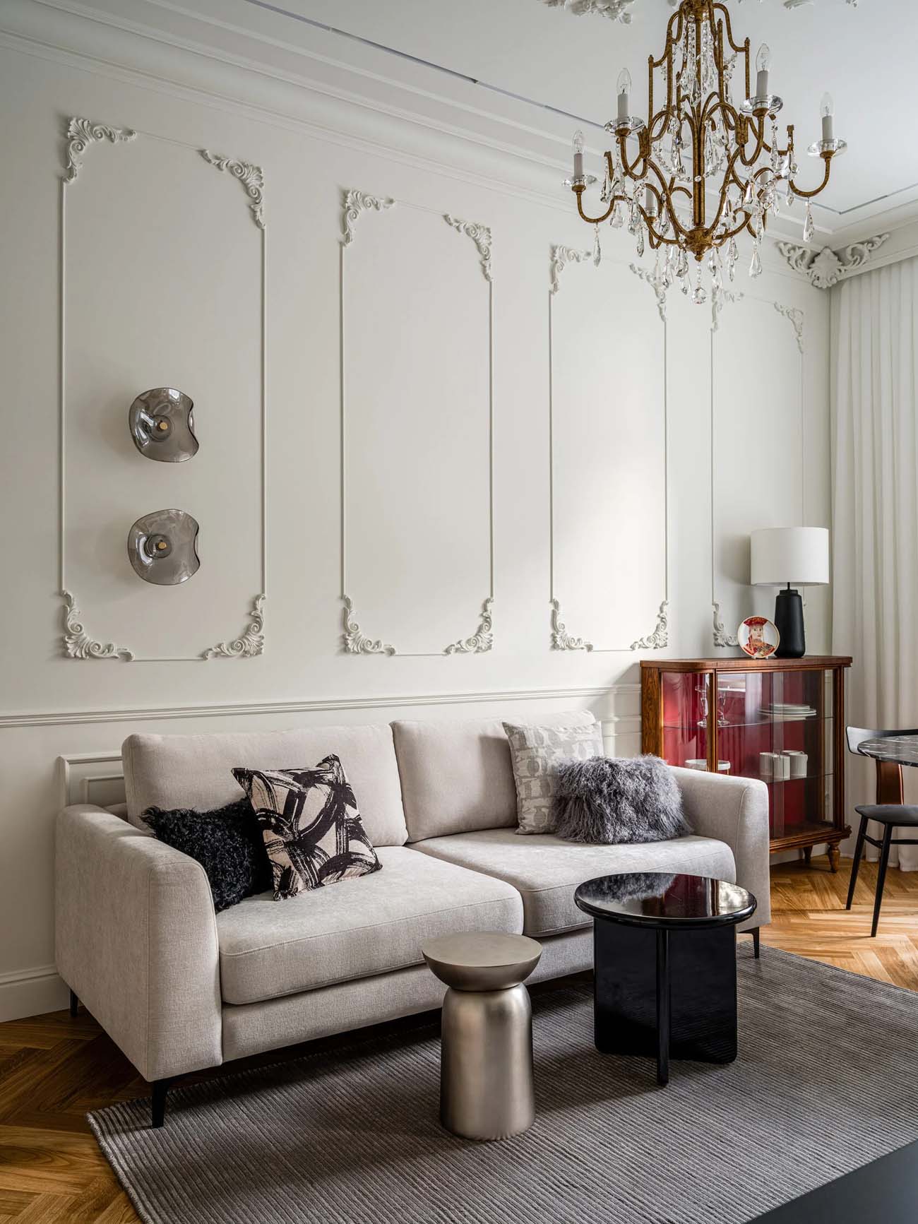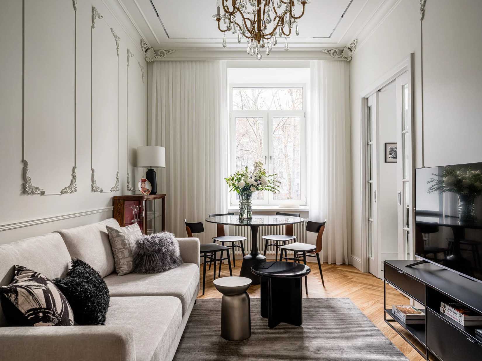Az enteriőr alapját a polgári építészet jellegzetességei adják. A nagy belmagasság, az elegáns mennyezeti stukkók és a hangsúlyos falfelületek nem csupán díszletek, hanem a koncepció tartópillérei is. A törtfehér szín kiemeli a klasszikus elemek kecsességét, és tágas és levegős alapokat teremt.
