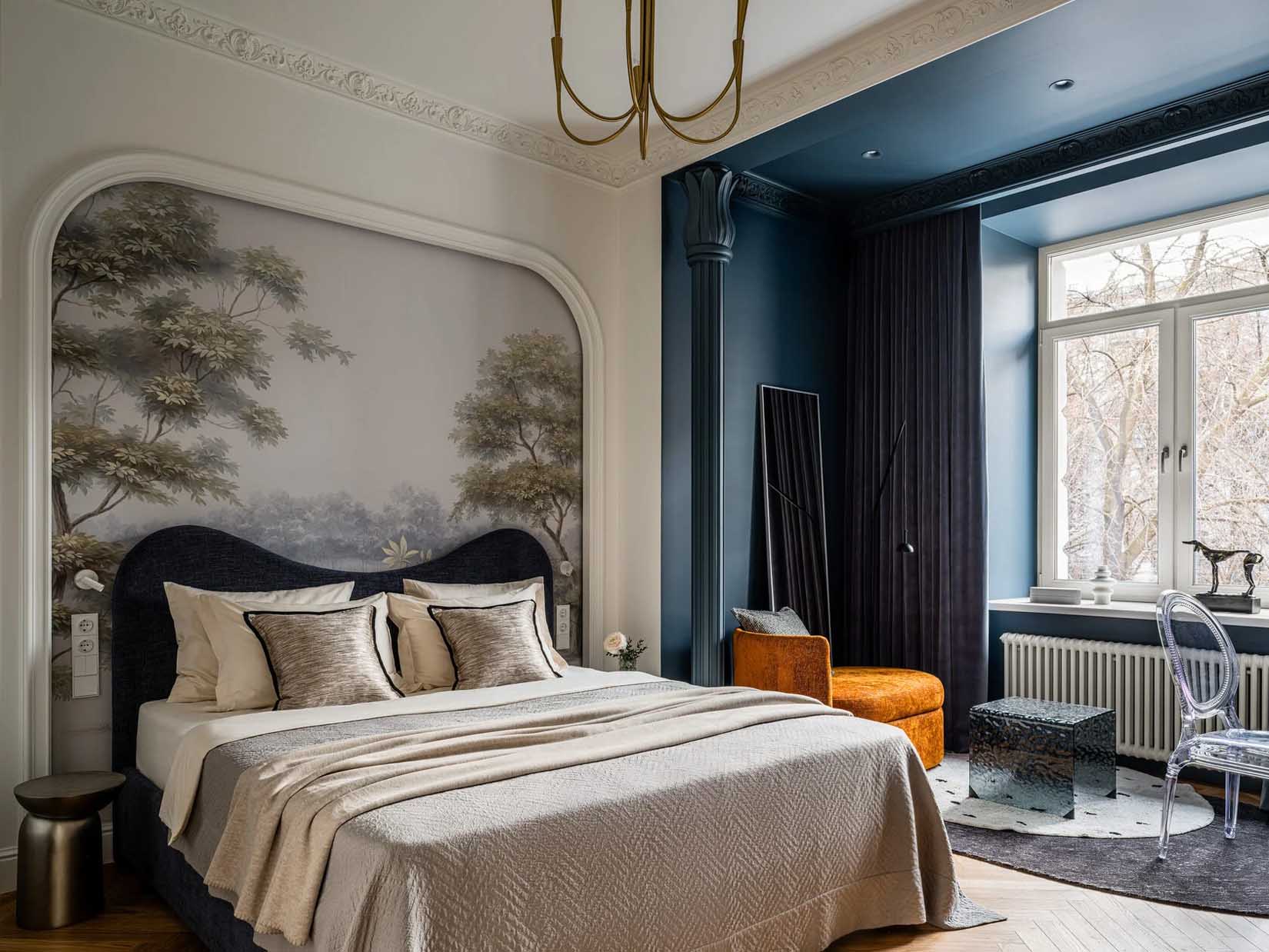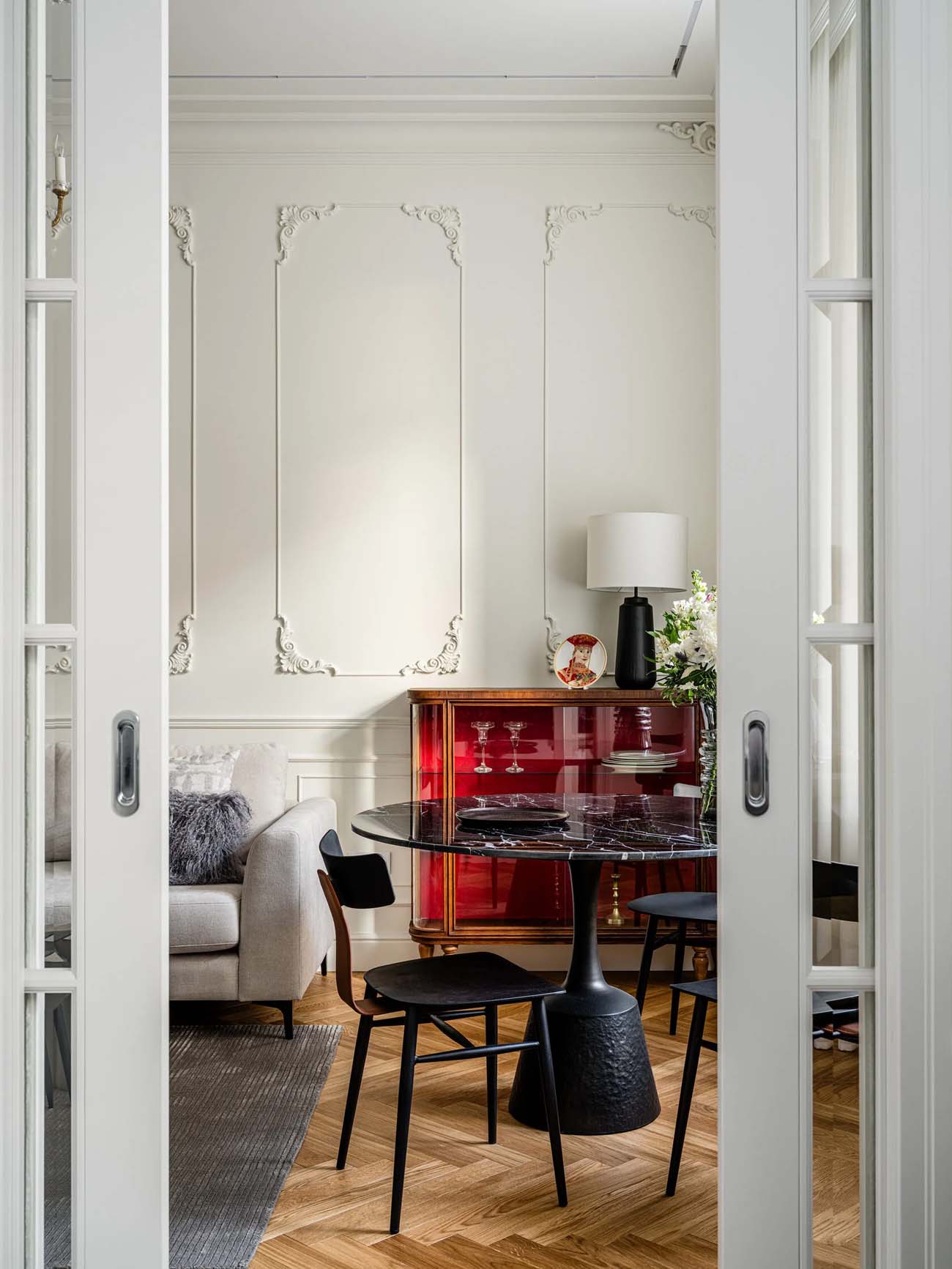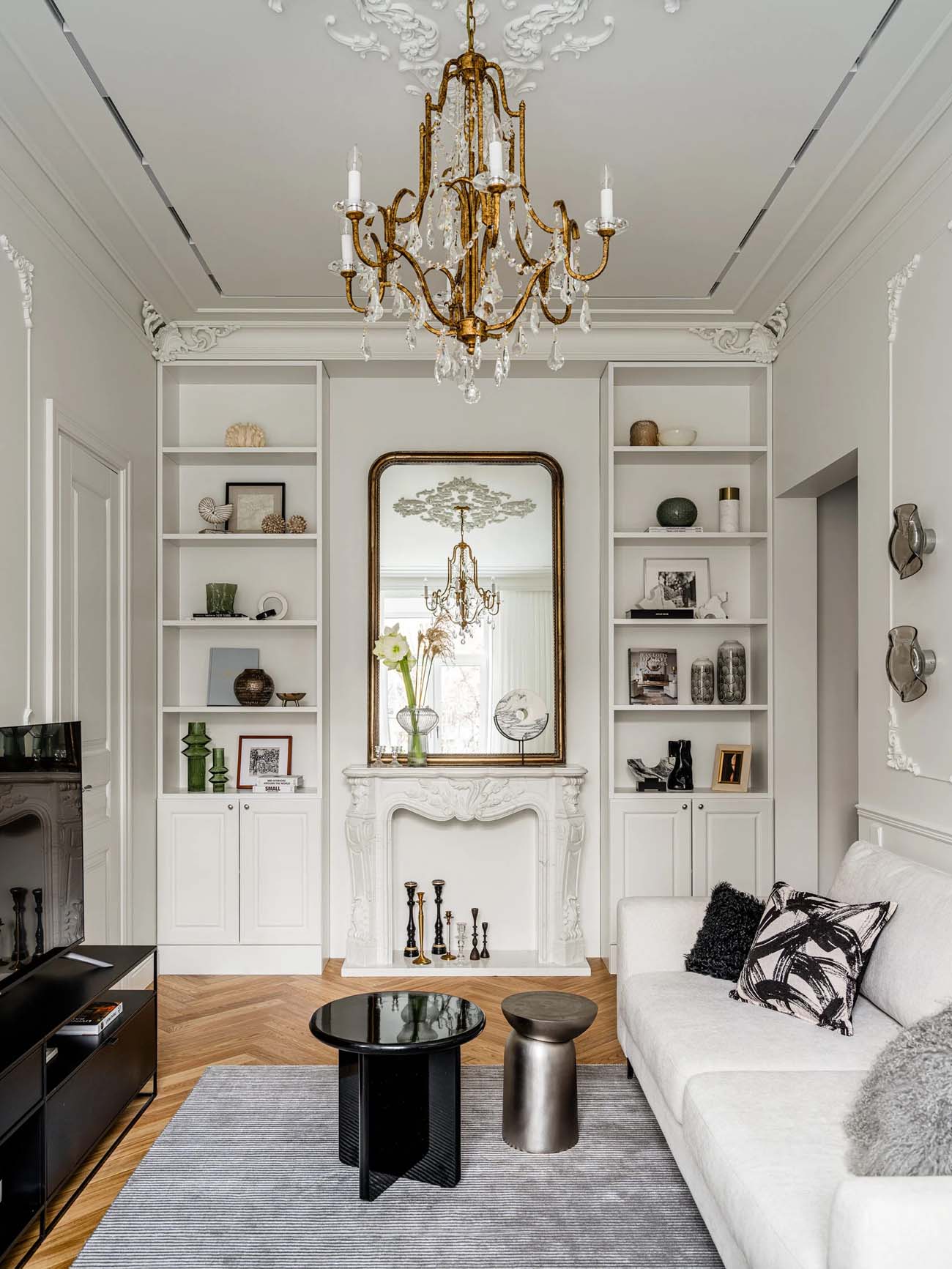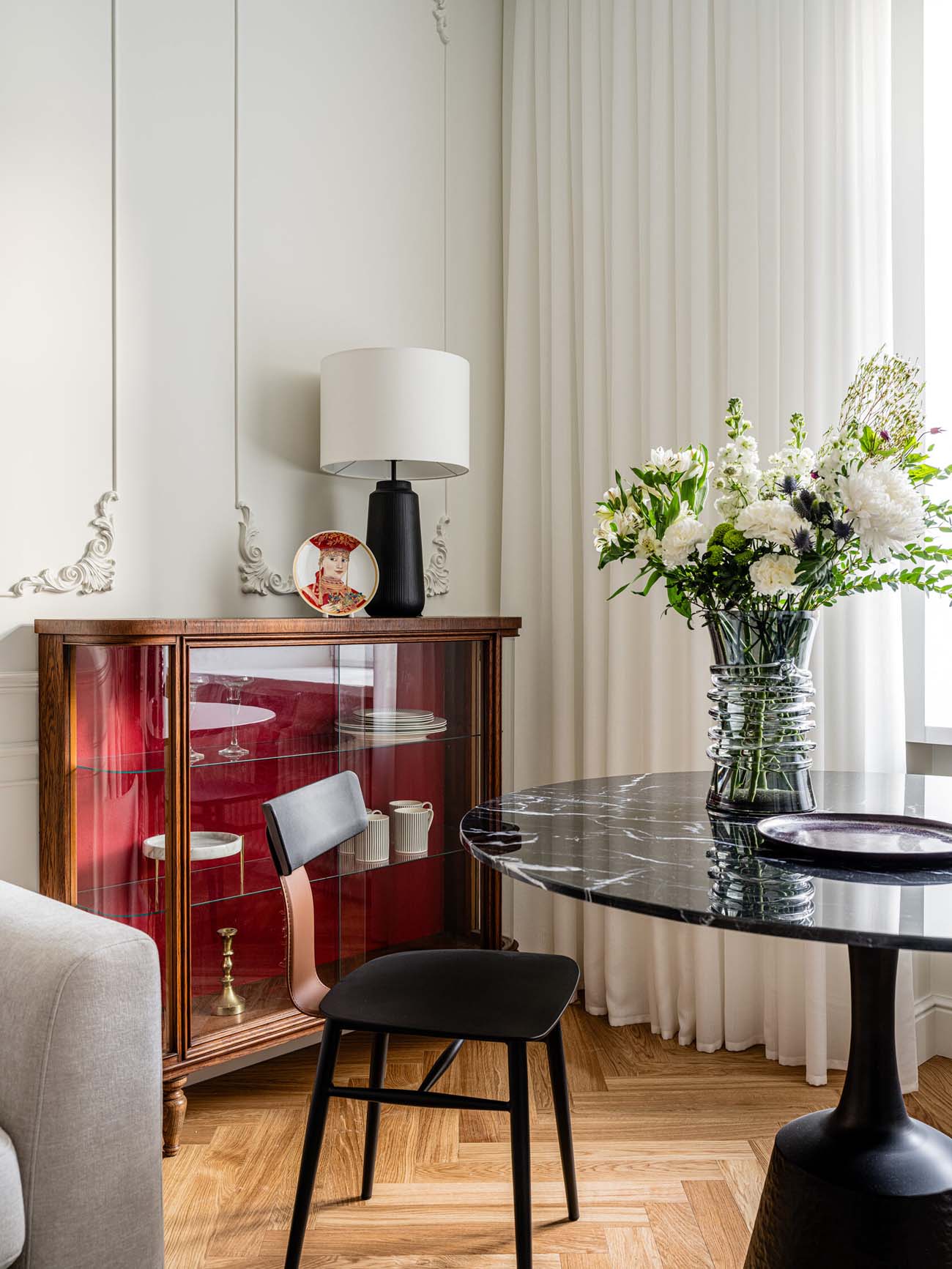 Az enteriőr alapját a polgári építészet jellegzetességei adják. A nagy belmagasság, az elegáns mennyezeti stukkók és a hangsúlyos falfelületek nem csupán díszletek, hanem a koncepció tartópillérei is. A törtfehér szín kiemeli a klasszikus elemek kecsességét, és tágas és levegős alapokat teremt.