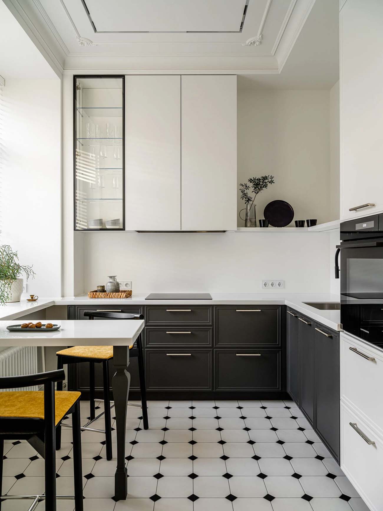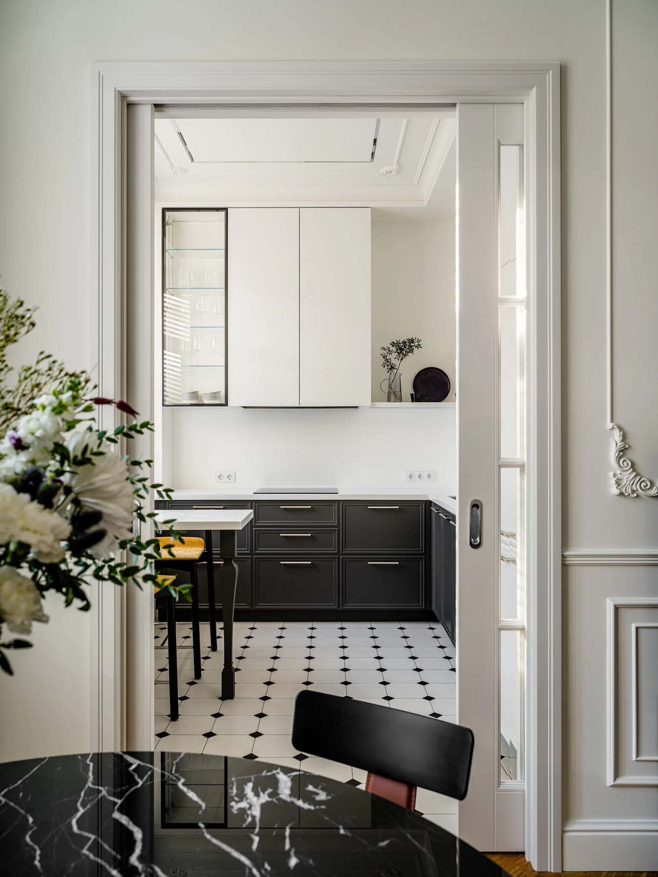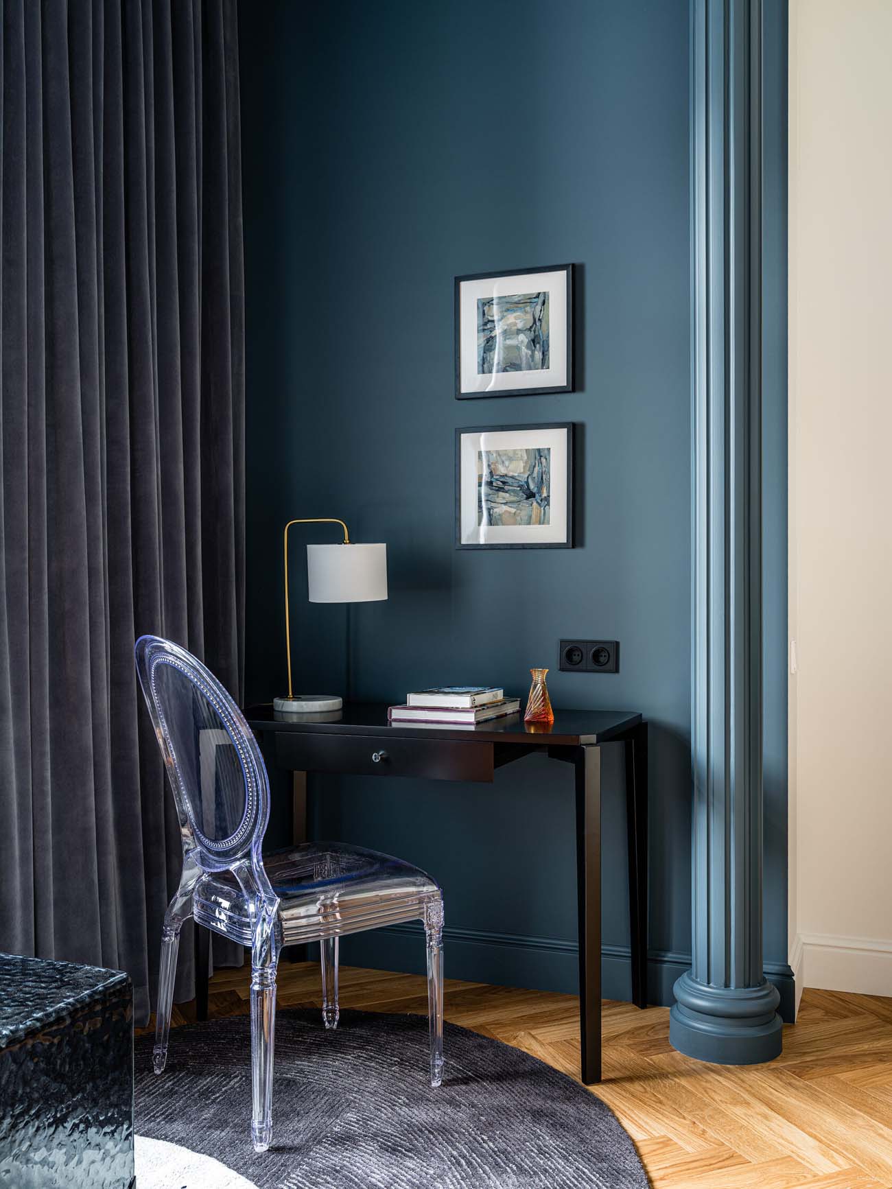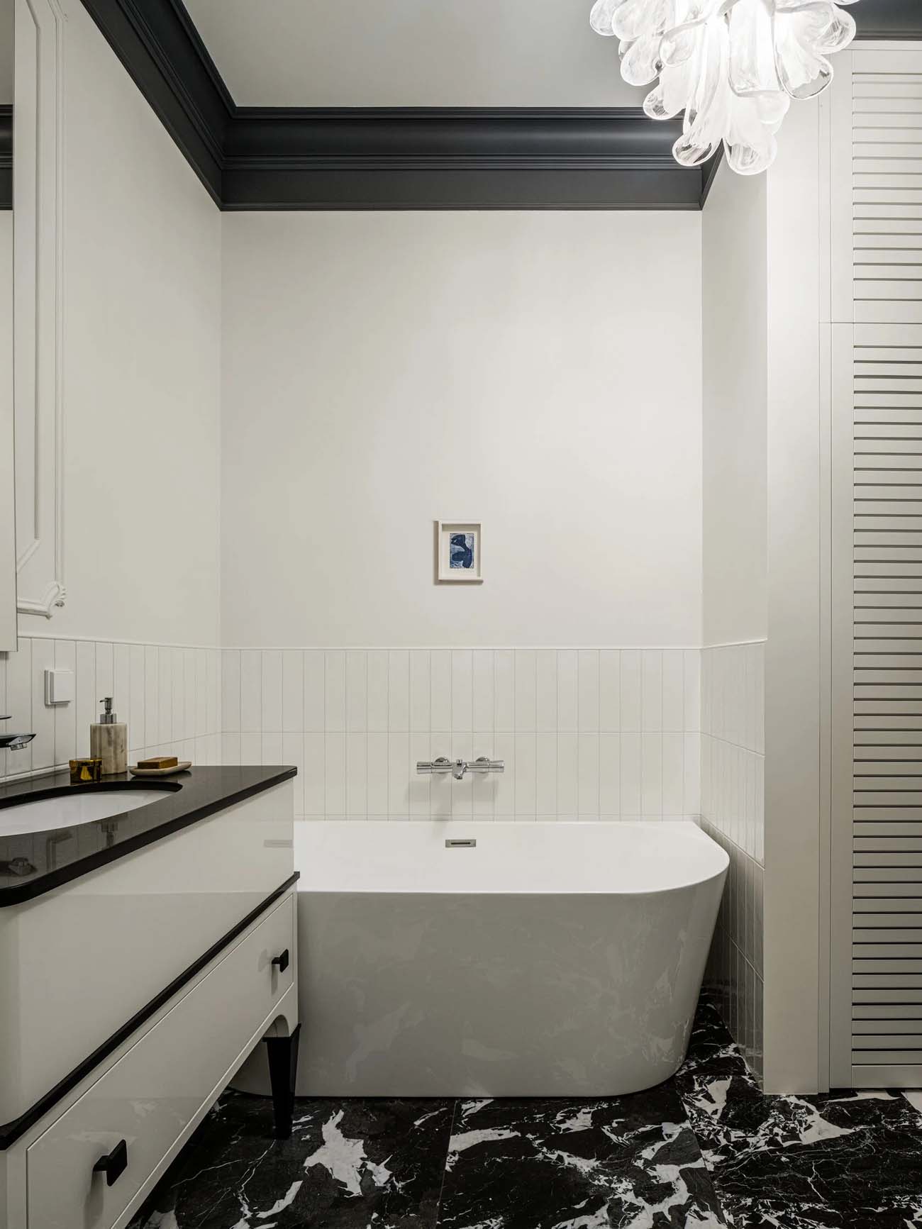 A modern klasszikus stílus itt a kontrasztokon keresztül érvényesül. A fehér falak plasztikusságát a sötét, meleg tónusú parketta és a fekete kiegészítők ellensúlyozzák. A grafikus vonalvezetés, pl. a vékony fekete sínes világítás keretet adnak a klasszikus arányoknak.