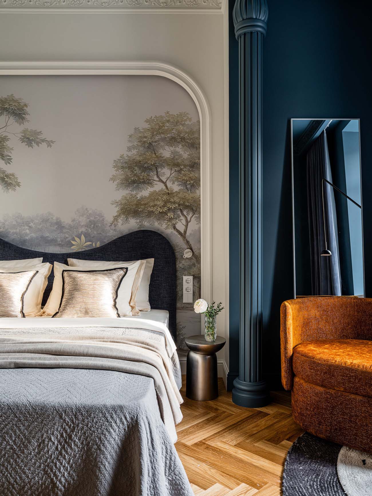 - A “kevesebb több” elve a bútorozásnál: A klasszikus tér szereti a levegőt. Válogass össze néhány hangsúlyos, modern formavilágú darabot ahelyett, hogy zsúfolásig pakolnád a szobát apró bútorokkal.