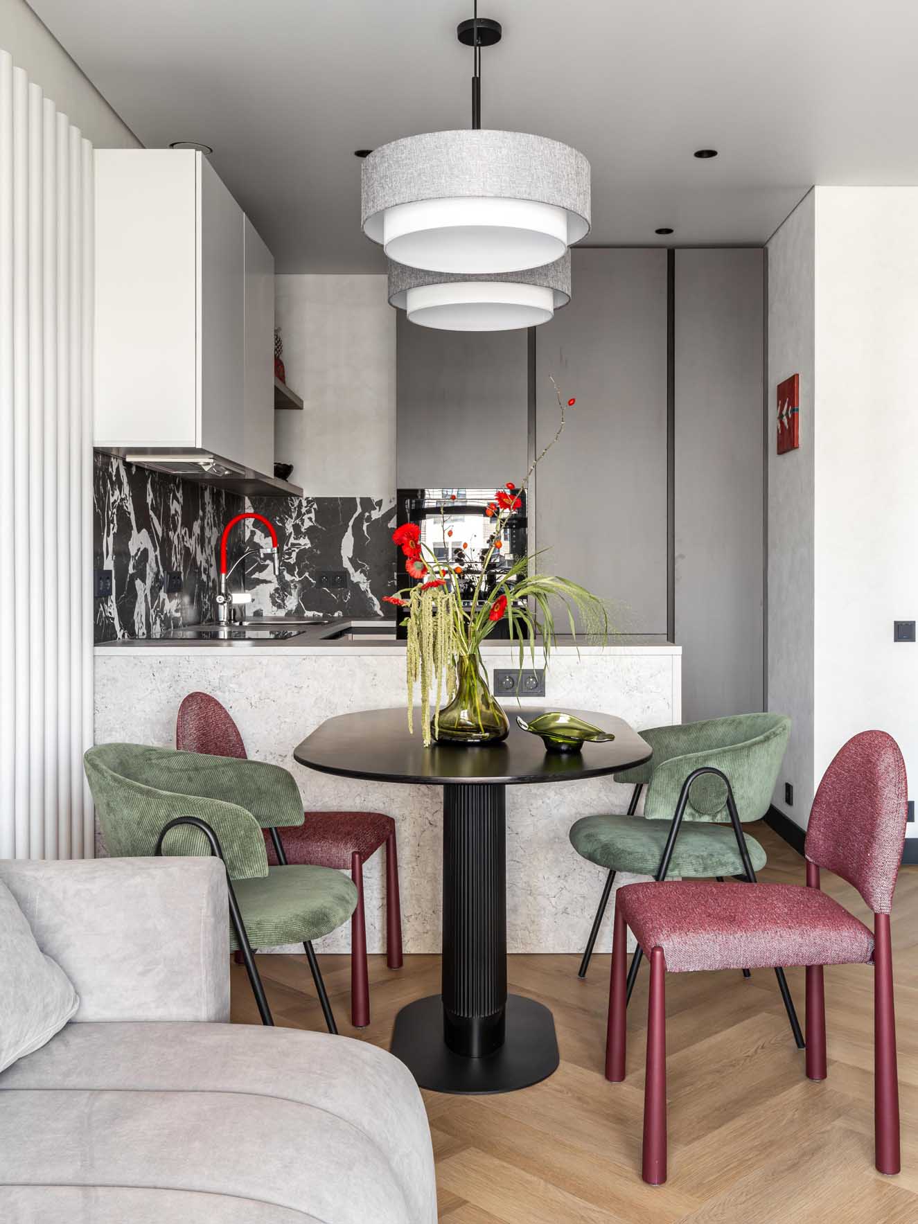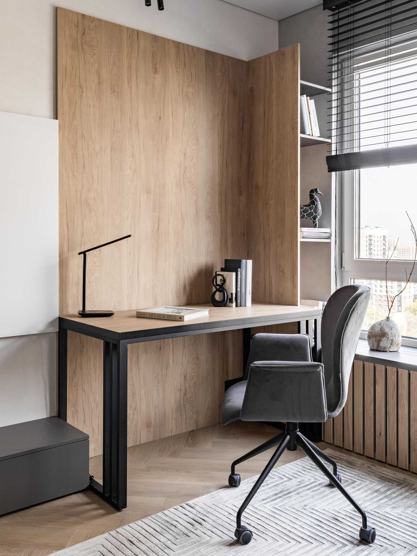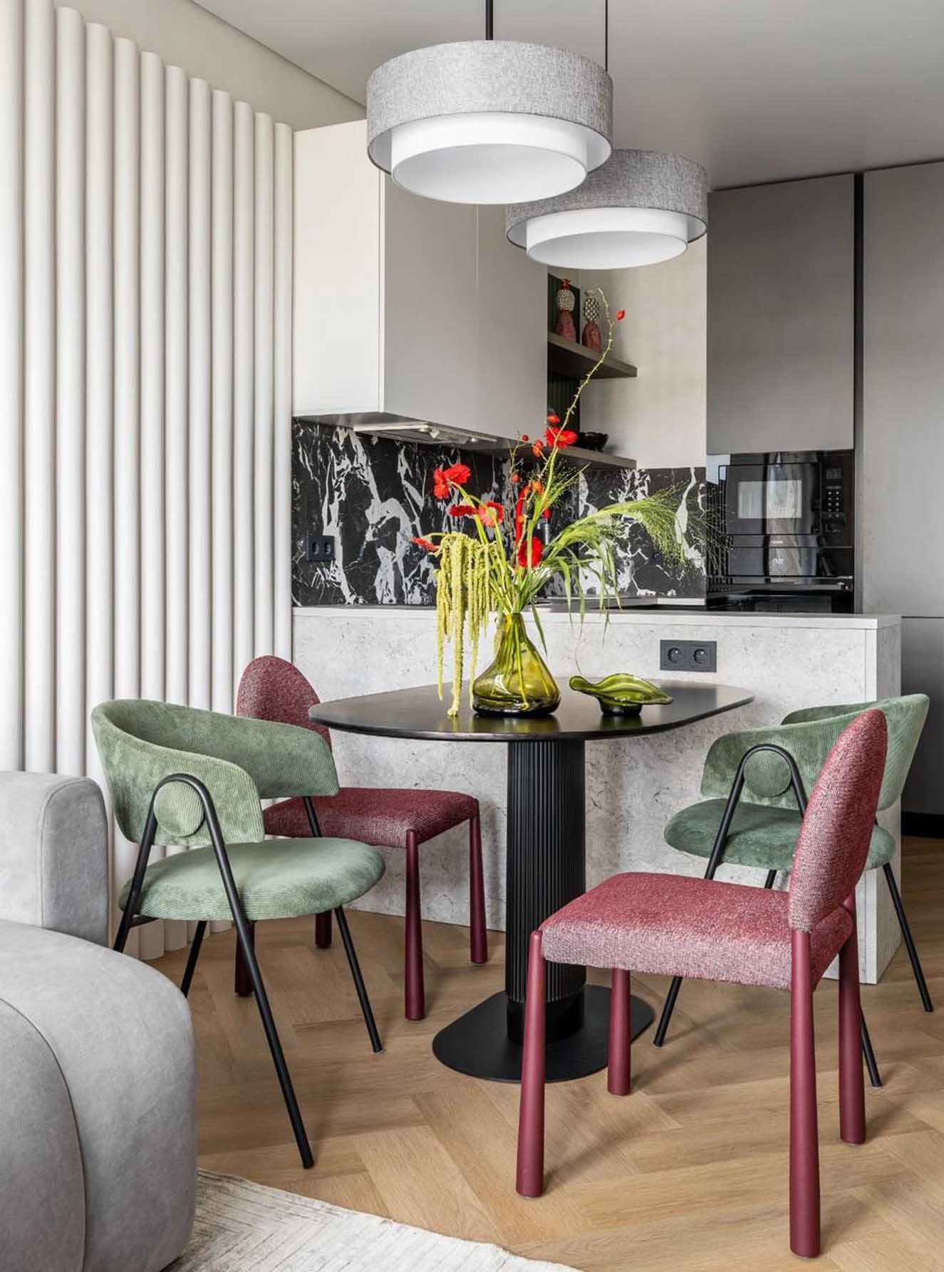 Ebben a projektben egy édesanya bízta meg a lakberendezőket, aki fiának szeretett volna modern, élhető első otthont teremteni egy 42 m²-es ingatlanban. A személyiség kifejezése és a térkihasználás egyensúlya volt a kulcs: az anyuka aktívan részt vett a részletek kidolgozásában, sőt, a dekoráció egy részét – például a falakat díszítő festményeket és pannókat – helyi galériákból szerezte be, folyamatosan egyeztetve a tervezőkkel.