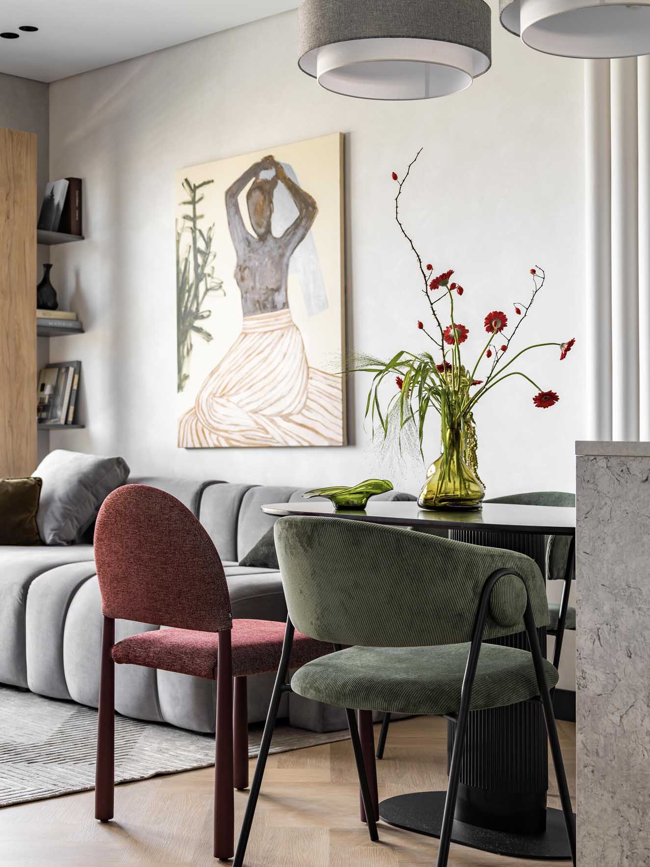 A nappali legkülönlegesebb eleme egy nőalakot ábrázoló festmény. A kép túlmutat a puszta dekoráción: szimbolikusan az anyai gondoskodást és támogatást jelképezi a fiatalember önálló életében. A műalkotás színeiben is tökéletesen illeszkedik a térbe, harmonikus, mégis élénk akcentust alkotva. A projekt erőssége éppen ebben rejlik: egyszerre képes nyugodt és energikus lenni a színhasználatnak köszönhetően.