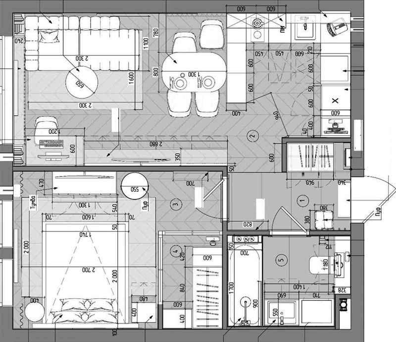 Mivel az ingatlan eredeti alaprajza megfelelő volt, és a költségvetés is szabott határok között mozgott, jelentős falmozgatásra nem került sor. Egyetlen fontos funkcionális változtatás történt: a hálószobában leválasztottak egy kompakt, de jól pakolható gardróbot. Ennek fala színezett üvegből készült, így a tároló nem nehezíti el a szobát, megmarad a szellős térérzet anélkül, hogy a tárolókapacitás kárára menne.