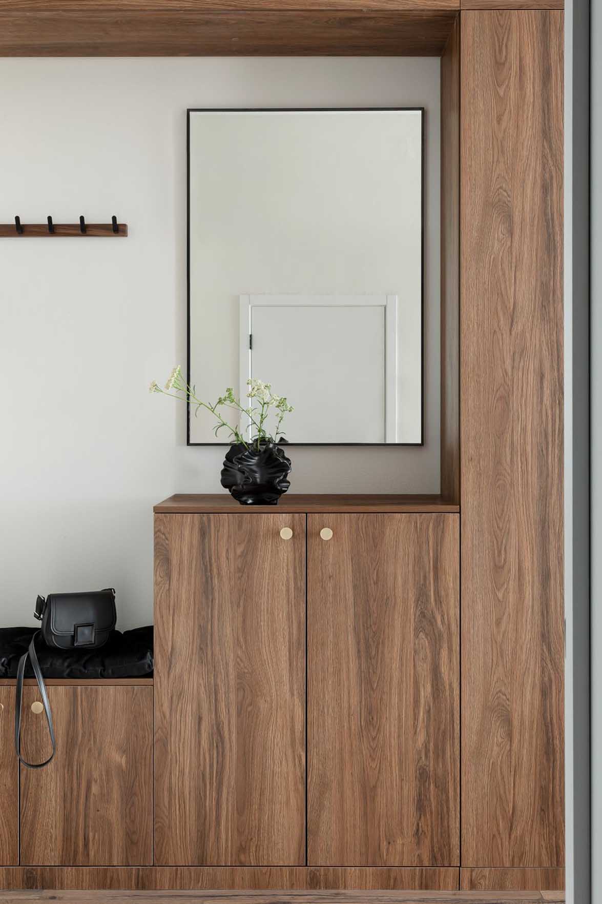 A bejárati zónában található, különböző magasságú elemekből álló szekrényrendszer egyedi asztalosmunka eredménye. A berendezést egy fali tükör, valamint a táskák és kabátok számára felszerelt akasztók egészítik ki.