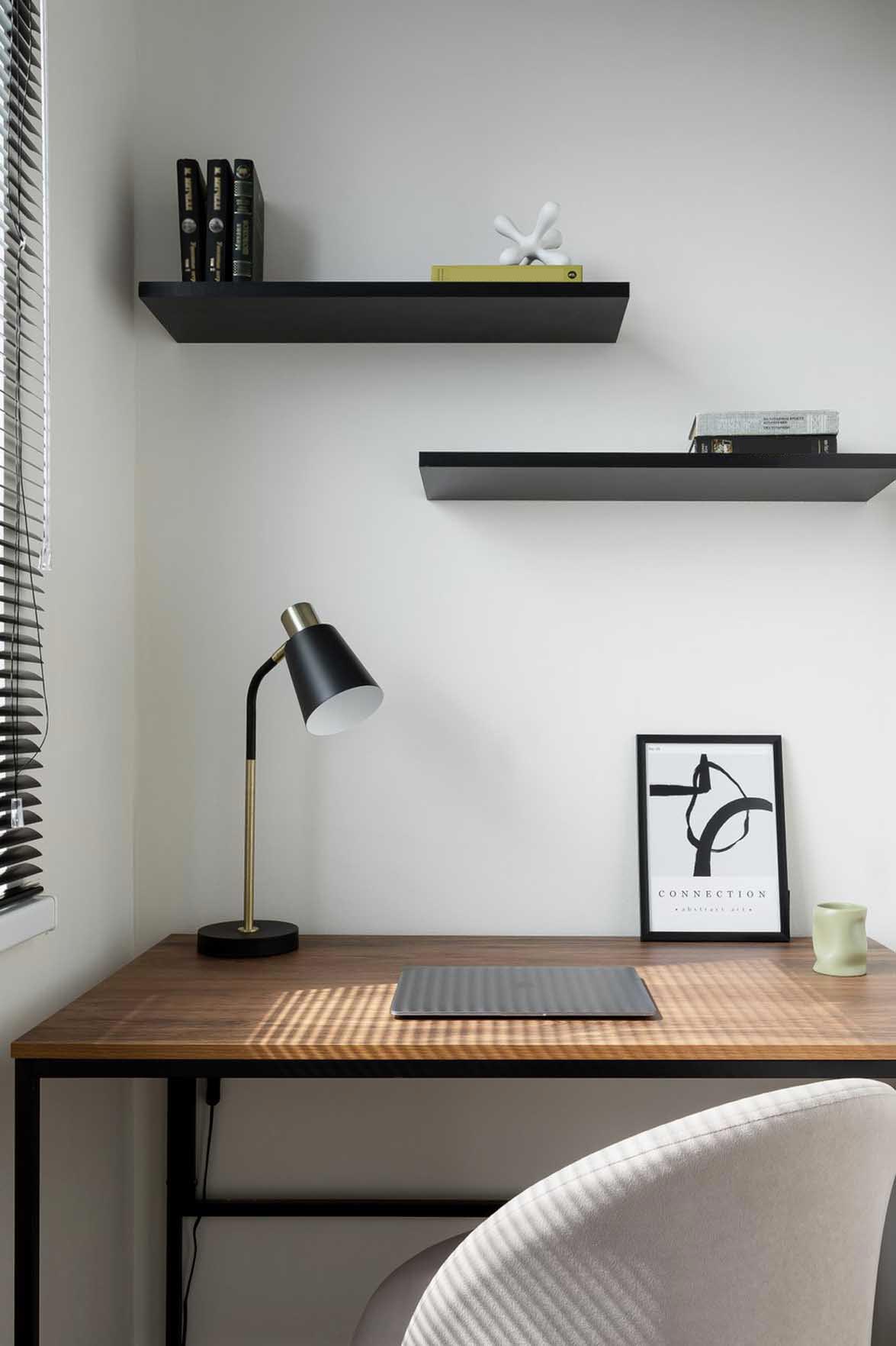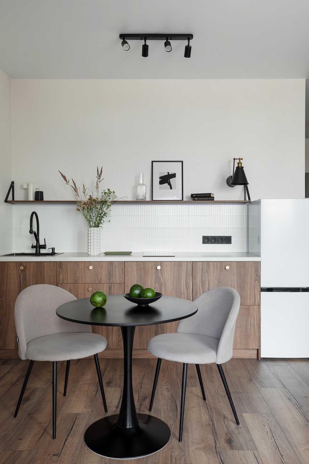 A falak egy részét tapétázták, másutt festették, a padlóra pedig laminált burkolat került. A konyhai hátfalat dombornyomott fehér csempével burkolták. A térbe fekete kiegészítőkkel vittek dinamikát: ilyenek a kerek étkezőasztal és a székek lábai, a szerelvények, a lámpatestek és a dekorációs tárgyak.