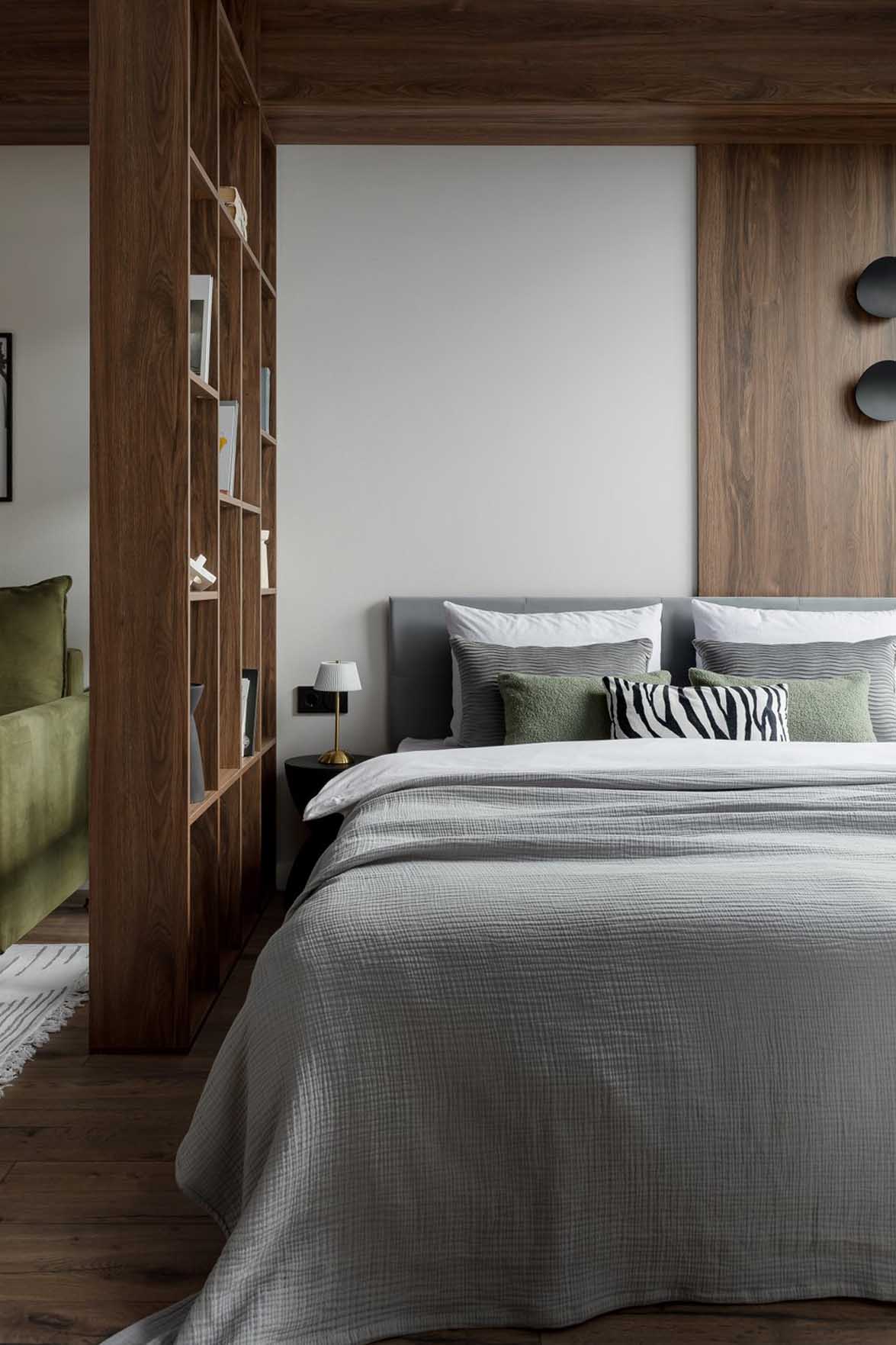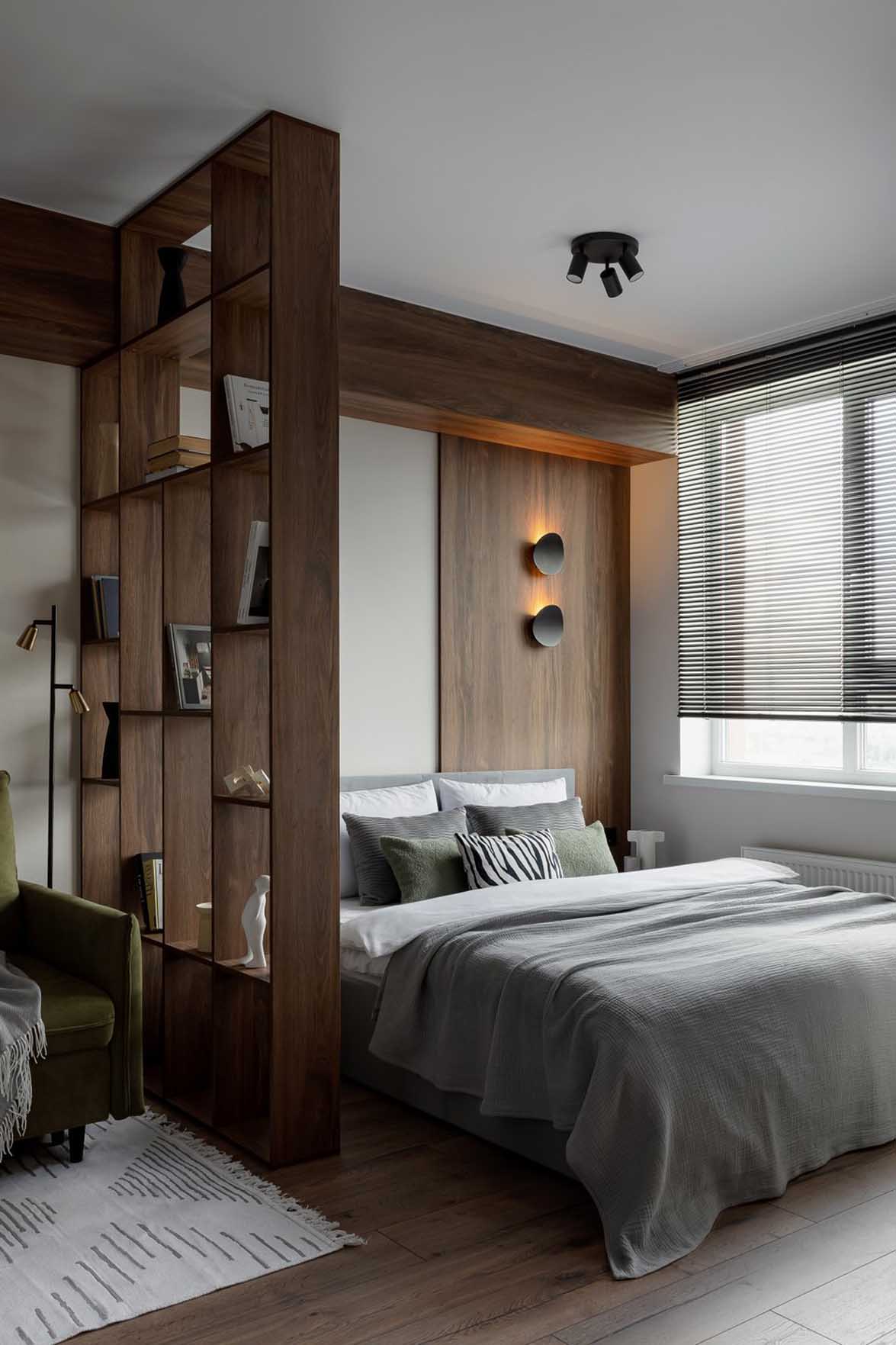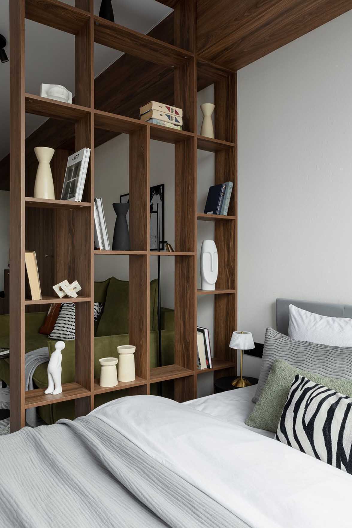 A hálót és a nappalit egy sötét fa hatású térelválasztó polcrendszer különíti el. A szerkezet egyedi gyártásban, laminált bútorlapból (Egger) készült.
