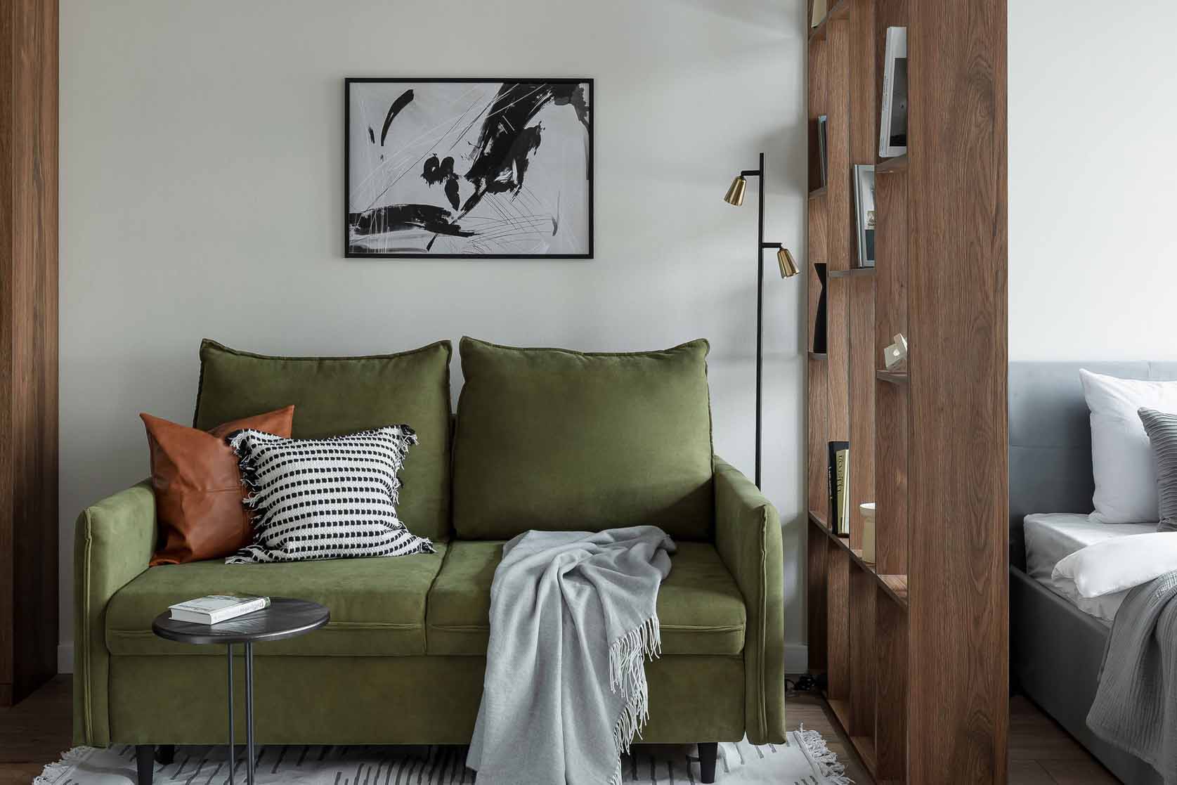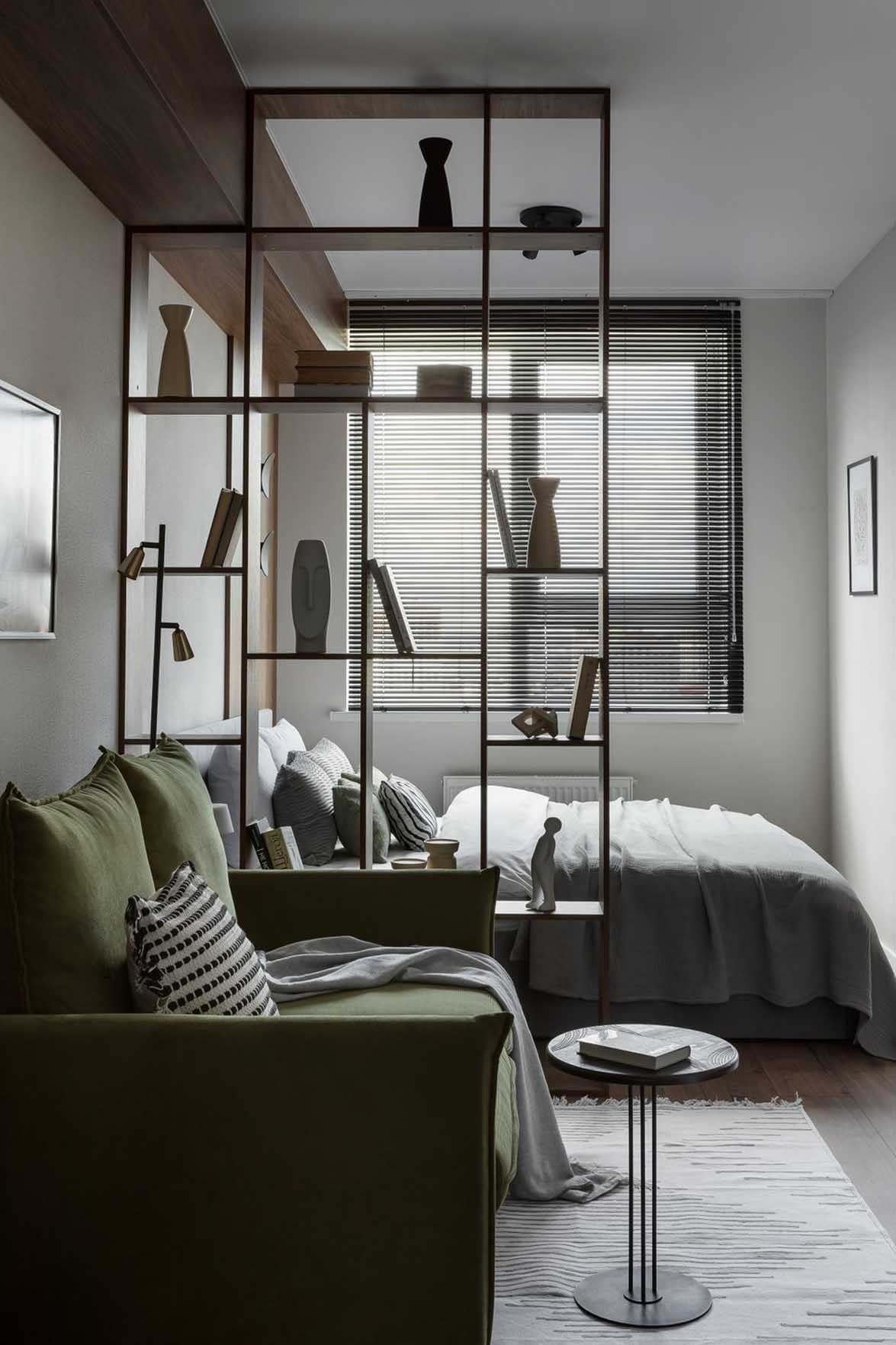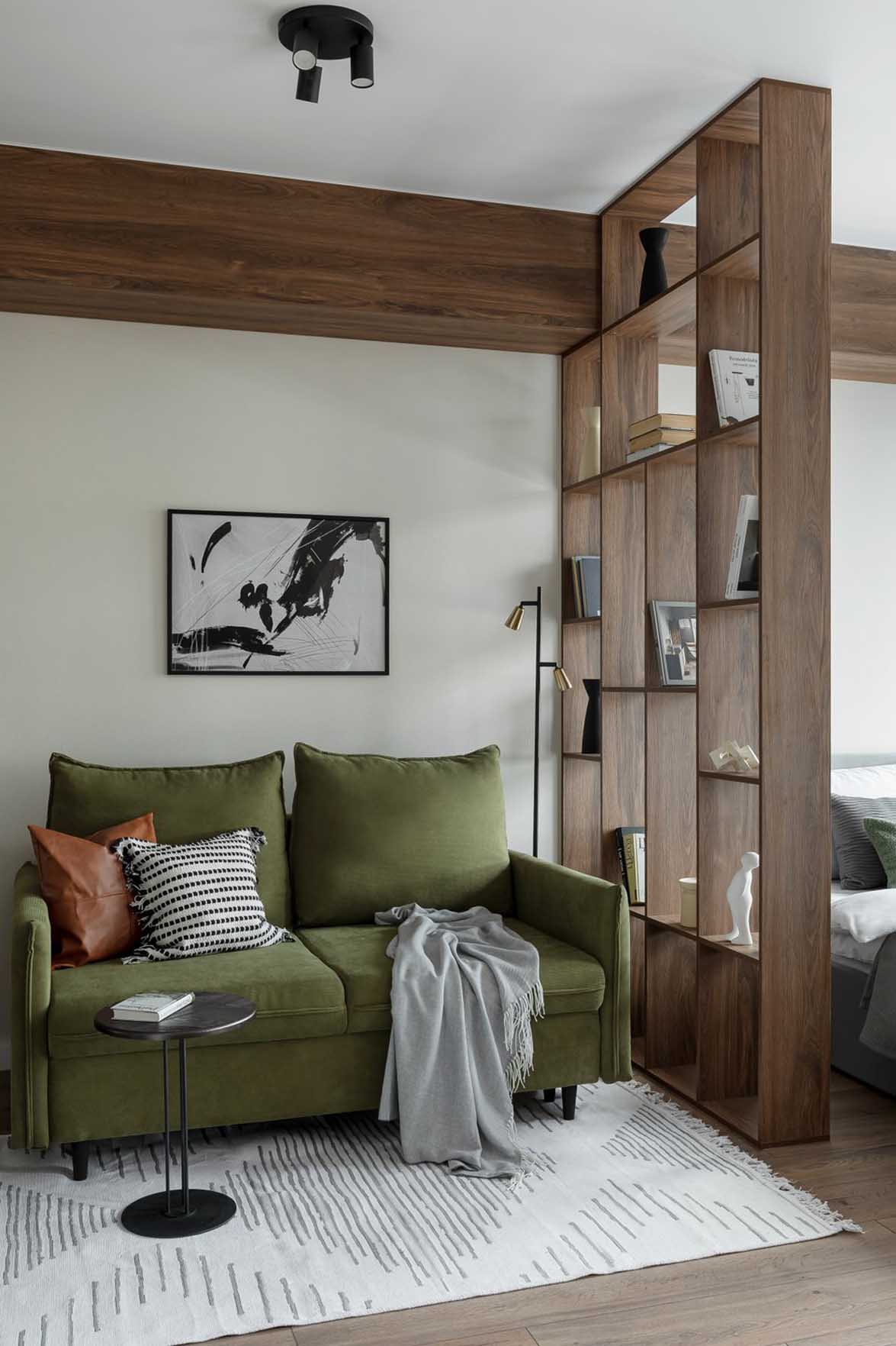 A hálót és a nappalit egy sötét fa hatású térelválasztó polcrendszer különíti el. A szerkezet egyedi gyártásban, laminált bútorlapból (Egger) készült.