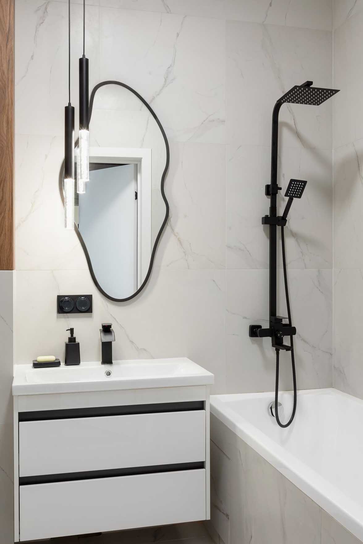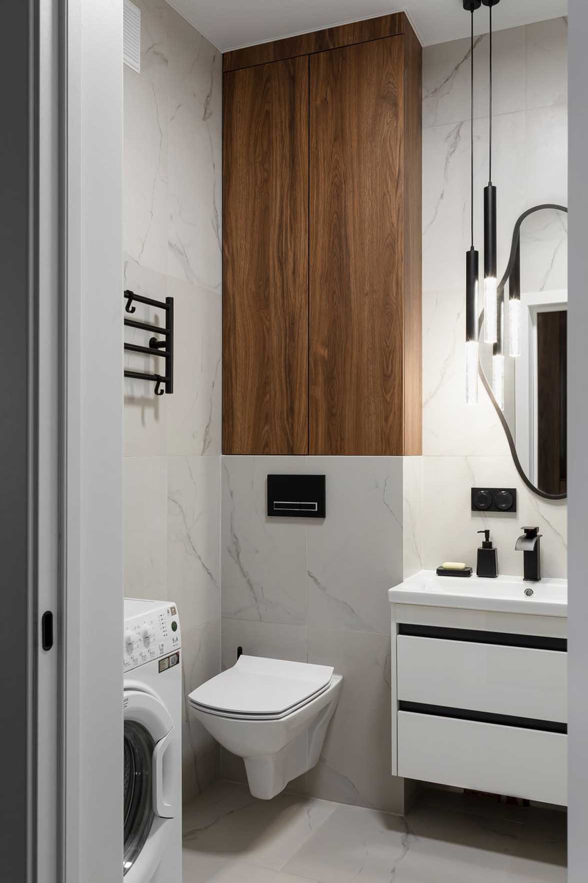A vizesblokk falait és padlóját világos, márványhatású greslappal burkolták. A tárolásról egy fiókos mosdószekrény, valamint a WC-tartály fölé épített szekrény gondoskodik.