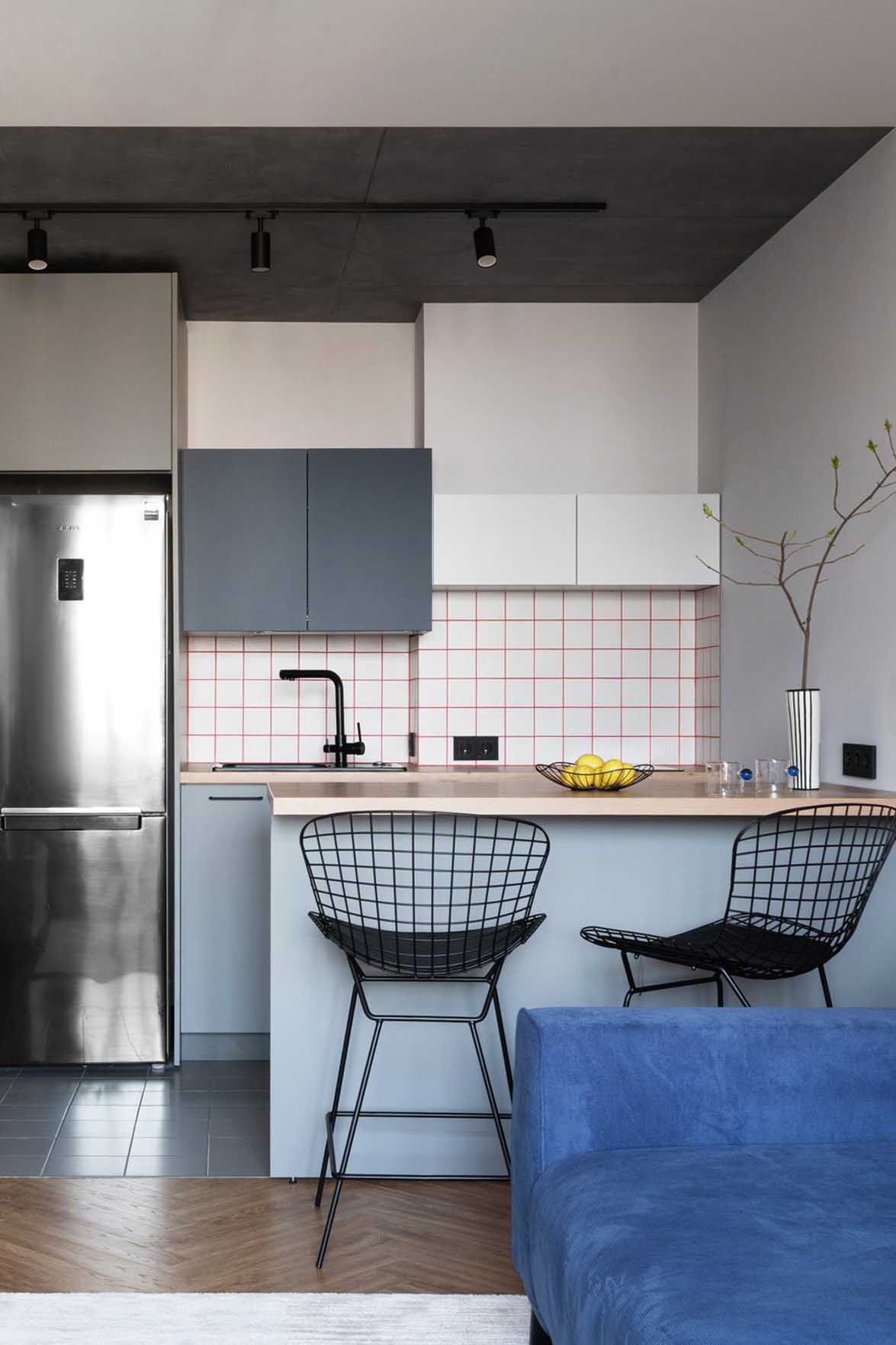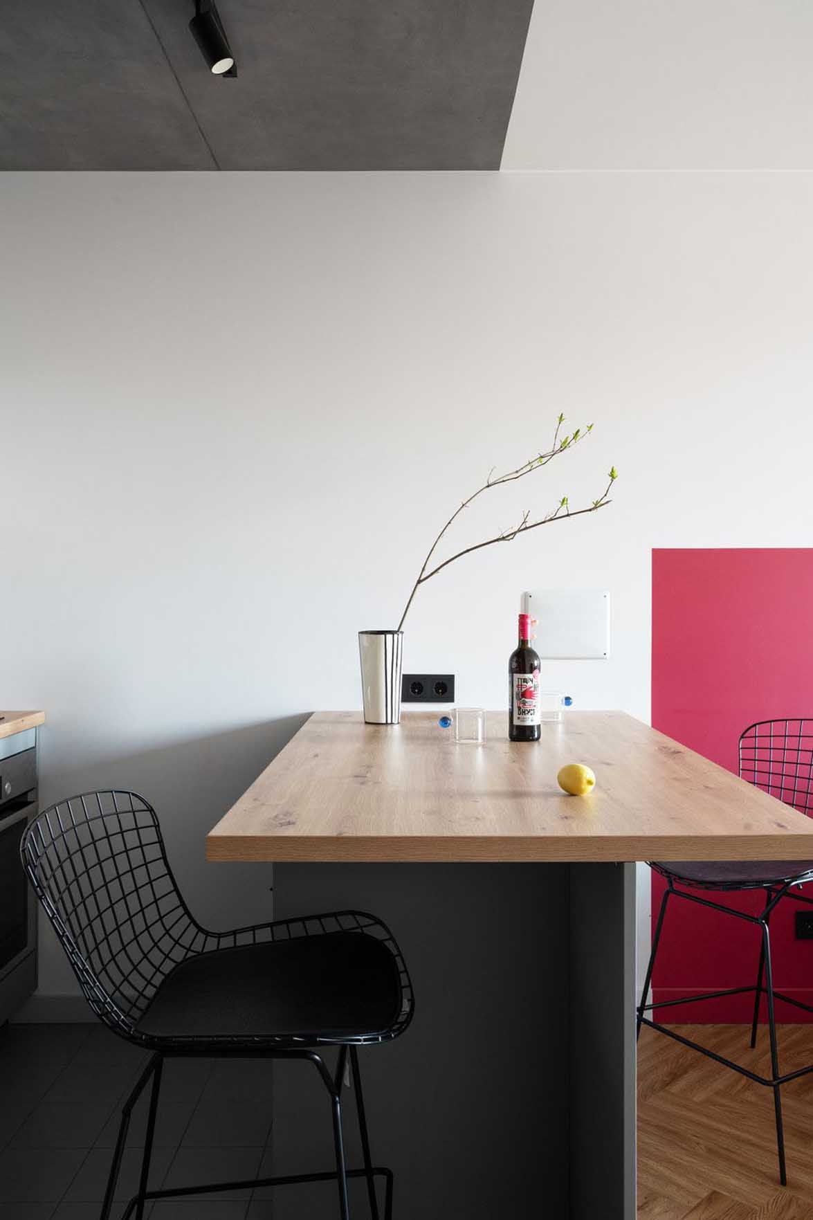 A konyhai falfelület eredetileg bonyolult, lépcsőzetes kialakítással rendelkezett. Ahelyett, hogy a teret gipszkartonnal egy síkba hozták volna – ami értékes centimétereket vett volna el az amúgy is kis alapterületből –, a tervező a konstruktivizmus esztétikáját követve egyedi, méretre készült beépítést alkalmazott. Ez a praktikus, tagolt bútorszerkezet egy konyhaszigettel kiegészülve minden szükséges funkciót magába foglal, sőt, még egy beépített borhűtő is helyet kapott benne.