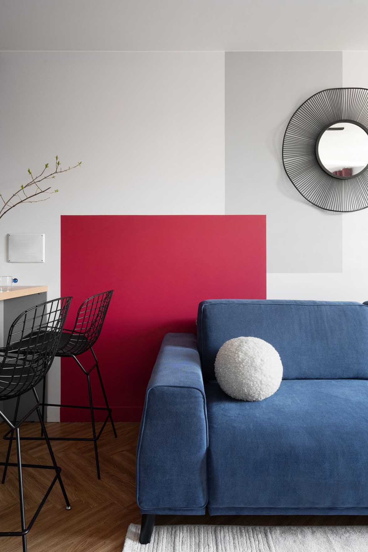 A kislakás tulajdonosa egy fiatal hölgy, aki munkája mellett borszakértőként is ismert. A lakásában szükségessé vált egy átfogó, teljes körű belsőépítészeti tervezés és felújítás. A koncepció alapját a 70-es évek esztétikája, a konstruktivizmus építészete és a holland absztrakció – különösen Piet Mondrian művészete – adta. A lakás színpalettájának alapja egy semleges, világos, enyhén gyöngyházfényű árnyalat, amelyet nagyméretű, aktív geometrikus színfoltok törnek meg. A fő akcentusszín egy különleges, mély borvörös árnyalat lett, amely finoman utal a tulajdonos hivatására és szenvedélyére.