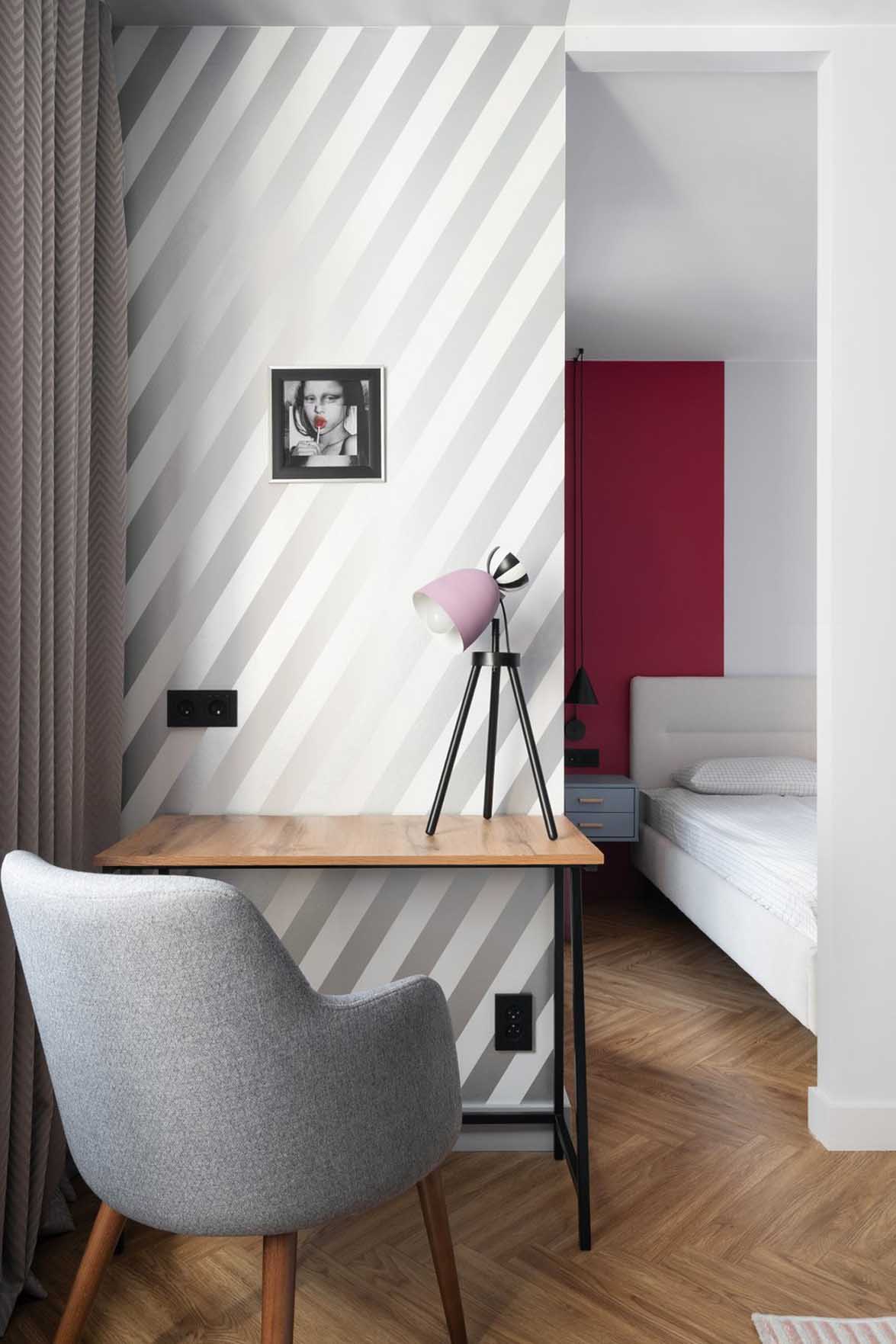 A konyhával egy légtérben lévő nappali kettős funkciót lát el: egyszerre szolgál pihenő- és munkazónaként, mivel a tulajdonos gyakran dolgozik otthonról. A tér ipari, mégis elegáns karakterét a dekoratív vakolattal kialakított, betonhatású mennyezet adja, amelyen a födémpanelek illesztéseit is élethűen imitálták. A pihenőrészt egy kényelmes kanapé és egy lábtartó puff jelöli ki, hátterében a falon megjelenő, Mondrian-festményeket idéző élénk színblokkokkal. A munkaterületet a színek és a burkolatok határozottan elválasztják a relaxációs zónától: a polcos elem és az íróasztal mögötti falfelületeken aktív, átlós csíkozású tapétát alkalmaztak, izgalmas, tükrözött elrendezésben. Ebből a központi térből nyílik az újonnan kialakított külön gardróbszoba is, amely a ruhatárolás mellett a mosógépet is elrejti.