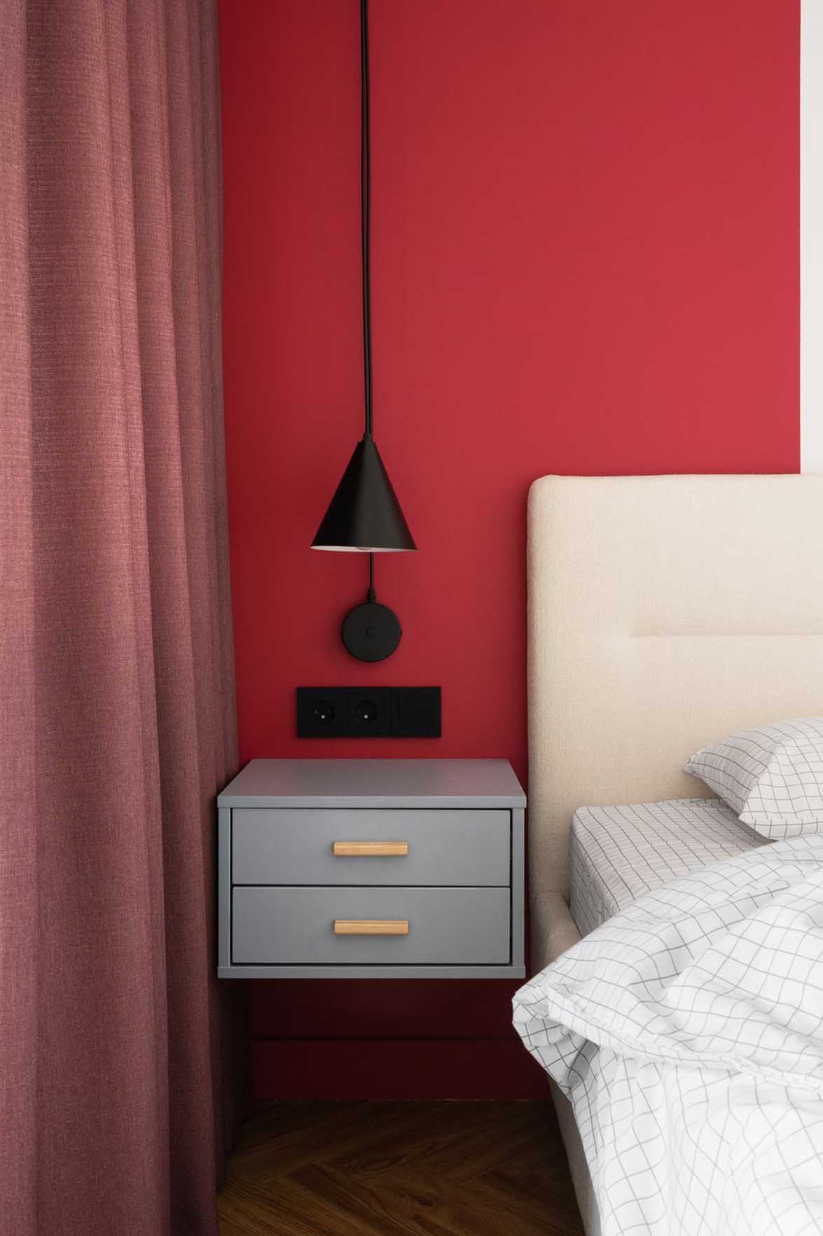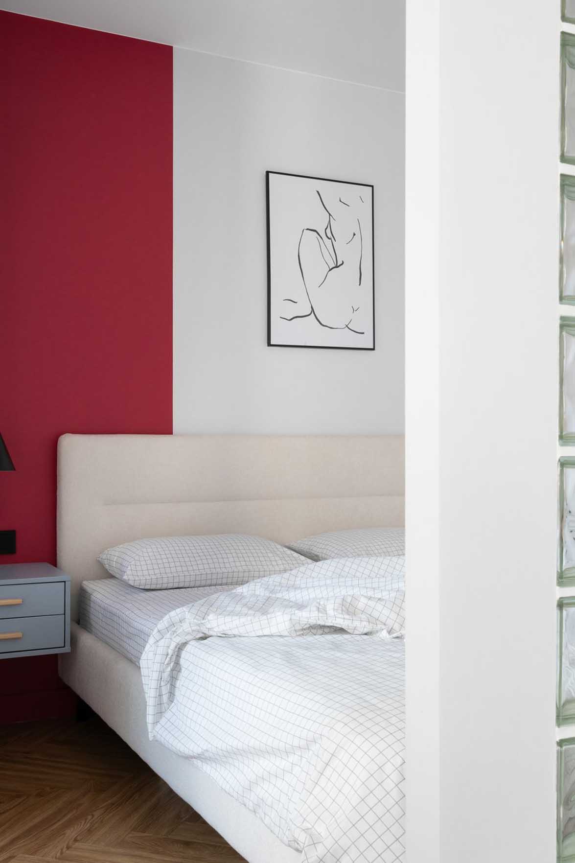 A kifejezetten egy főre tervezett lakás alvózónáját egy üvegtéglákból épített fal választja el a nappalitól. Ez a megoldás erősíti a 70-es évek atmoszféráját, miközben rengeteg természetes fényt enged be a hálófülkébe. A tér központjában egy letisztult, modern kárpitozott ágy áll. A fejtámla mögötti falfelületen visszaköszön a nappaliból már ismert karakteres borvörös szín, ami vizuális egységet teremt a lakás különböző pontjai között.