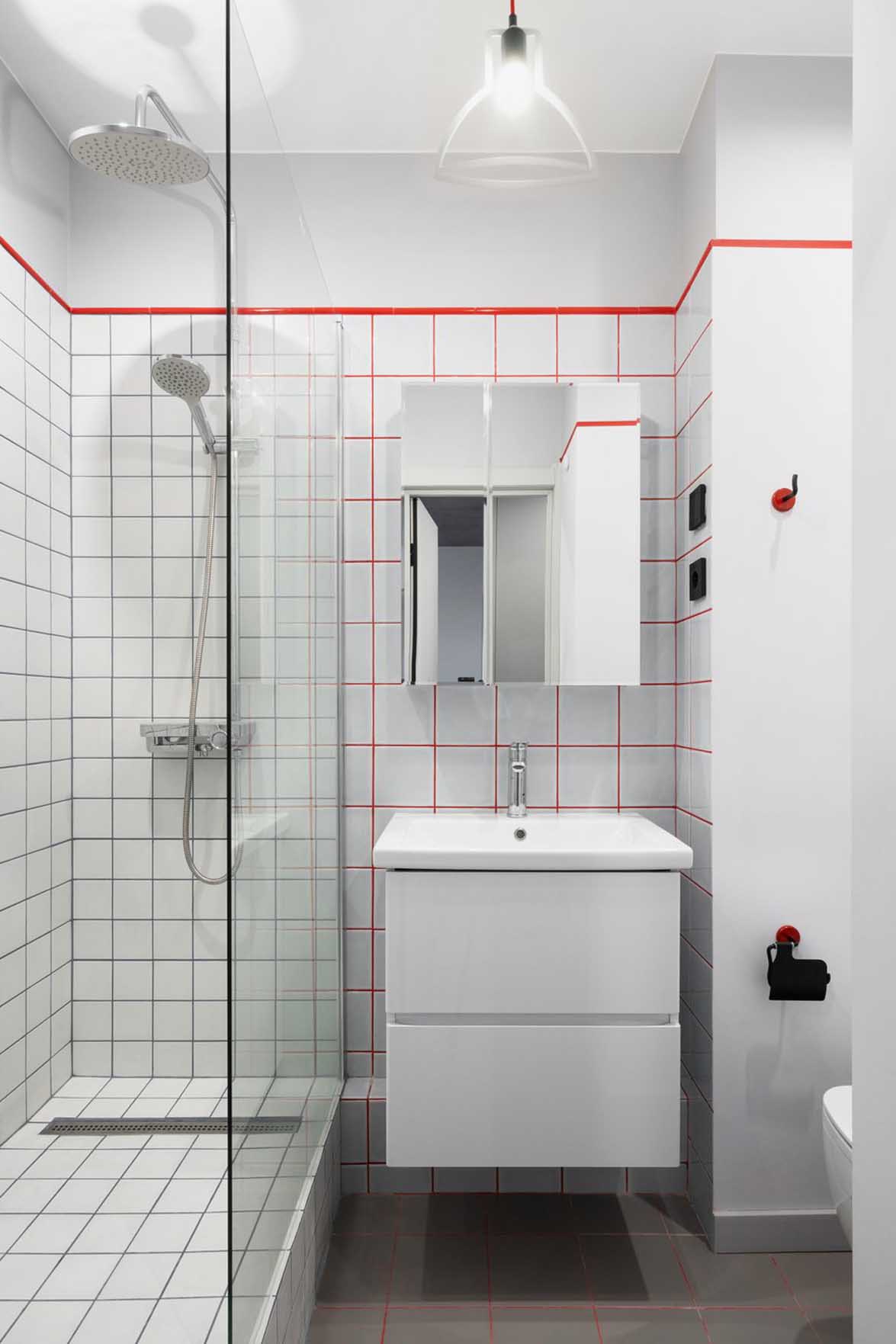 A mindössze 3 négyzetméteres fürdőszoba megtervezése komoly kihívást jelentett, mivel egy szellőzőakna és a gépészeti vezetékeket rejtő dobozolás miatt a helyiség nyolc sarokkal rendelkezett. A teret maximálisan kihasználva egy egyedi, épített zuhanyzót alakítottak ki. Ezen kívül kényelmesen elfért egy mosdótálcás mosdószekrény és egy fali toalett is. A vizuális fókusz a falburkolaton van: a tervező többféle formájú fali csempét kombinált, amelyeket egy élénk, kontrasztos színű fugázóval emelt ki a térben