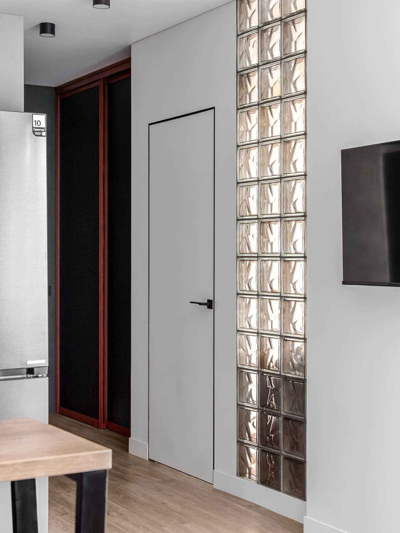 Az előszobában a fényáteresztő üvegtégla falrész kettős funkciót lát el: izgalmas válaszfalként jelenik meg a lakótér felé, és fényt enged a fürdőszobába. A falak itt festett felületképzést kaptak: a vlies alátétre felvitt, nedvességálló és színtartó festék nemcsak strapabíró, de egységes, nyugodt hátteret is biztosít a változatos textúrák számára.