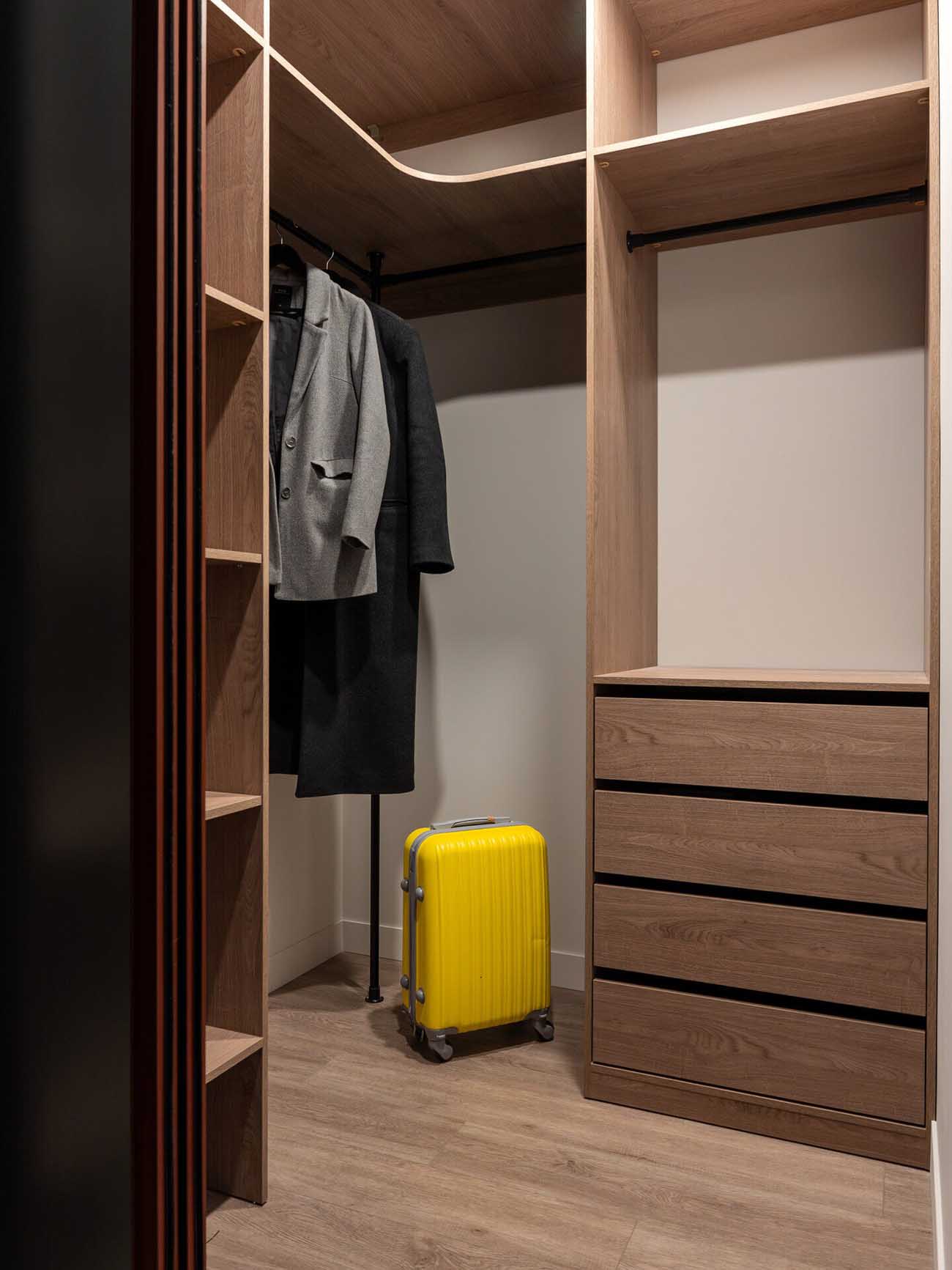 A tervezés kiindulópontját az eredeti alaprajz adta, amelyet a funkciók optimalizálása érdekében finoman átdolgoztak. A gépészetet és a falba süllyesztett szerelvényeket gipszkarton előtétfalak mögé rejtették, a zuhanyzót pedig egy épített dobogóval emelték ki. Az előszoba és a konyha közötti teret korábban elválasztó, nyílás feletti falszakaszt elbontották, így egy mennyezetig futó, légies átjáró jött létre, amely vizuálisan összekapcsolja a tereket. A közlekedőben a hagyományos szekrények helyett egy tágas, jól rendszerezhető gardróbot alakítottak ki, amelyet egy loft stílusú, tolóajtós térelválasztó szeparál el – ezáltal a tárolókapacitás maximalizálódott anélkül, hogy a bejárati zóna zsúfoltnak hatna.