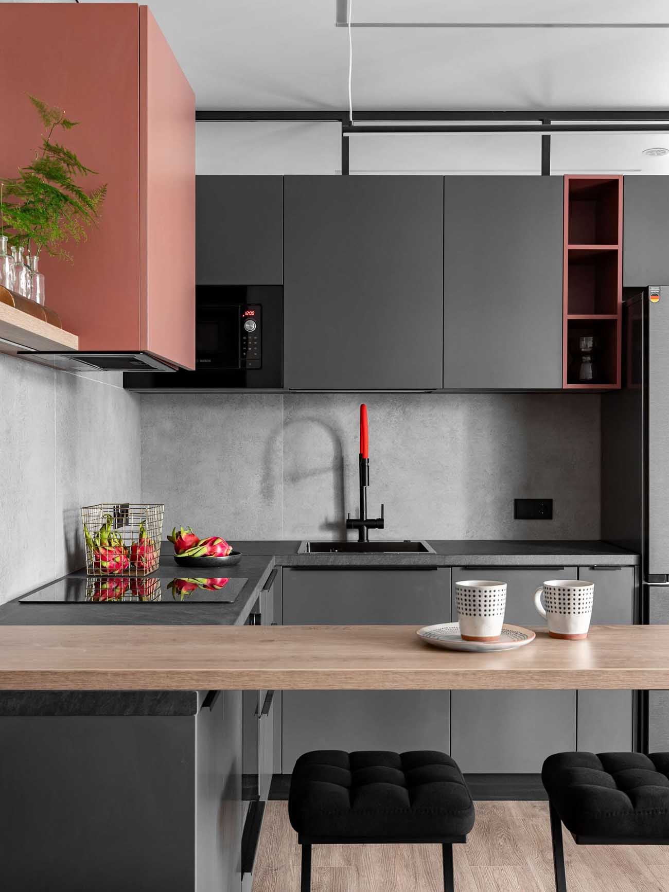 A konyhatechnológia elrendezése is az ergonómiát szolgálja: a magas kamraszekrények helyett a tervező egy szélesebb hűtőszekrény mellett döntött, a sütő a főzőlap alá került, a mikrohullámú sütőt pedig a felső szekcióba integrálták. A rendszerezést a mosogató melletti kihúzható rácsok, valamint a bárpult alatti nyitott polcrendszer segítik.