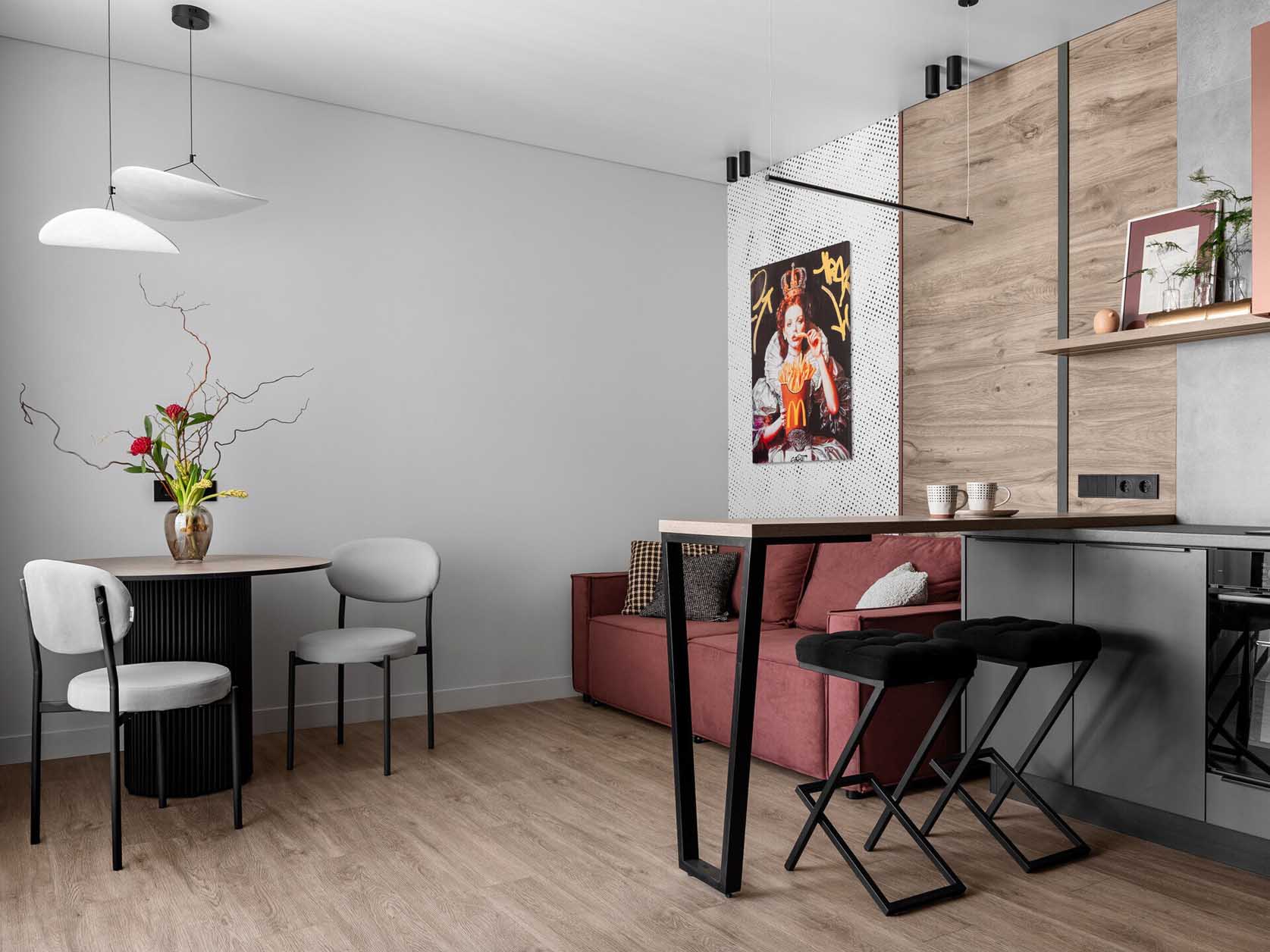 Egy 50 négyzetméteres, kompakt városi lakás enteriőrje született újjá azzal a céllal, hogy a komfort és a karakteres, egyedi vizuális világ egyszerre érvényesüljön. A megbízás egy olyan otthon megteremtését irányozta elő, amely ideális életteret biztosít egy fiatal gyermektelen pár számára: logikus térszervezéssel, bőséges tárolókapacitással, strapabíró felületekkel és olyan részletekkel, amelyek kiemelik az ingatlant a semleges, „biztonsági játékos” megoldások sorából.