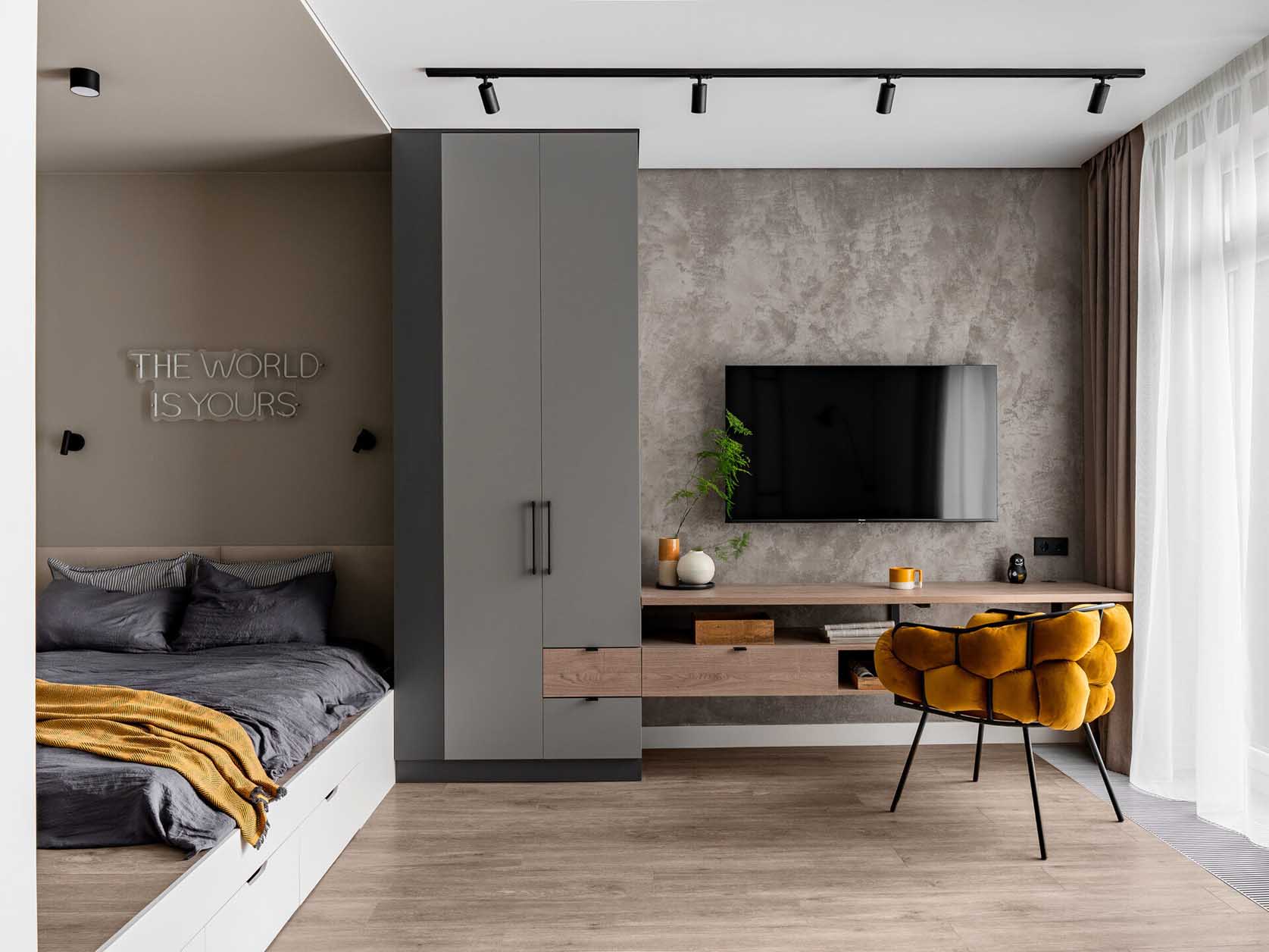A TV-fal egy multifunkcionális bútorkompozíció: egy gardróbszekrény választja le a hálófülkét a munkasaroktól. A szekrény oldalán kialakított nyitott polcok éjjeliszekrényként szolgálnak az ágy felől, míg a nappali felé a fiókos médiagység és egy kompakt home office sarok folytatja a sort. A falon megjelenő betonhatású dekorvakolatot a súrolófények emelik ki, fókuszponttá avatva ezt a felületet.