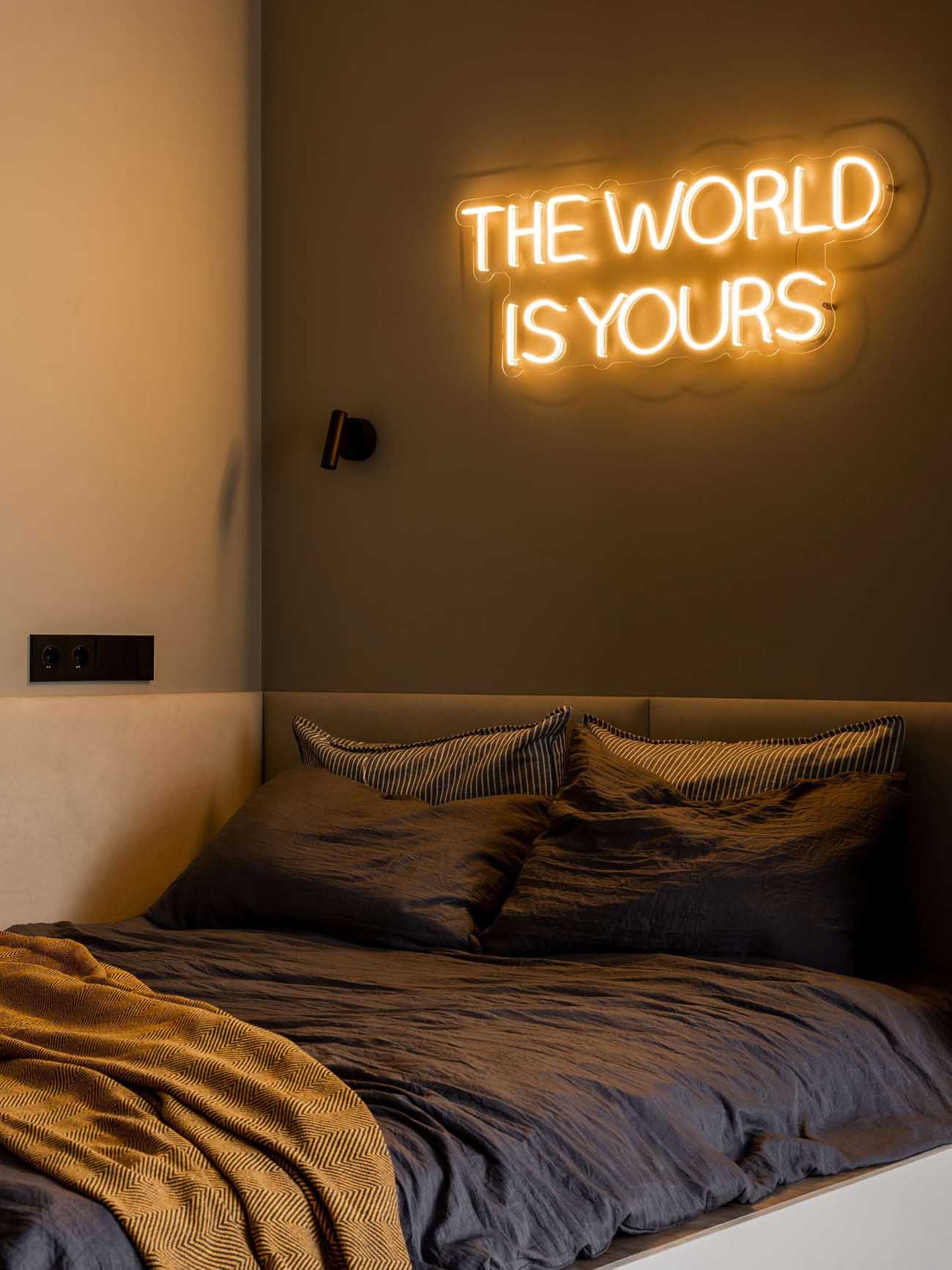 A hálórész egy intim falfülkében, egy épített dobogón kapott helyet. A dobogó nem csupán szinteltolás, hanem egy komplex tárolórendszer is: a szerkezetben mély fiókok nyelik el az ágyneműt, a felnyitható ágyrács alatt pedig bőröndök és nagyobb tárgyak számára alakítottak ki helyet. Ez a megoldás tehermentesíti a lakás többi részét a szekrényektől, így a nappali zóna levegős és tágas maradhatott.