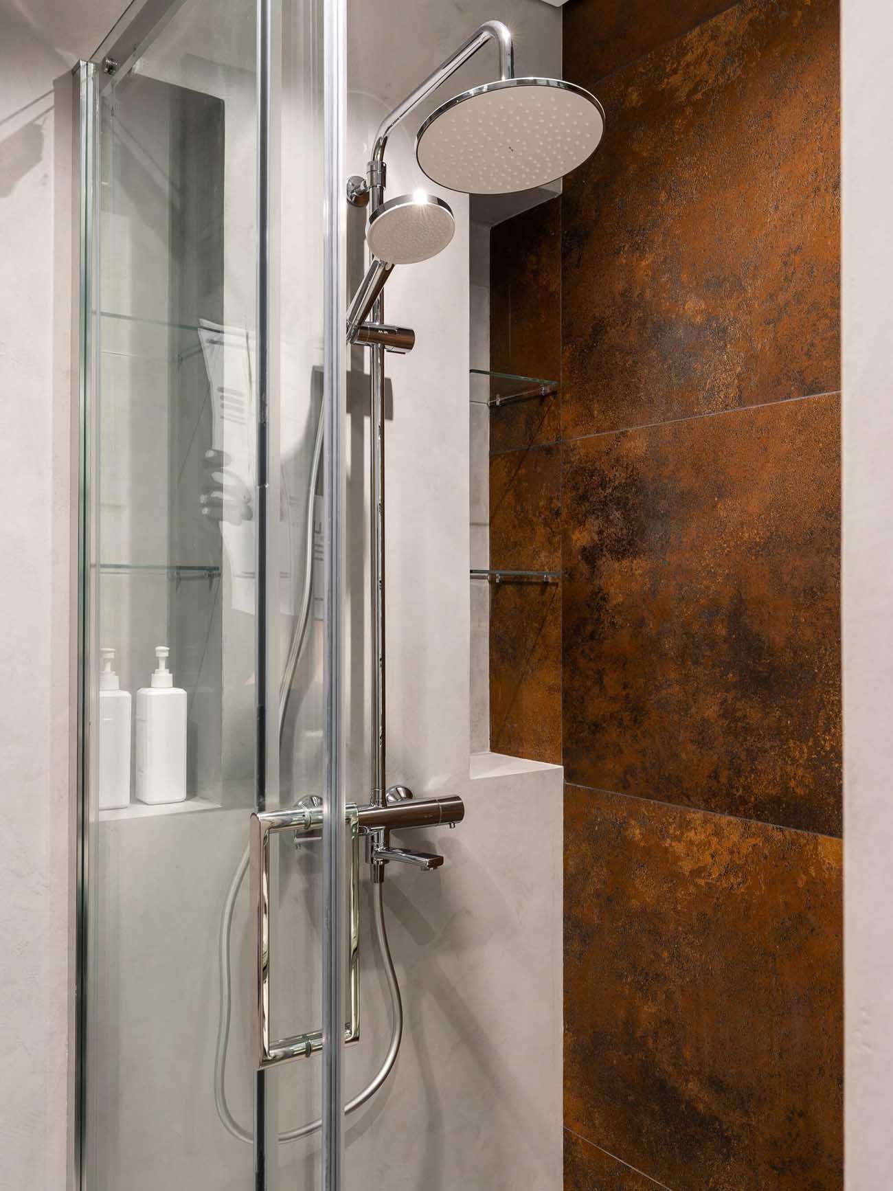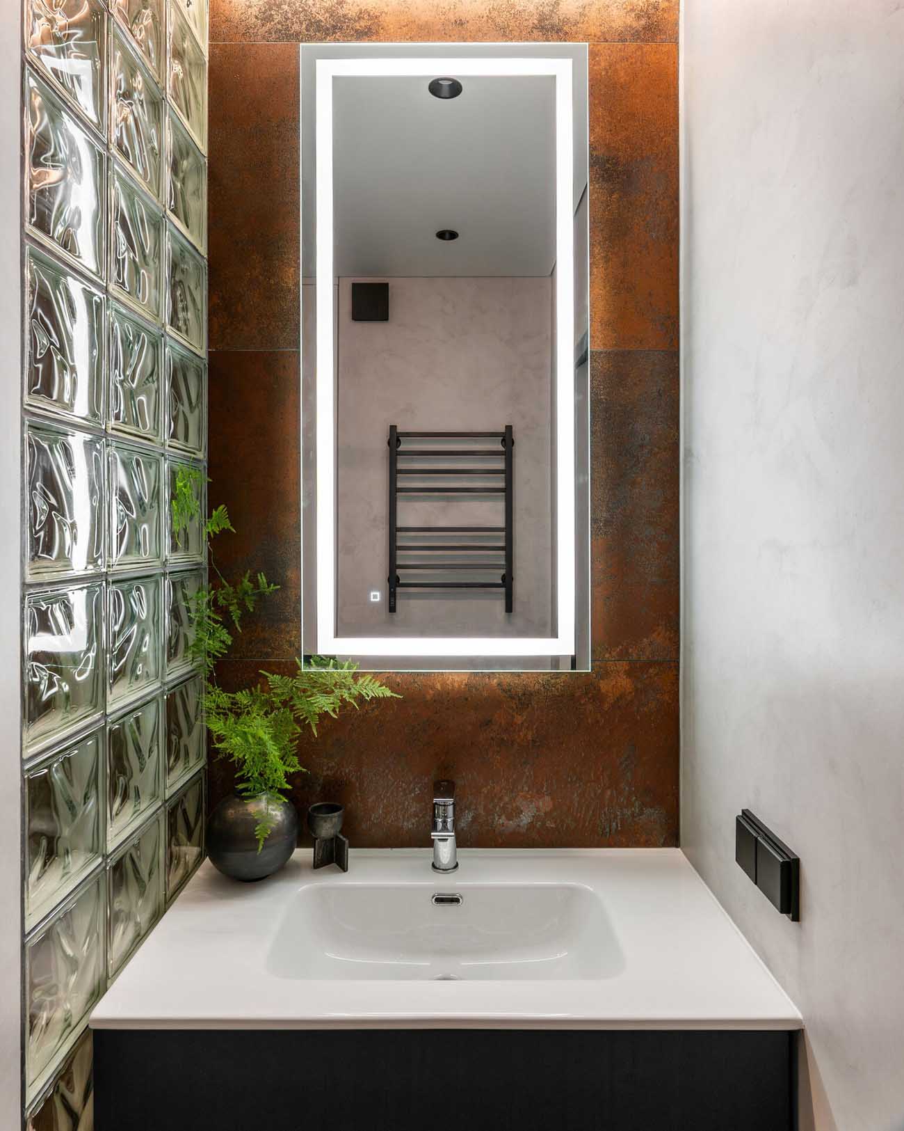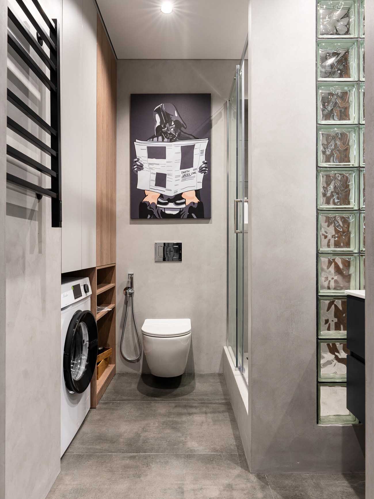 A fürdőszoba kialakítása a kompakt luxus jegyében zajlott. A mosdó mellett az üvegtégla fal vizuális kapcsolatot teremt az előszobával. A falba szerelt gépészetet gipszkarton fal rejti, amelyben a klasszikus szekrény helyett egy mikrocementtel burkolt, poszterrel díszített falfülke biztosítja a tárolást.