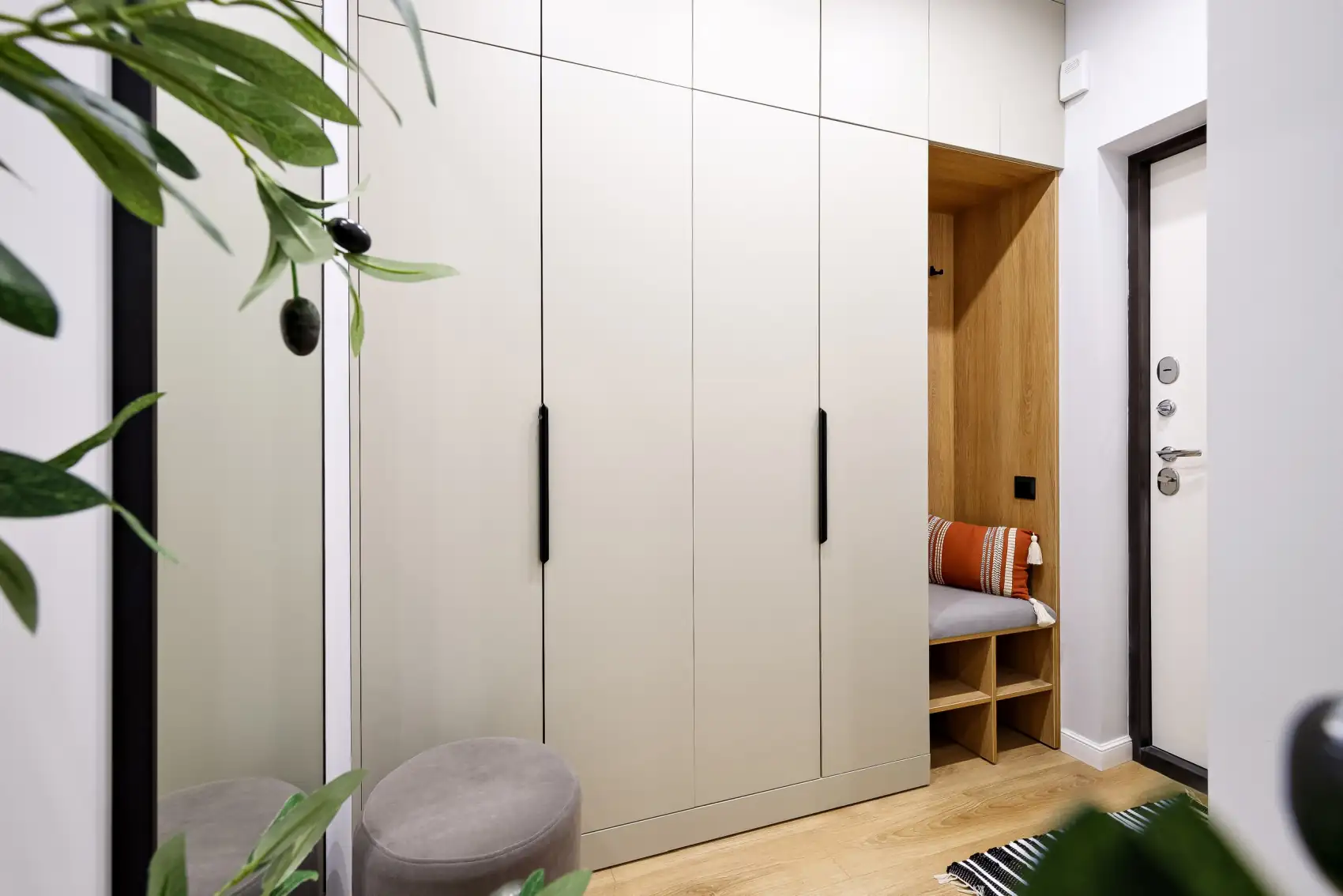 Az előszoba visszafogott kialakításával, azonnal a rend és az otthonosság érzetét sugározza a belépőnek. A tágas, letisztult frontokkal és kontrasztos fekete fogantyúkkal ellátott beépített szekrény bőséges tárolóhelyet biztosít a mindennapi használati tárgyaknak. A kárpitozott ülőkével és nyitott polcokkal kialakított kisebb zóna a kényelmet szolgálja, míg a fa elemek melegséget visznek az előtérbe.