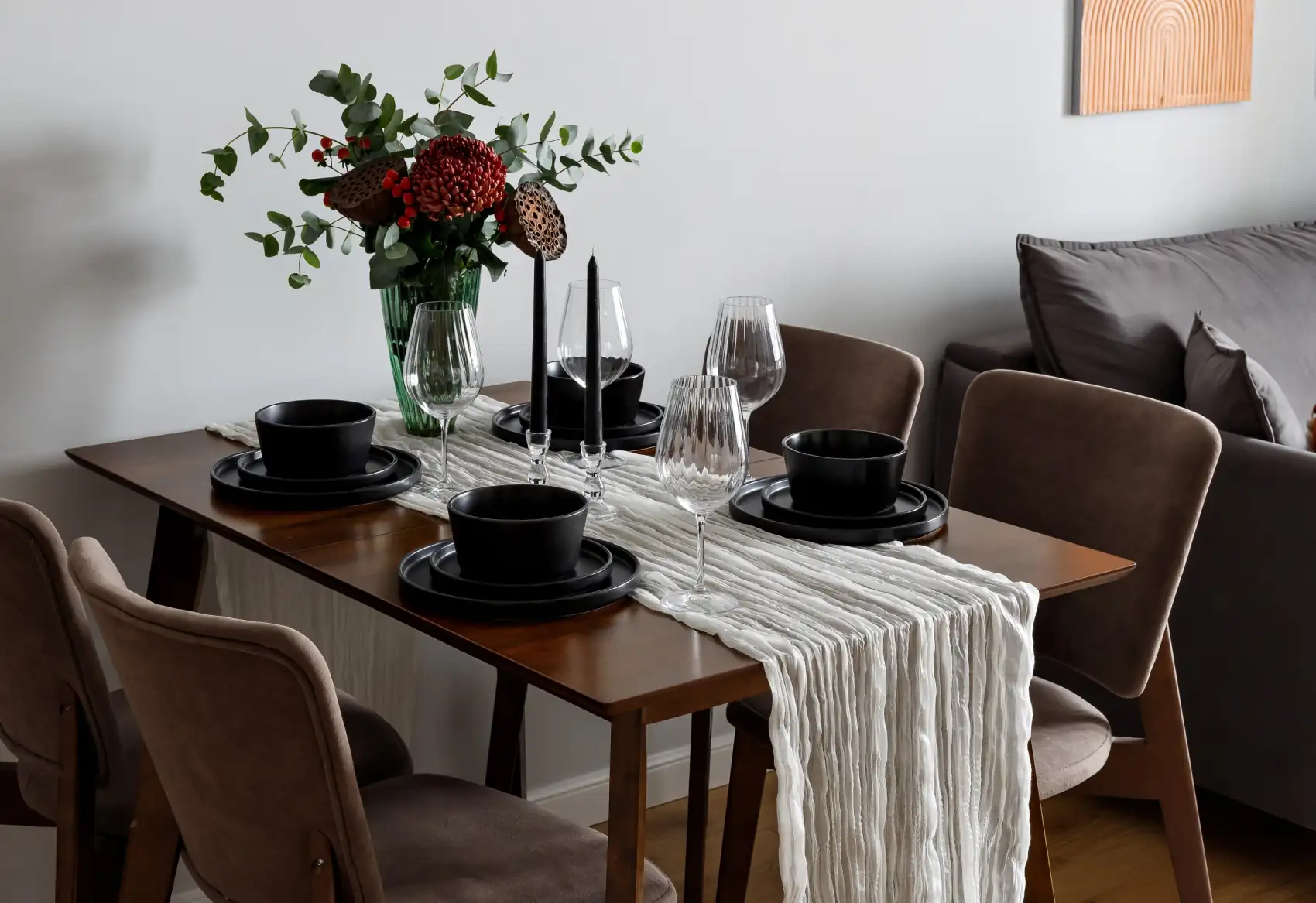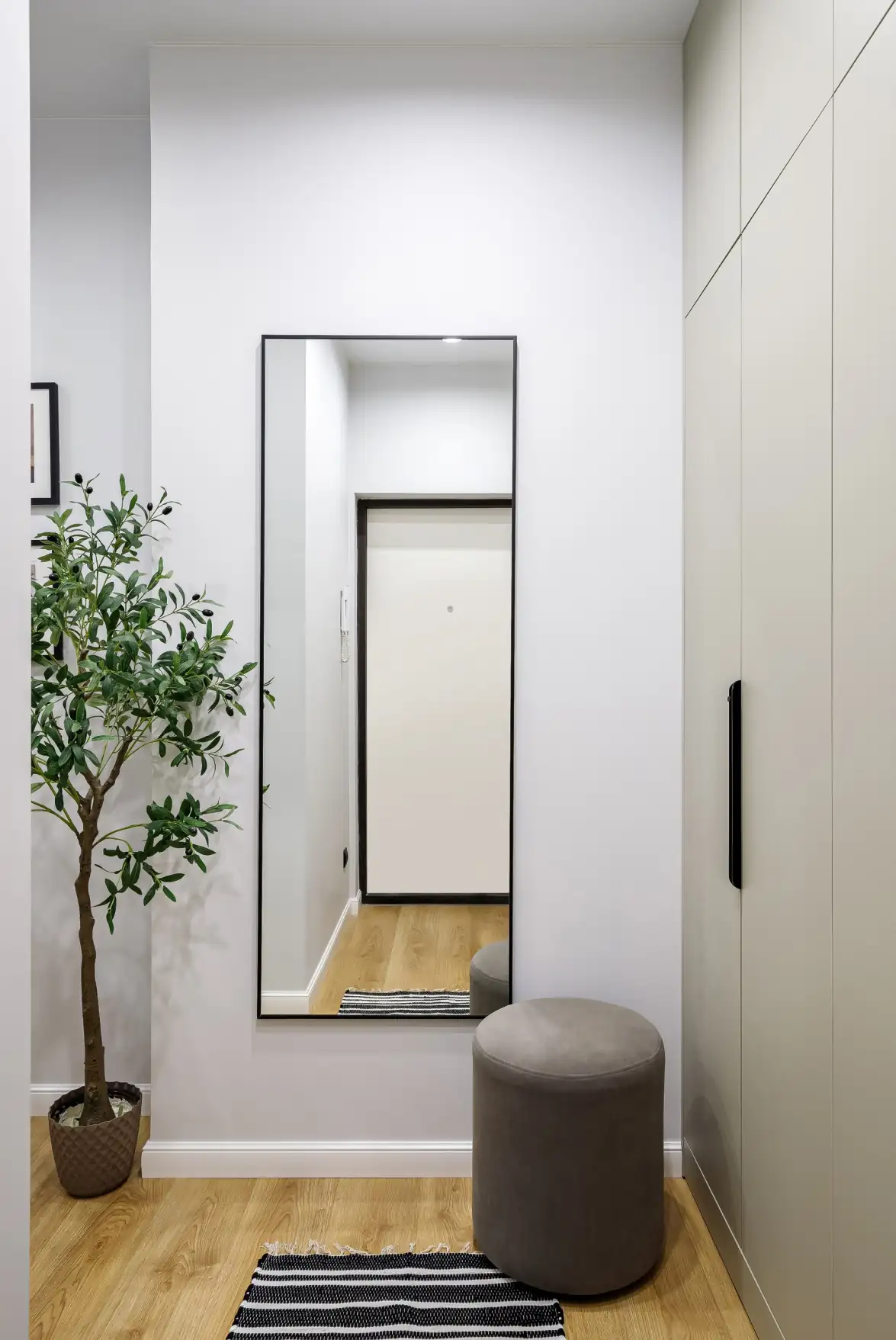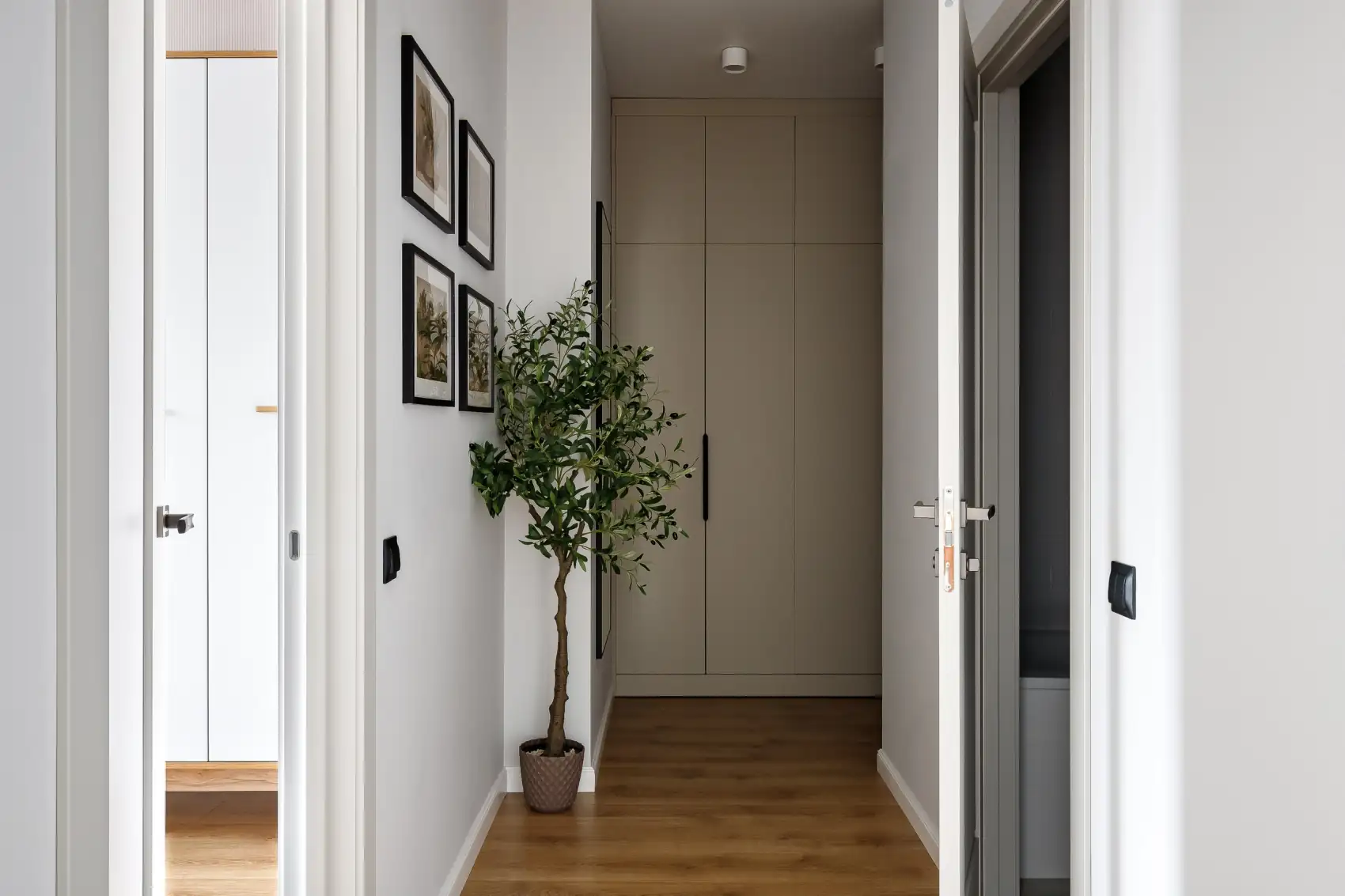 A falon egy négy, fekete keretes képből álló galéria található, amely tökéletes összhangban van a teret vizuálisan tágító, nagyméretű tükörrel. A hangsúlyos részletek, mint a díszpárnák és a puff, teljessé teszik a kompozíciót, így a tér nemcsak funkcionális, hanem kifejezetten elegáns is marad.