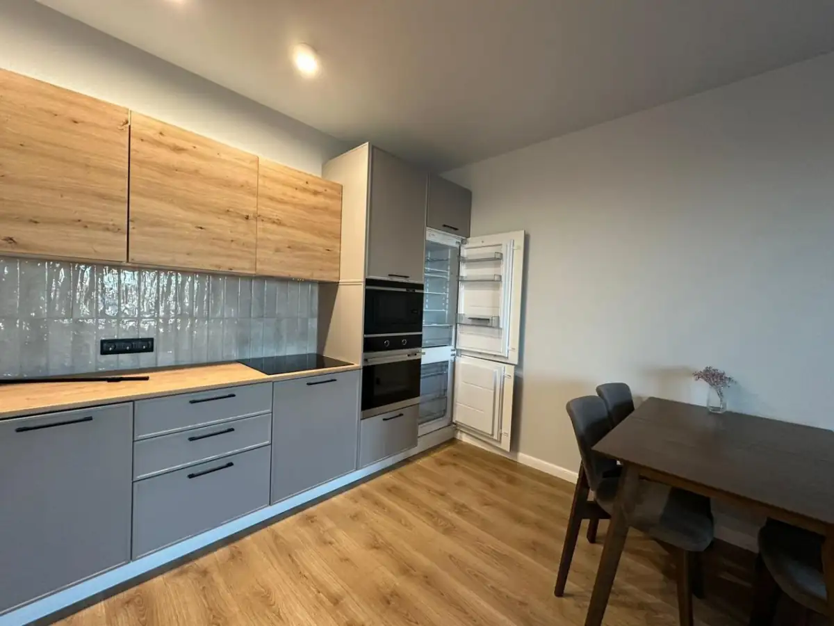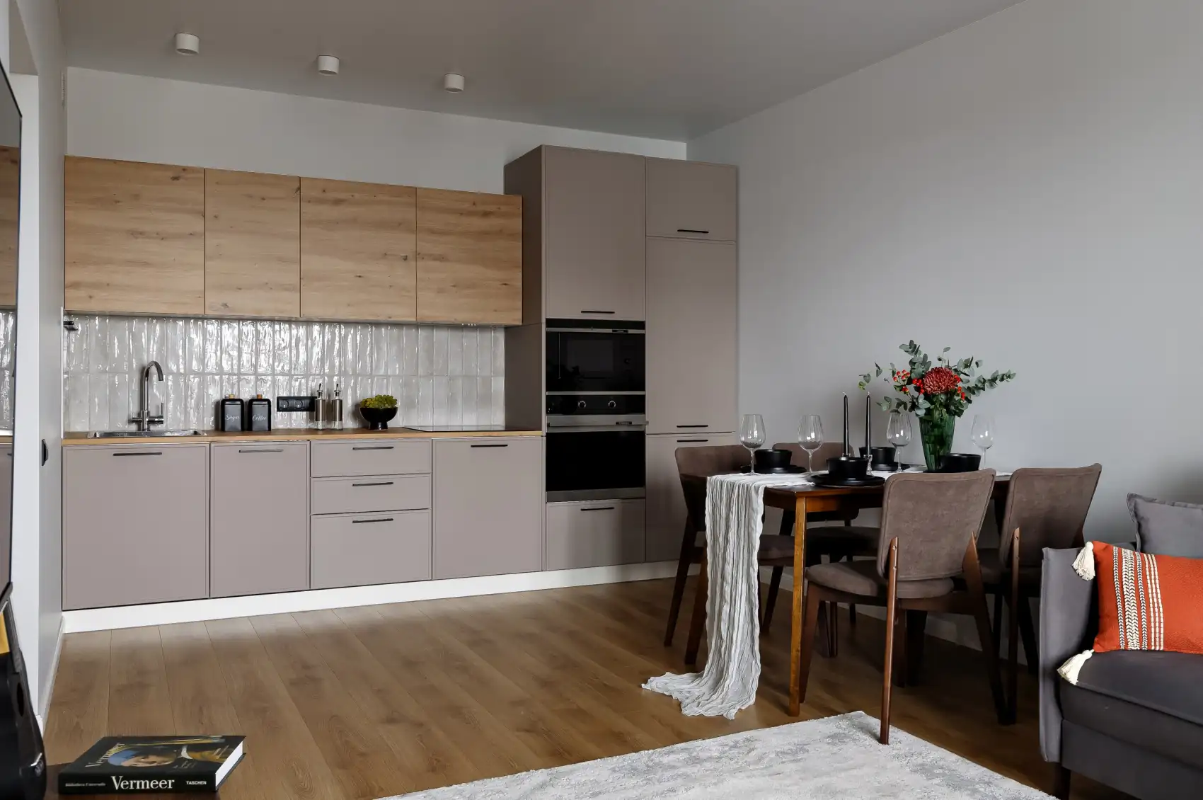 A konyha és a nappali egybenyitott tere modern stílusban, meleg, természetes árnyalatokkal lett kialakítva. A konyhabútor matt bézs frontjait fahatású elemek egészítik ki, a textúrát pedig a dombormintás kerámia hátfal adja meg. A kizárólag beépített gépek használata prémium érzetet kölcsönöz a lakásnak. Az étkezőrészt egy fa étkezőasztal és sötétbarna, kárpitozott székek alkotják.