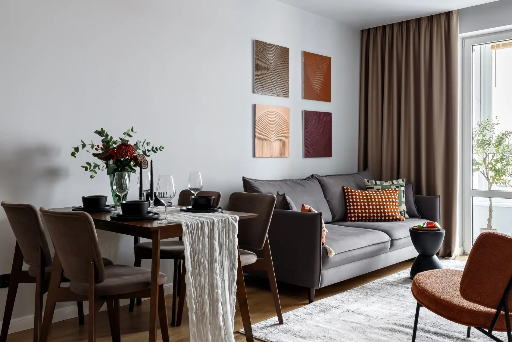 A lakás korábban már kapott egy modern és mindenre kiterjedő felújítást, és alap berendezést is tartalmazott, de teljesen hiányzott az otthonosság és a dekorációban egyáltalán nem voltak karakteres, hangsúlyos részletek. A cél egy stílusos, kényelmes enteriőr kialakítása volt természetes árnyalatokkal – olívazöld, terrakotta, bordó –, valamint a természetes anyagok, markáns textúrák és a kézműves dekorációk ötvözésével.