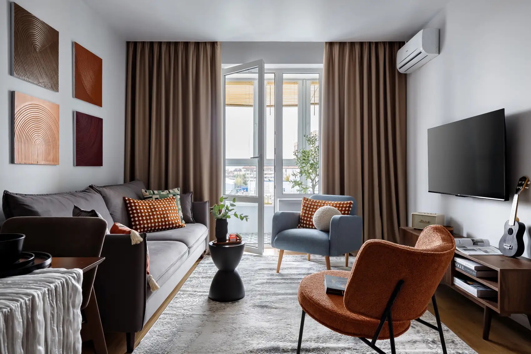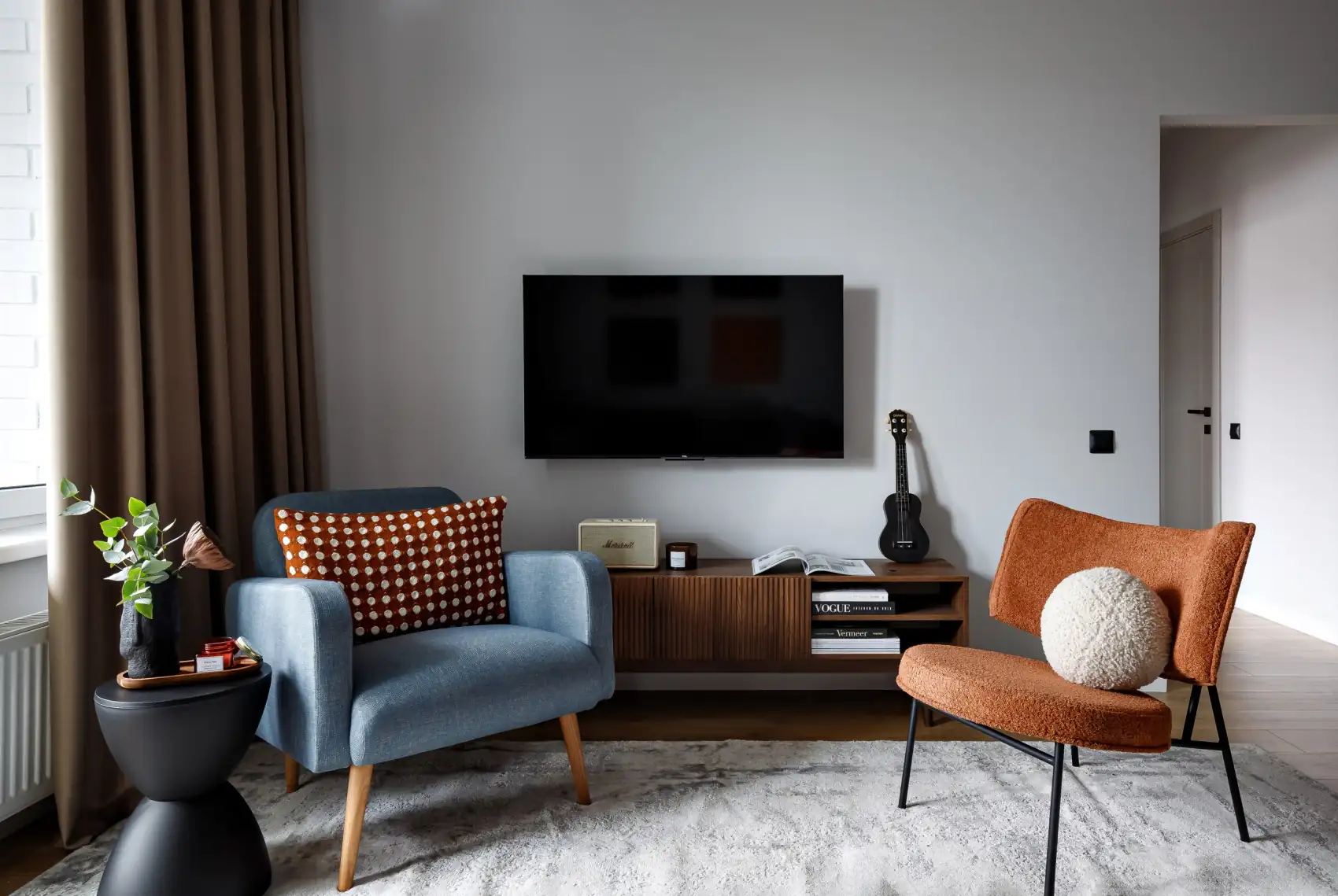 A nappaliban egy letisztult szürke kanapé kapott helyet stílusos díszpárnákkal, míg a terrakotta és kék árnyalatú fotelek az otthonosságot fokozzák. A falat hangsúlyos színű, dombormintás panelek díszítik, a funkcionális enteriőr képét pedig egy nyitott fa polcrendszer és a TV-zóna teszi teljessé.
