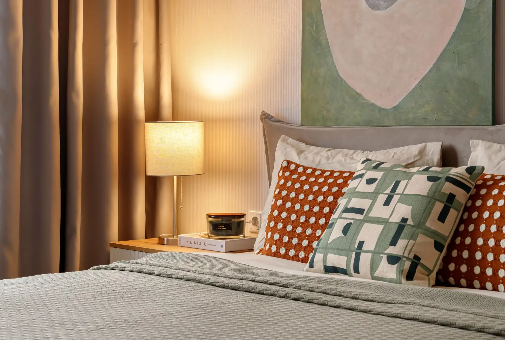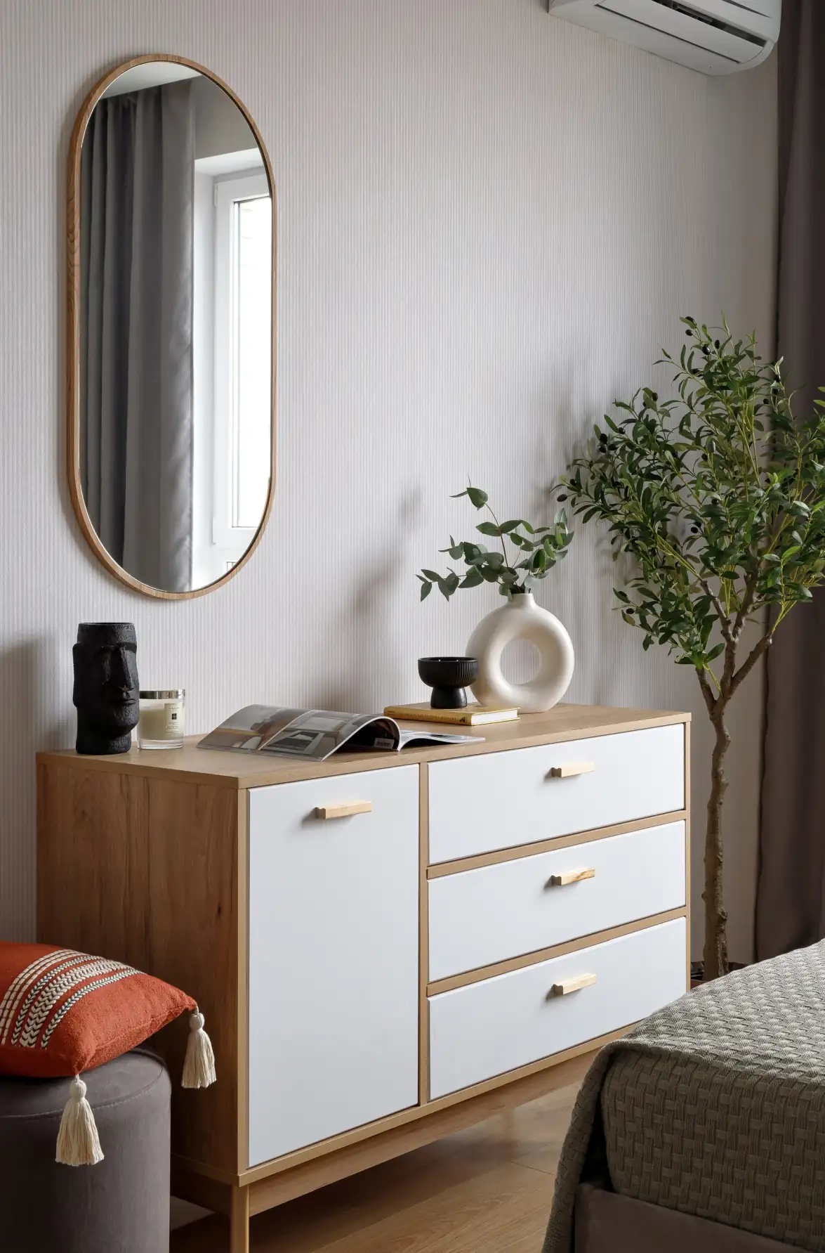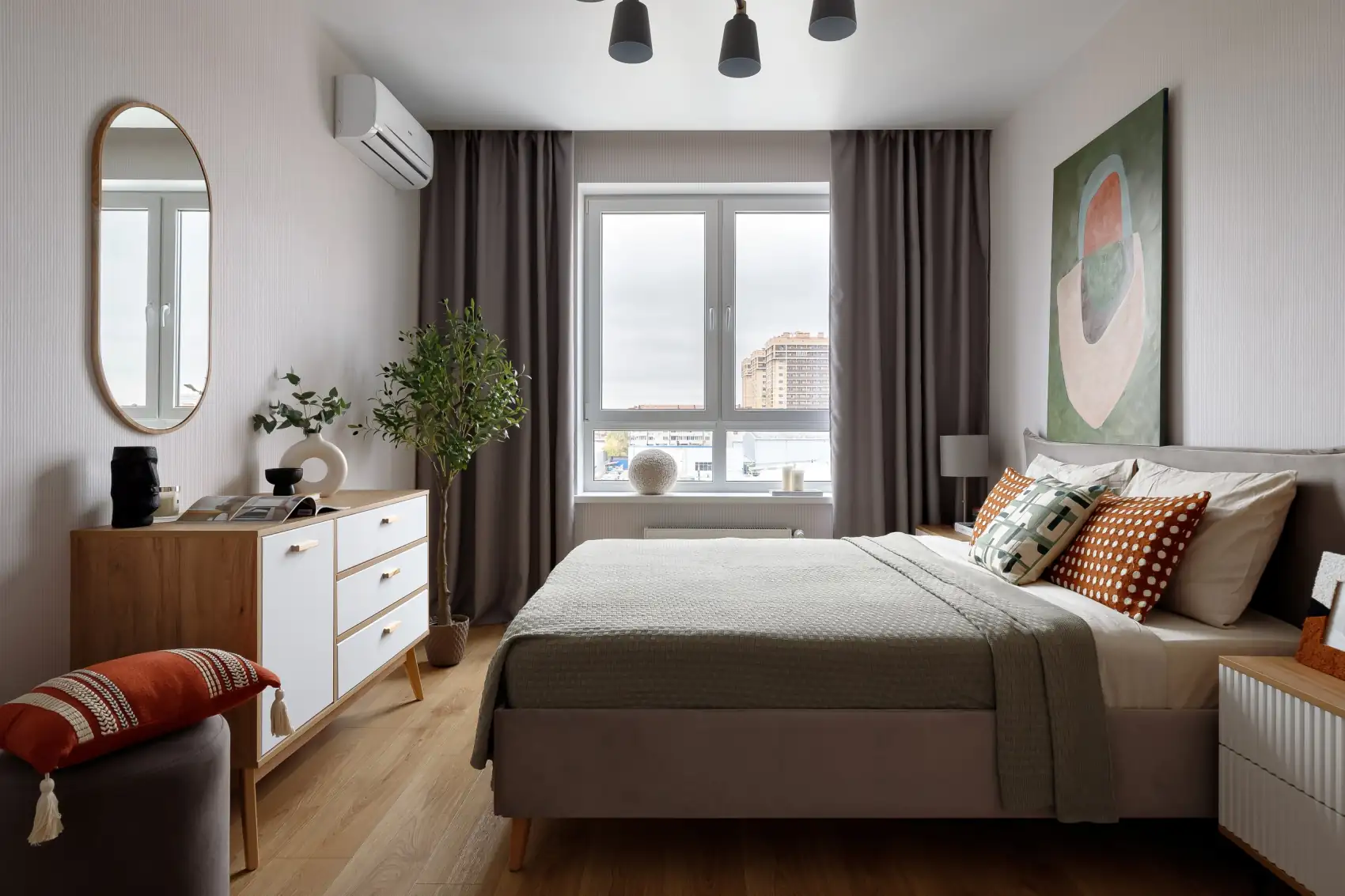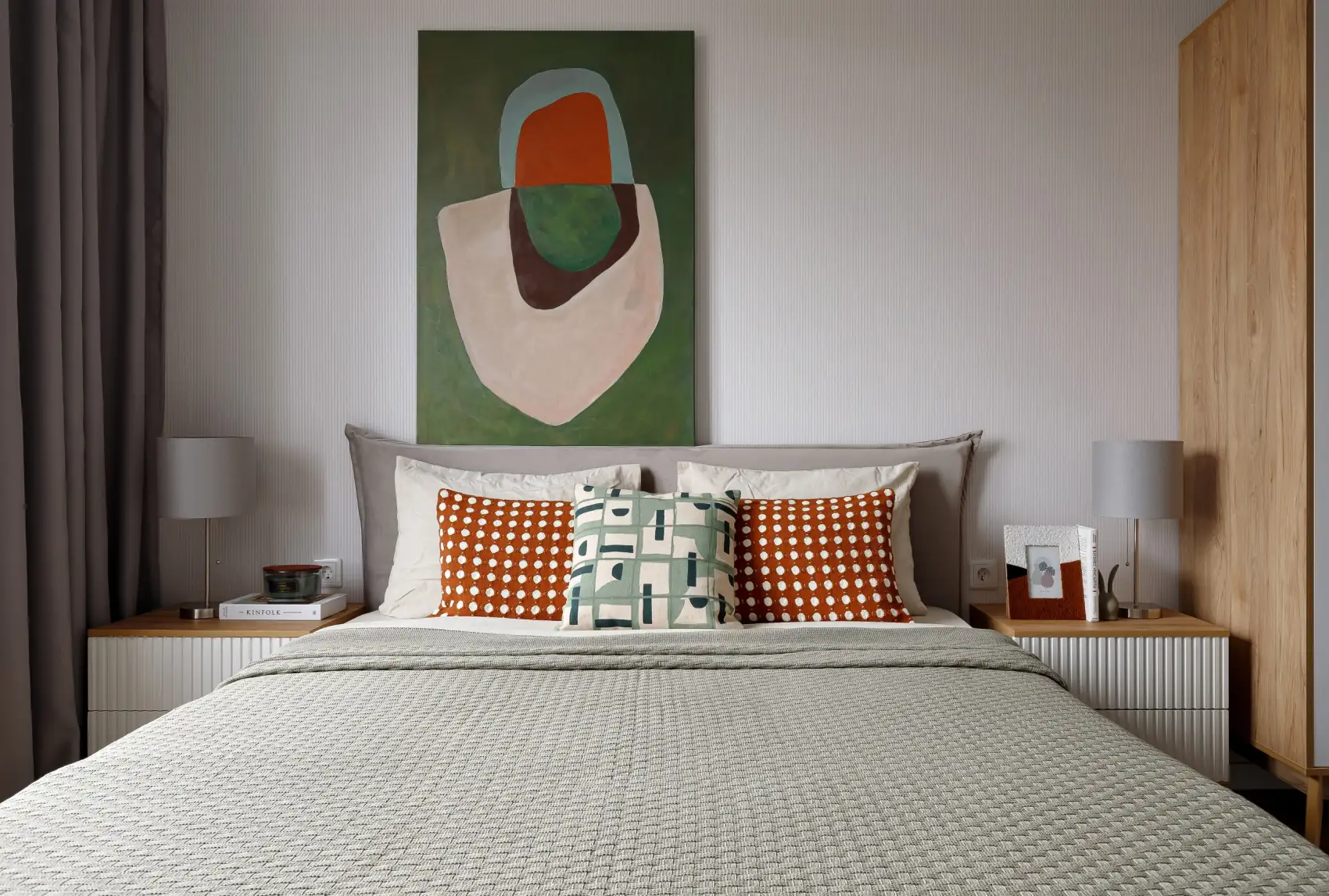 E hálószoba koncepciójának alapja a természetes textúrák, a mély árnyalatok és az átgondolt részletek finom ötvözete. A grafikus mintájú díszpárnák és a természetes anyagok használata a harmónia és a pihenés érzetét keltik. Egy egyedi absztrakt festmény fogja össze az enteriőr színpalettáját, egységessé és befejezetté téve a teret. Különleges atmoszférát teremt az olívafa – természetes melegséggel tölti meg a szobát, térhatást növel, és vizuálisan kitölti a sarokelemeket. A világítást úgy tervezték meg, hogy kiemelje a felületek textúráját, és lágy, relaxáló fényt biztosítson. Az utolsó simítást a stílusos dekorációs elemek jelentik, amelyek szervesen simulnak bele a belső térbe.