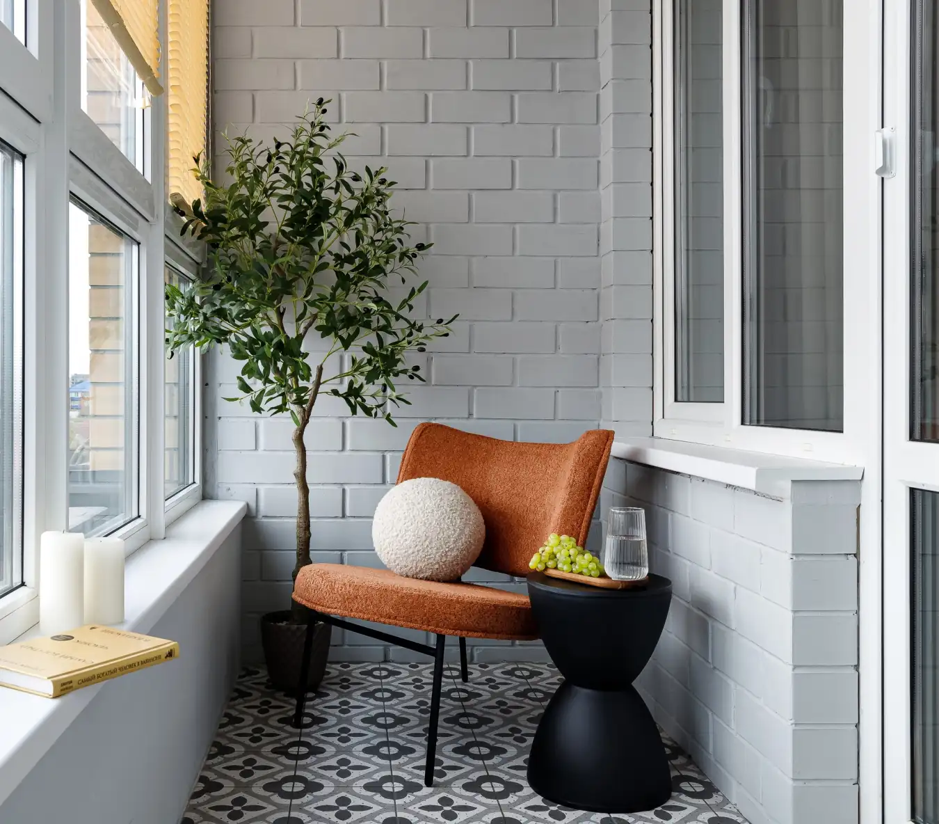 A lodzsa falán lévő világos tégla texturált hátteret biztosít, az itt elhelyezett olívafa pedig természetes melegséget és frissességet kölcsönöz a térnek. Fókuszpontként egy terrakotta árnyalatú fotelt választottak a tervezők, amely harmonikusan illeszkedik a semleges burkolatokhoz, és kifejezővé teszi a teraszt. A kompozíciót egy szokatlan formájú, letisztult fekete asztalka egészíti ki, egyensúlyt teremtve a könnyedség és a grafikus megjelenés között. A kerek bouclé párna, a gyertyák és az asztalon hagyott könyv igazán lakottá és hívogatóvá teszik ezt a kiegészítő teret.